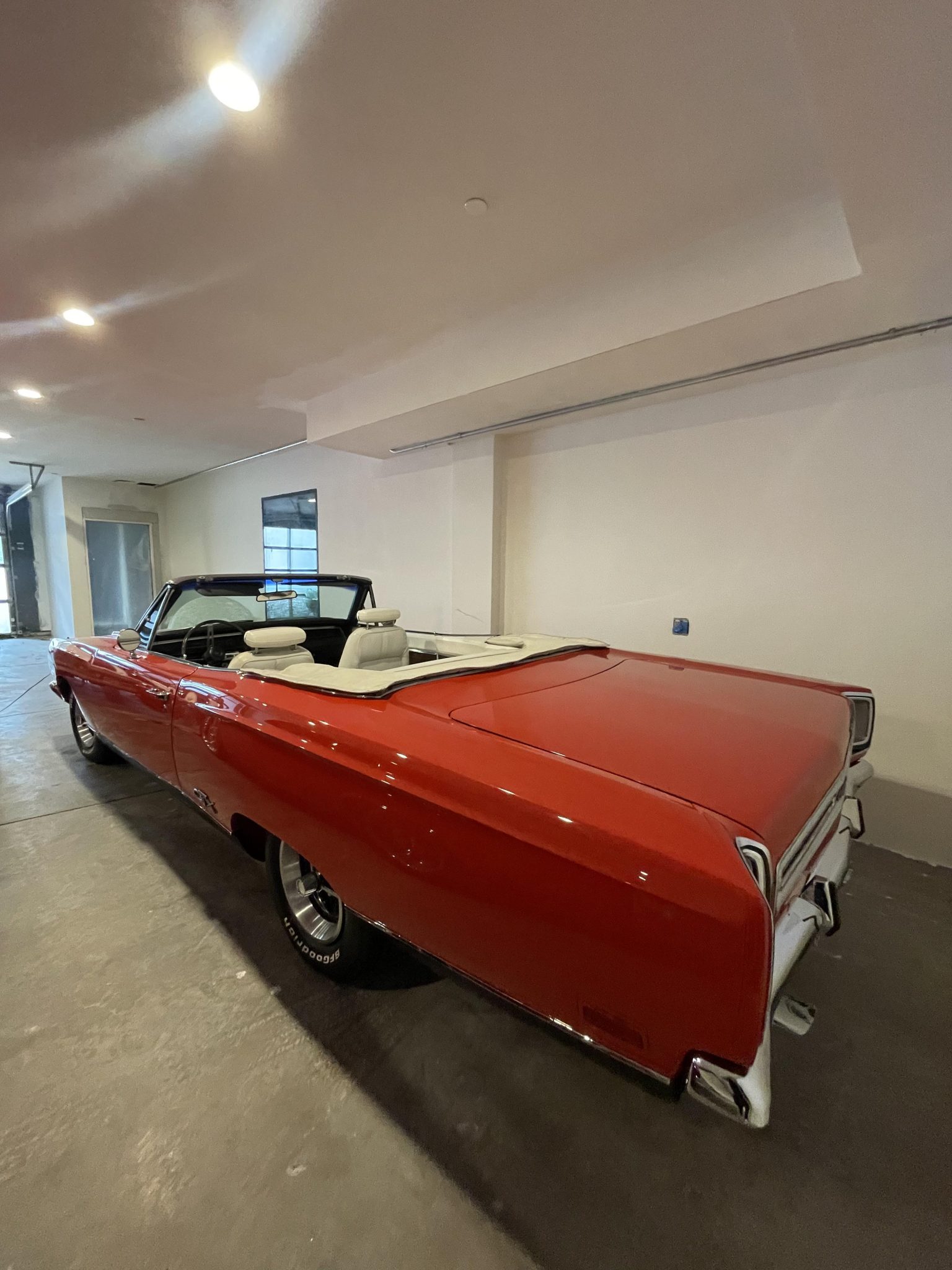Chromed 14″ steel road wheels are mounted with BFGoodrich Radial T/A tires. The car is equipped with power steering, and braking is provided by drums at each corner.