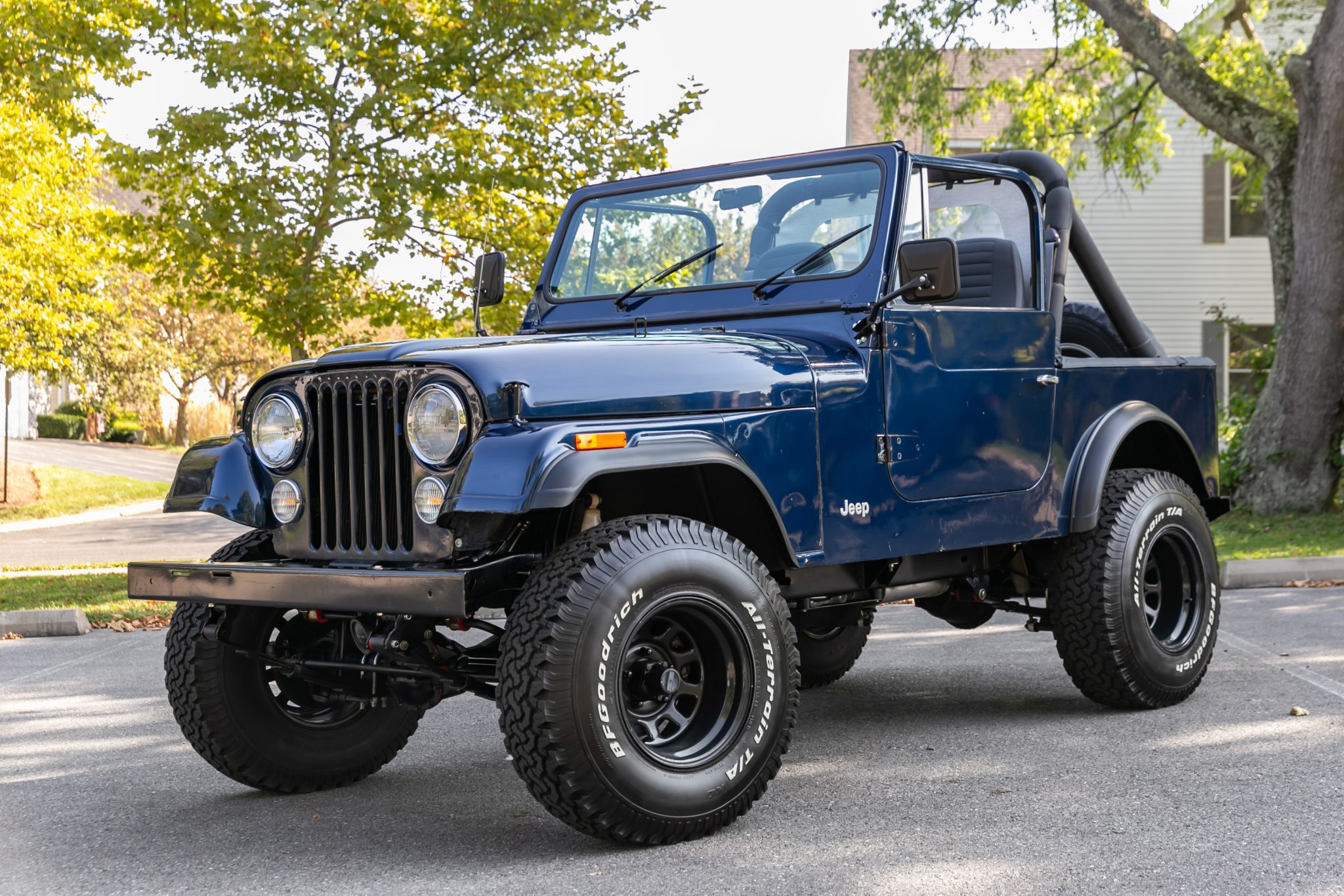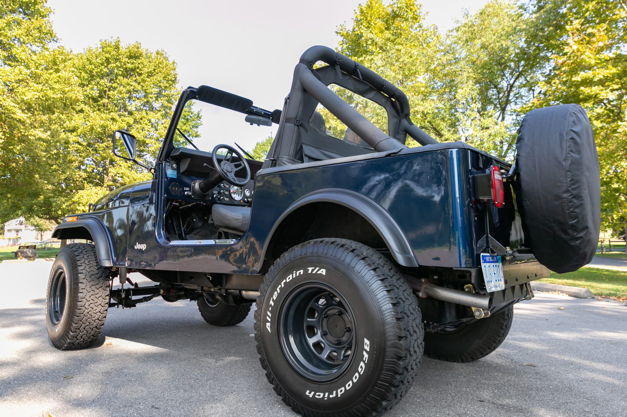 Black 15″ steel wheels are mounted with 33×10.5″ BFGoodrich All-Terrain KO tires, and a covered spare is affixed to the swing-away tire carrier. The Jeep is equipped with manually locking front hubs, power steering, a 4″ Rough Country suspension lift, and polyurethane suspension bushings. Work completed under current ownership involved replacing the steering box, steering shaft, and power steering pump in addition to the wheel cylinders, brake master cylinder, brake lines, and the front and rear brake pads, drums, and rotors.