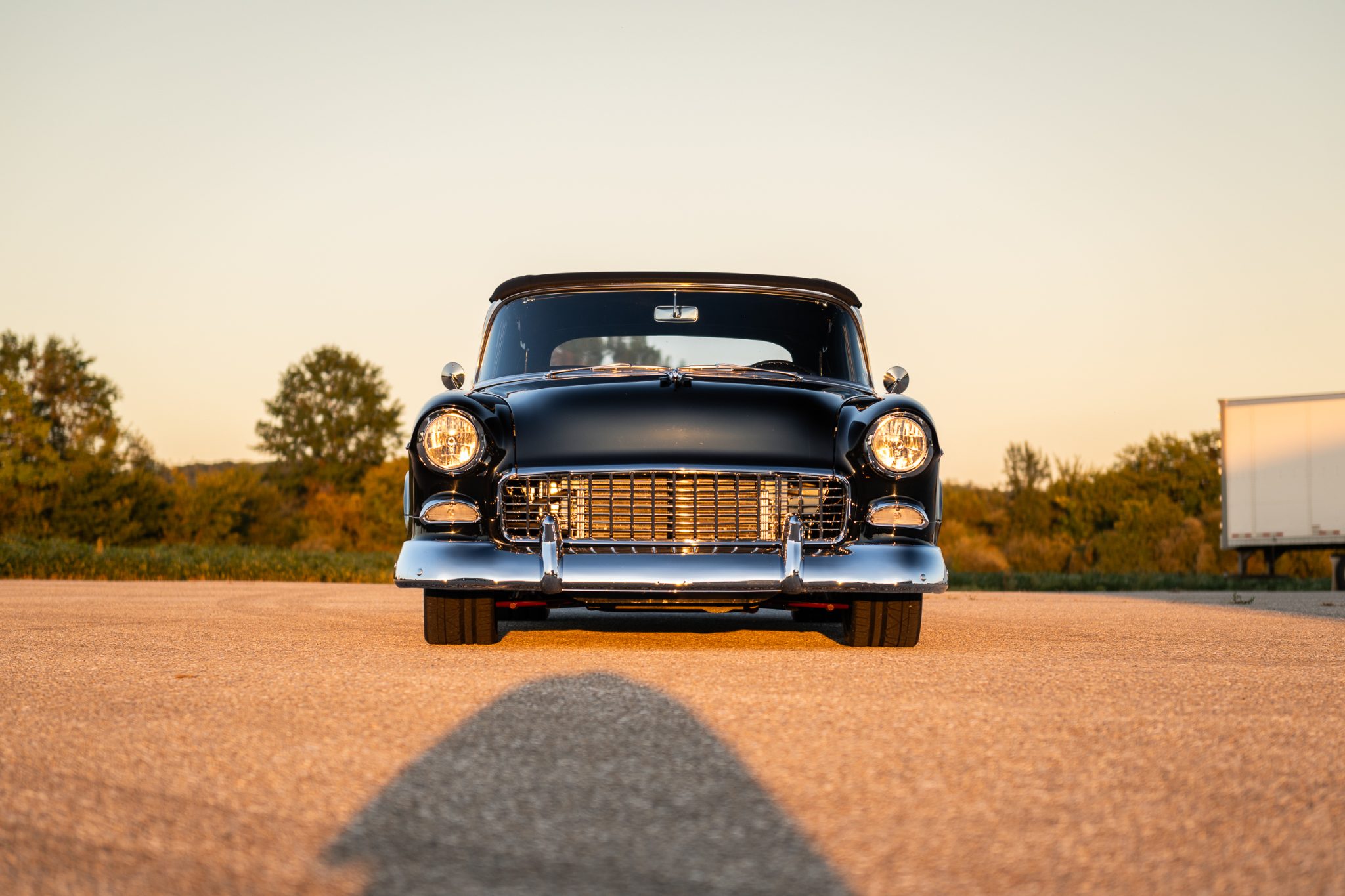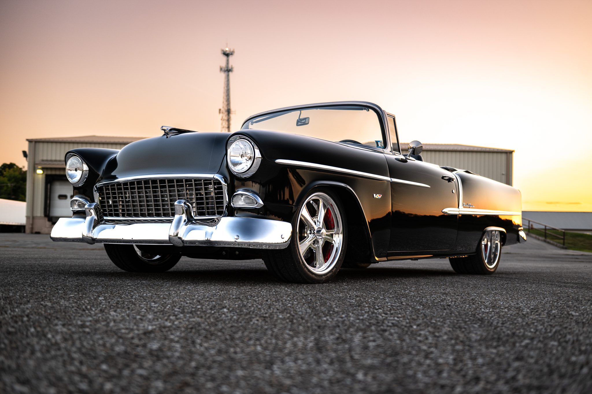 The car rides on an Art Morrison GT Sport chassis with tubular front control arms, a rear triangulated four-link setup, adjustable coilovers at all four corners, and power rack-and-pinion steering as well as Wilwood disc brakes with drilled and slotted rotors. The polished 18″ and 19″ Intro wheels are mounted with Nitto Invo tires measuring 245/40 and 345/30 in the front and rear respectively.