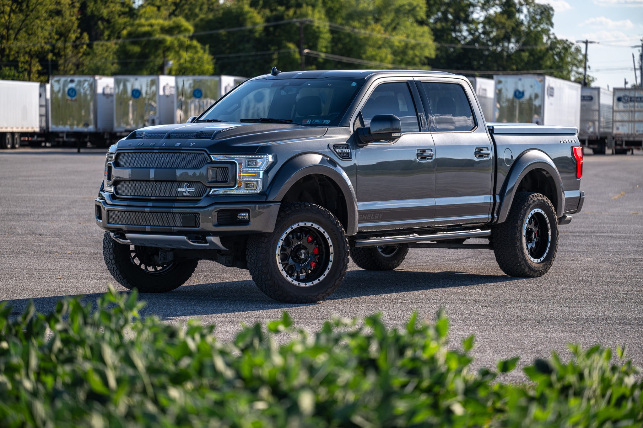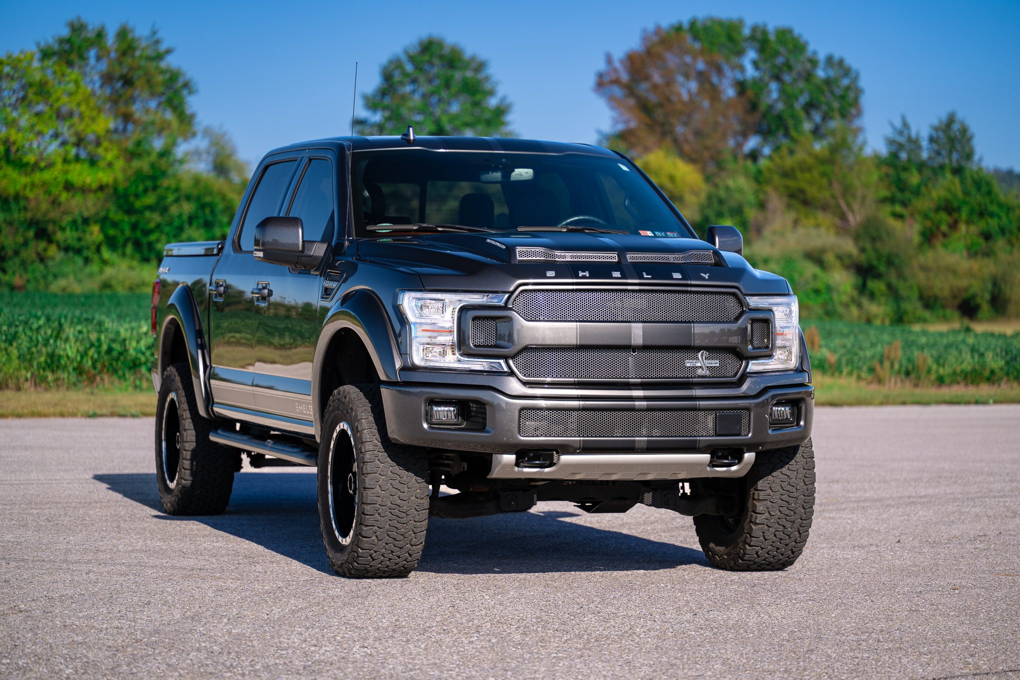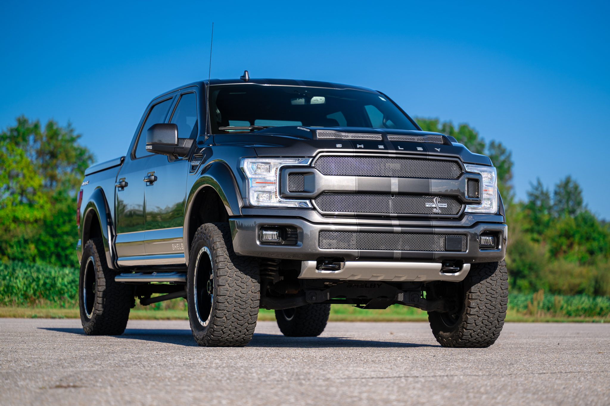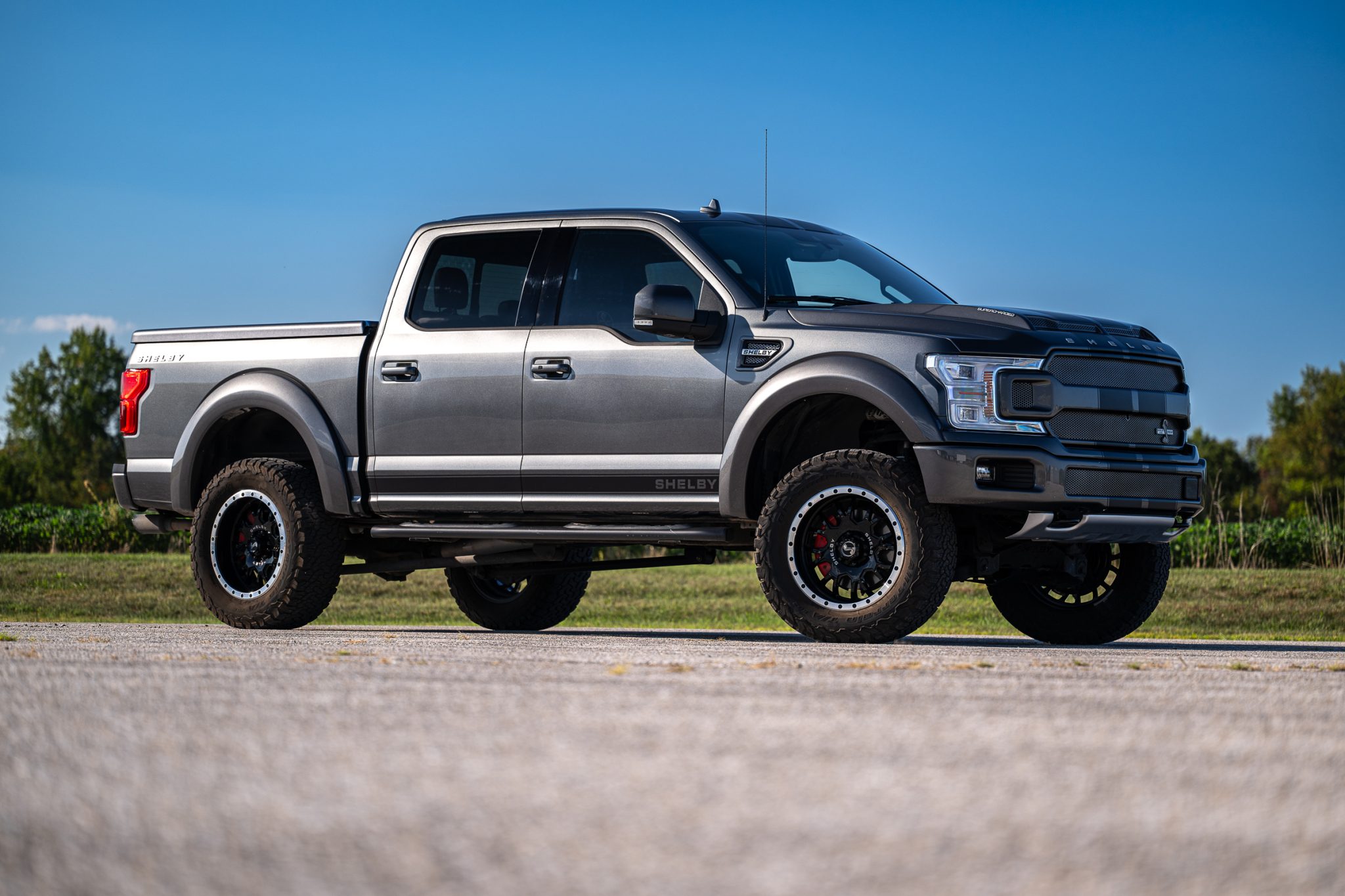 Shelby-branded 20″ wheels with beadlock-style lips are mounted with 35×12.50″ BFGoodrich All-Terrain T/A KO2 tires. The truck rides on adjustable Fox shock absorbers that were fitted as part of Shelby American’s BDS Suspension. Stopping power is provided by disc brakes with red Shelby-branded caliper covers at all four corners.