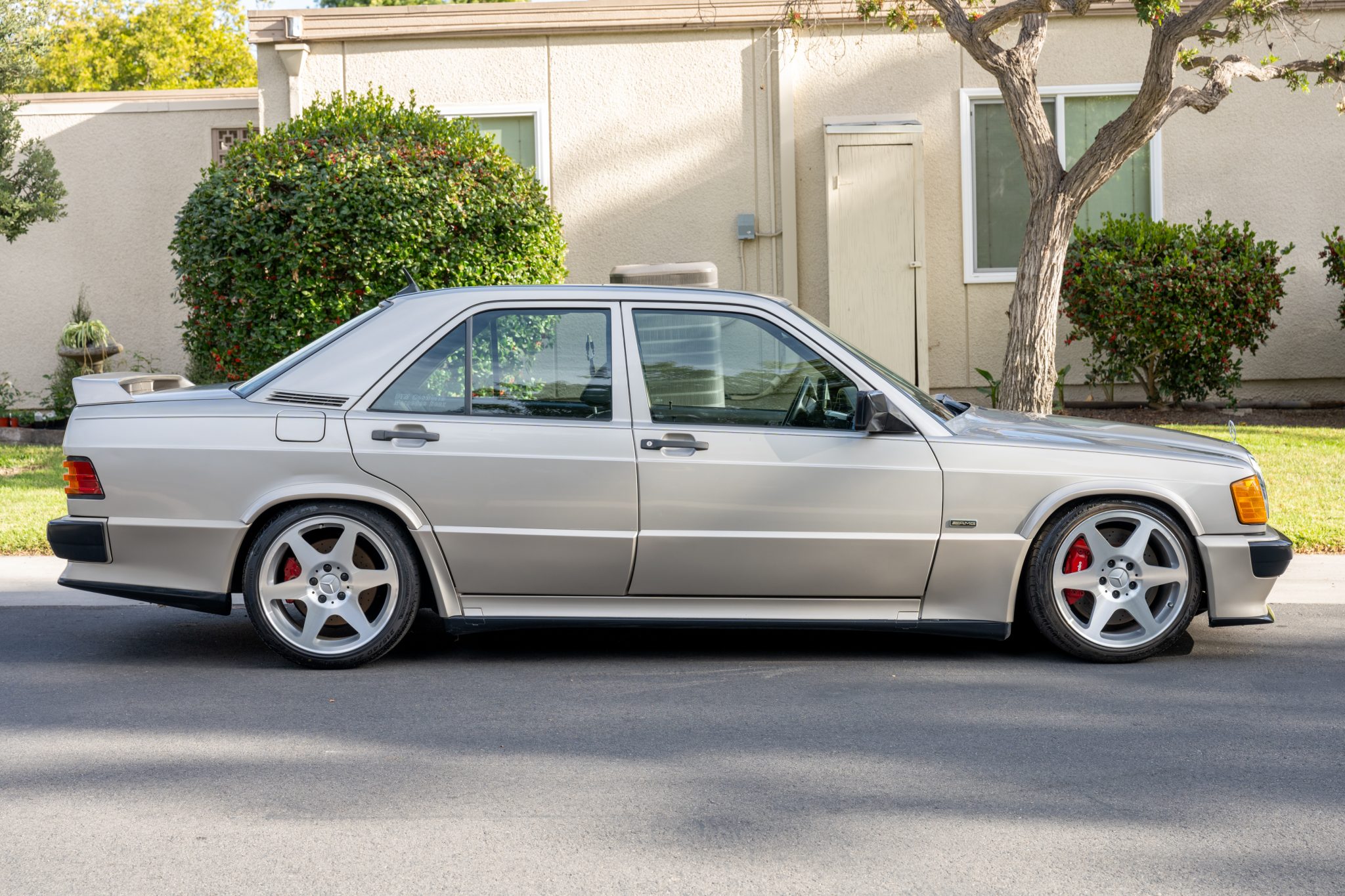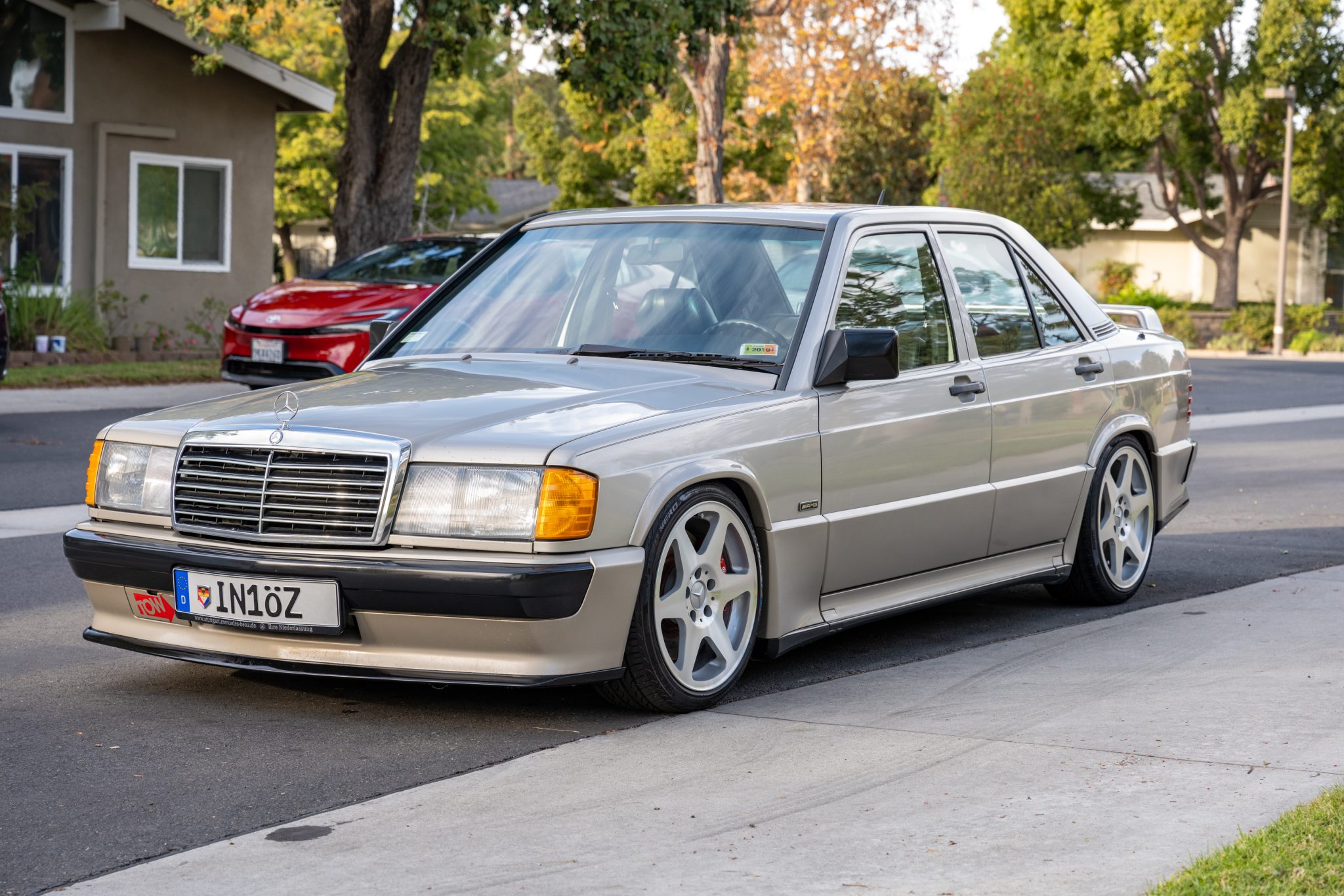 The 17″ Evo II alloy wheels are mounted with Pirelli P Zero tires. The car has been fitted with Koni lowering springs, aftermarket end links, Goodridge steel brake hoses, an EVO-sourced rear sway bar, and a 500E-sourced front sway bar. Per the seller, R129-sourced larger front control arms were fitted to accommodate the brake calipers and replacement rear lower control arms were shortened and welded by RDMTEK to offset negative camber. Braking is handled by four-wheel ventilated discs with ABS and red-finished calipers.