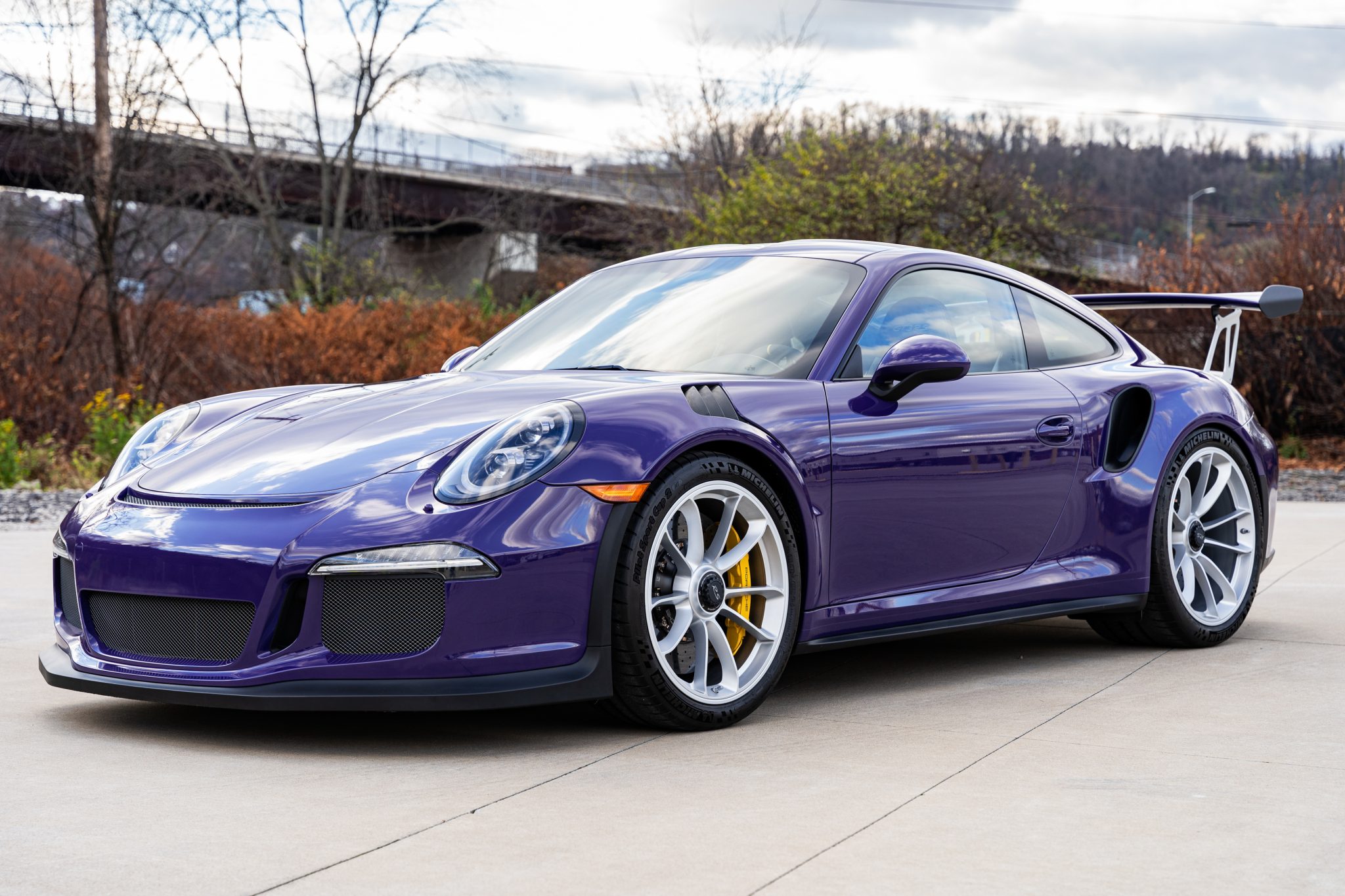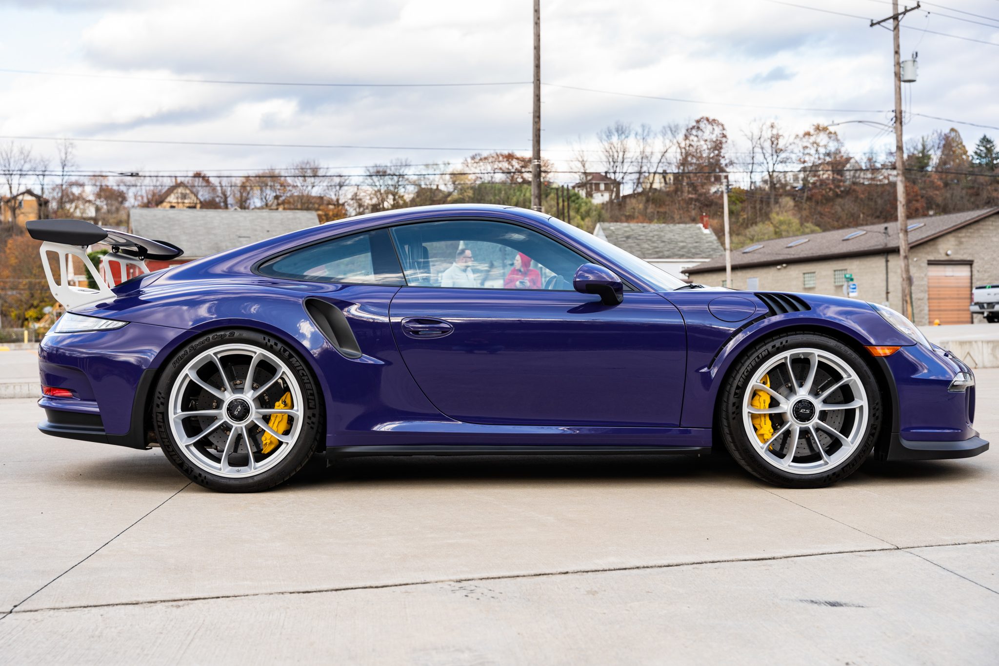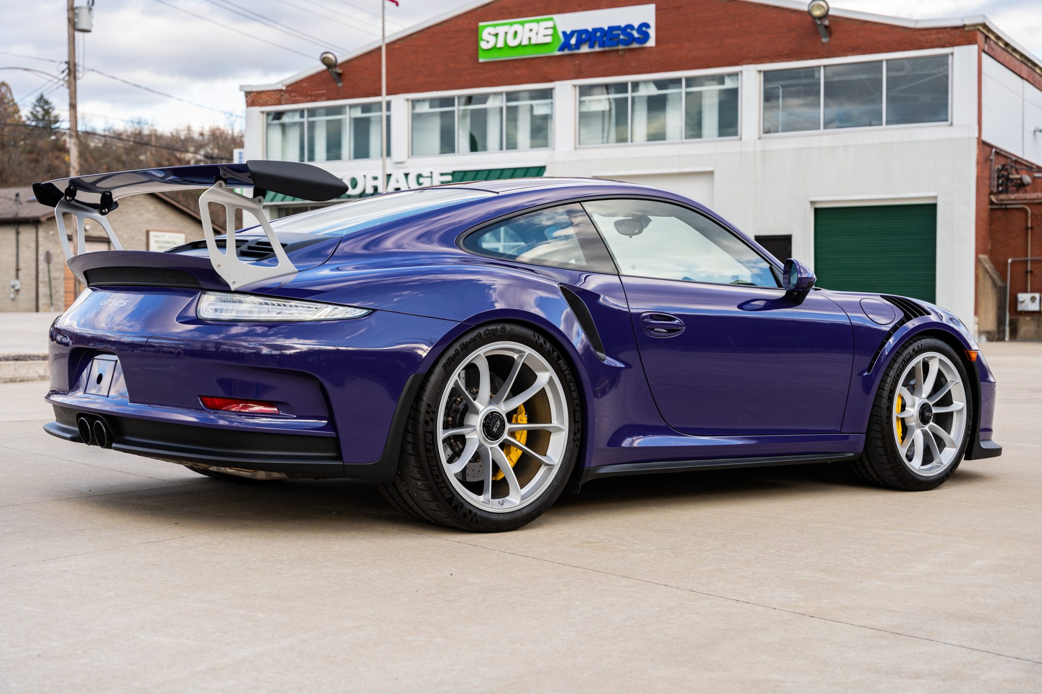 The 20″ front and 21″ rear center-lock alloy wheels are mounted with Michelin Pilot Sport Cup 2 tires. Braking is handled by yellow Porsche-branded calipers over cross-drilled and ventilated carbon-ceramic discs, and the car is equipped with a front-axle lift system. Standard GT3 RS equipment included rear-axle steering, Porsche Active Suspension Management, and Porsche Torque Vectoring Plus.