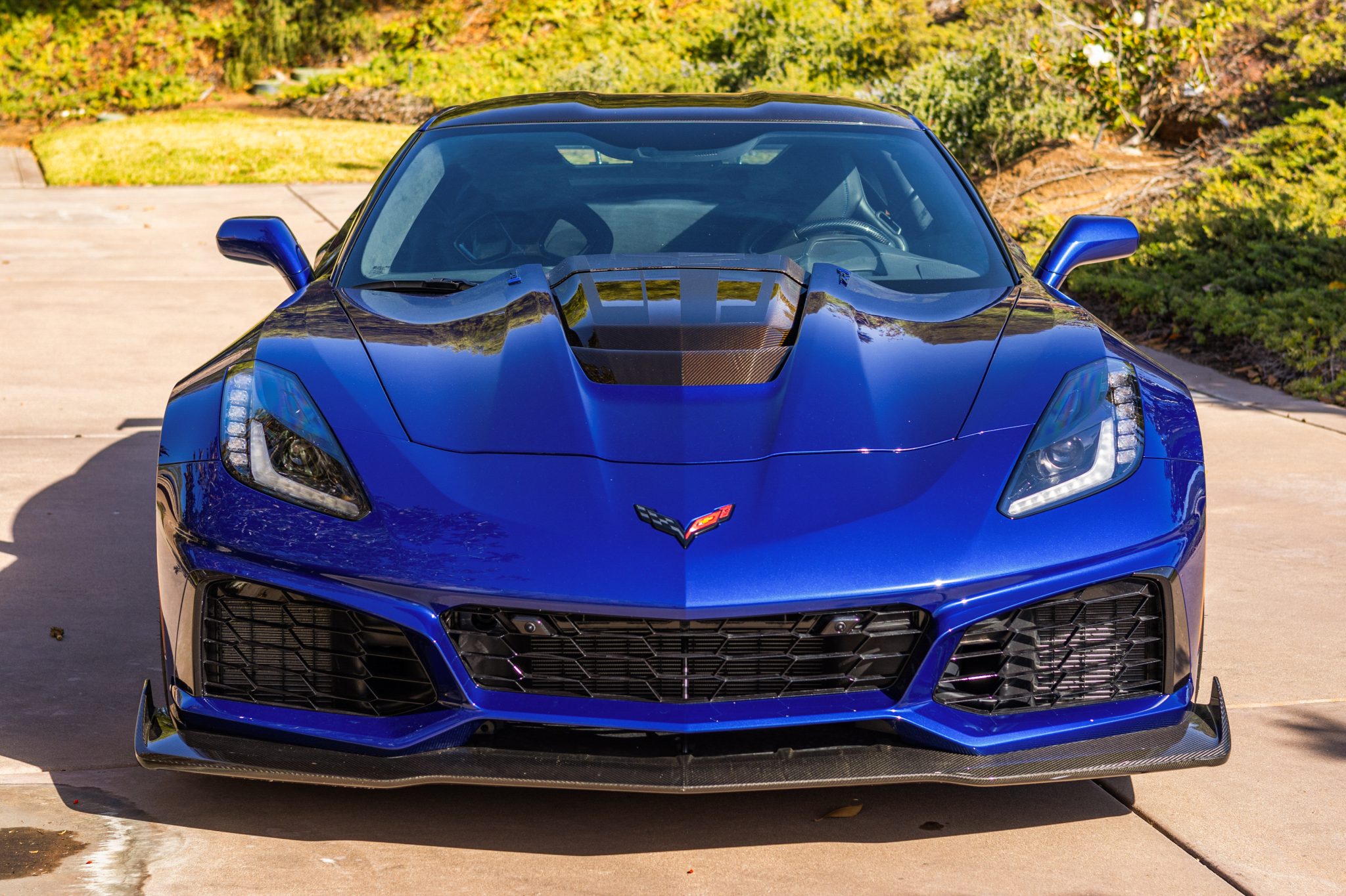 Staggered-diameter Carbon Flash 19″ and 20″ 10-spoke wheels are mounted with Michelin Pilot Sport Cup 2 tires measuring 285/30 front and 335/25 rear. The car is equipped with Magnetic Ride Control and a ZR1 performance suspension. Stopping power is provided by cross-drilled carbon-ceramic discs with blue-finished Brembo calipers at each corner.