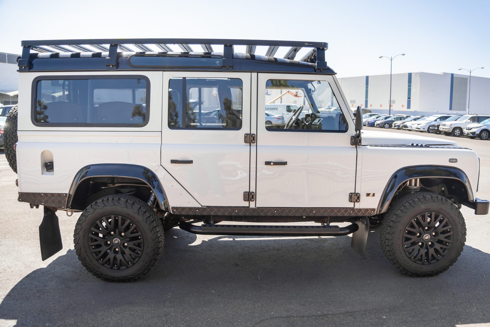 Black-finished 18″ Kahn wheels with Land Rover–branded center caps are mounted with 265/65 BFGoodrich All-Terrain T/A KO2 tires, and a matching spare is mounted to a swing-away carrier out back. Fox shocks are installed, and stopping power is from slotted disc brakes at all four corners.