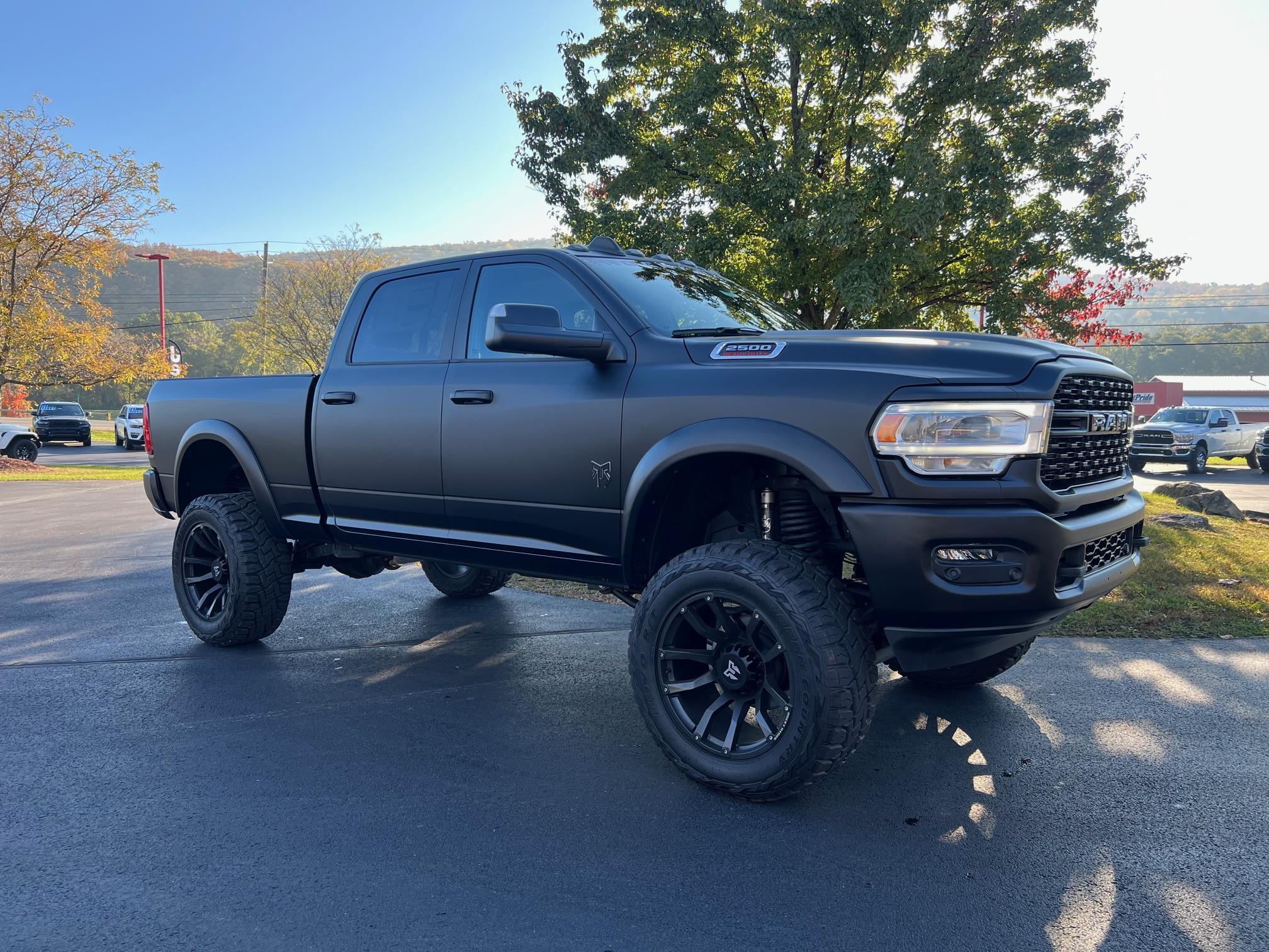 The 22″ Rocky Ridge wheels are wrapped in 37×13.50″ Toyo R/T Open Country tires, and a 5″ suspension lift system was added as part of the Rocky Ridge K2 package. The truck is equipped with electronic roll mitigation, an automatic-leveling rear suspension, trailer sway damping, and a trailer brake controller.