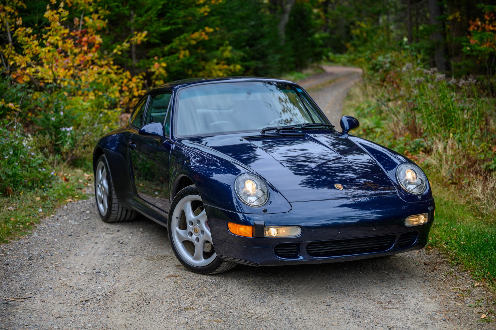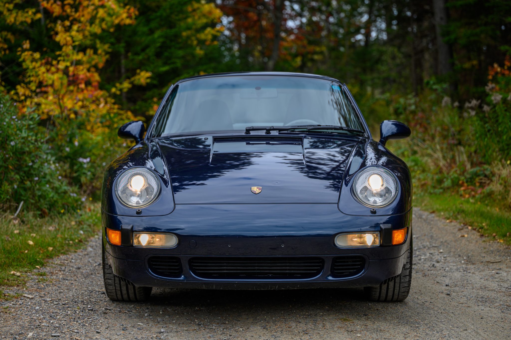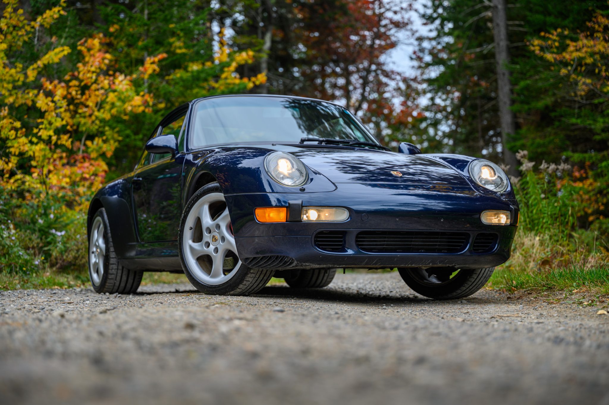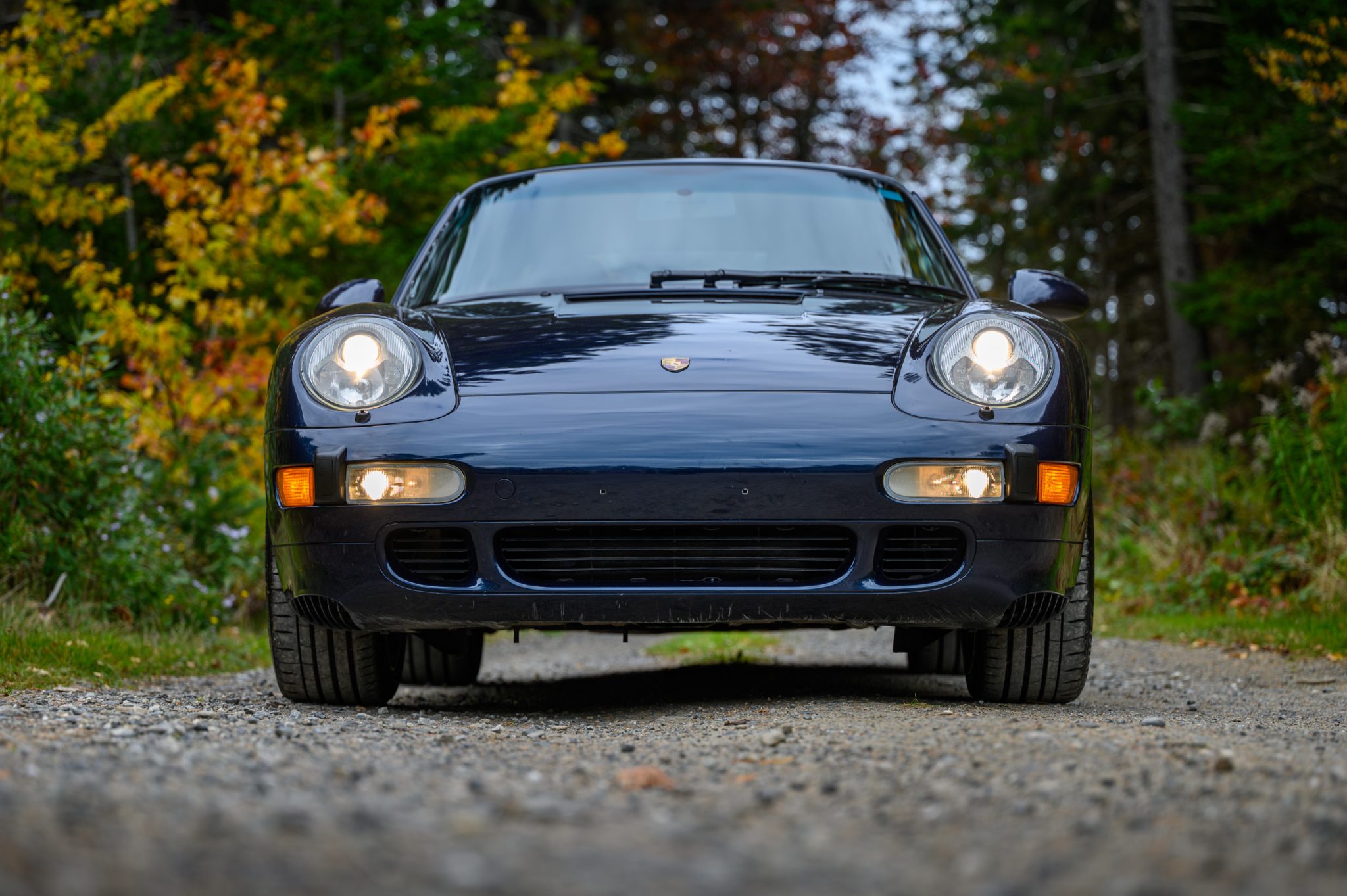 The 18″ Turbo Twist wheels are mounted with Continental ExtremeContact Sport 02 tires that were replaced in June 2024. The car features an Automatic Brake Differential (ABD), and the 993 was the first 911 to feature multi-link rear suspension. Braking is handled by red-finished Porsche-branded calipers over cross-drilled rotors at all four corners. Service completed under current ownership includes replacing the front control arm bushings in October 2012, the passenger-front wheel bearing in October 2013, and the rear struts in October 2018 as well as the steering rack assembly, inner and outer tie rods, and front sway bar end links in June 2024. Blemishes are visible on the wheel faces.