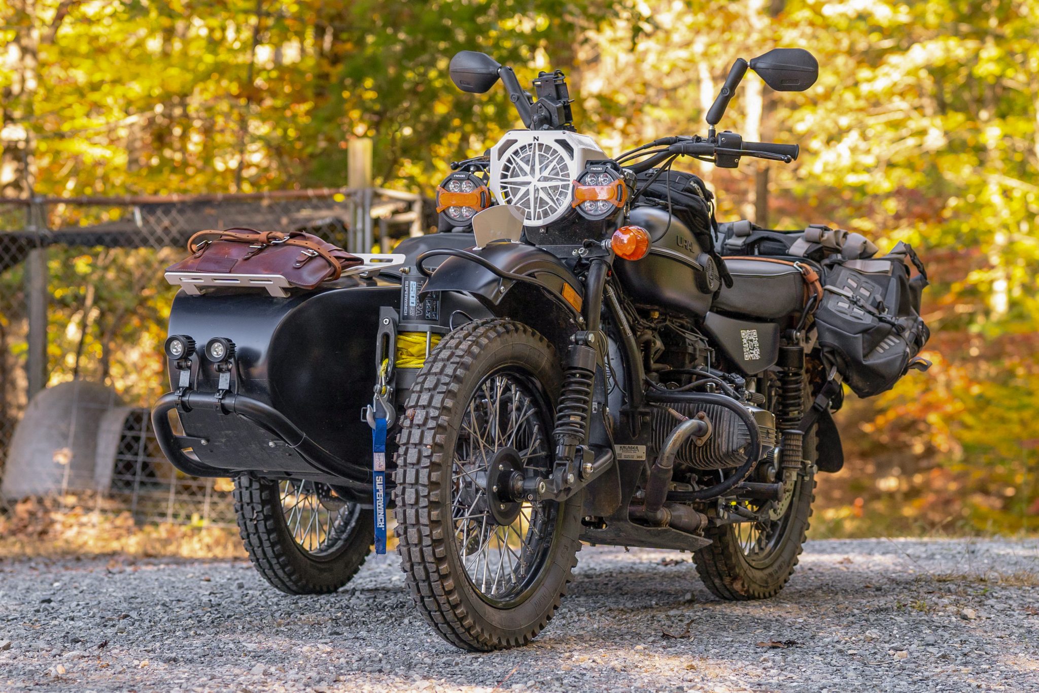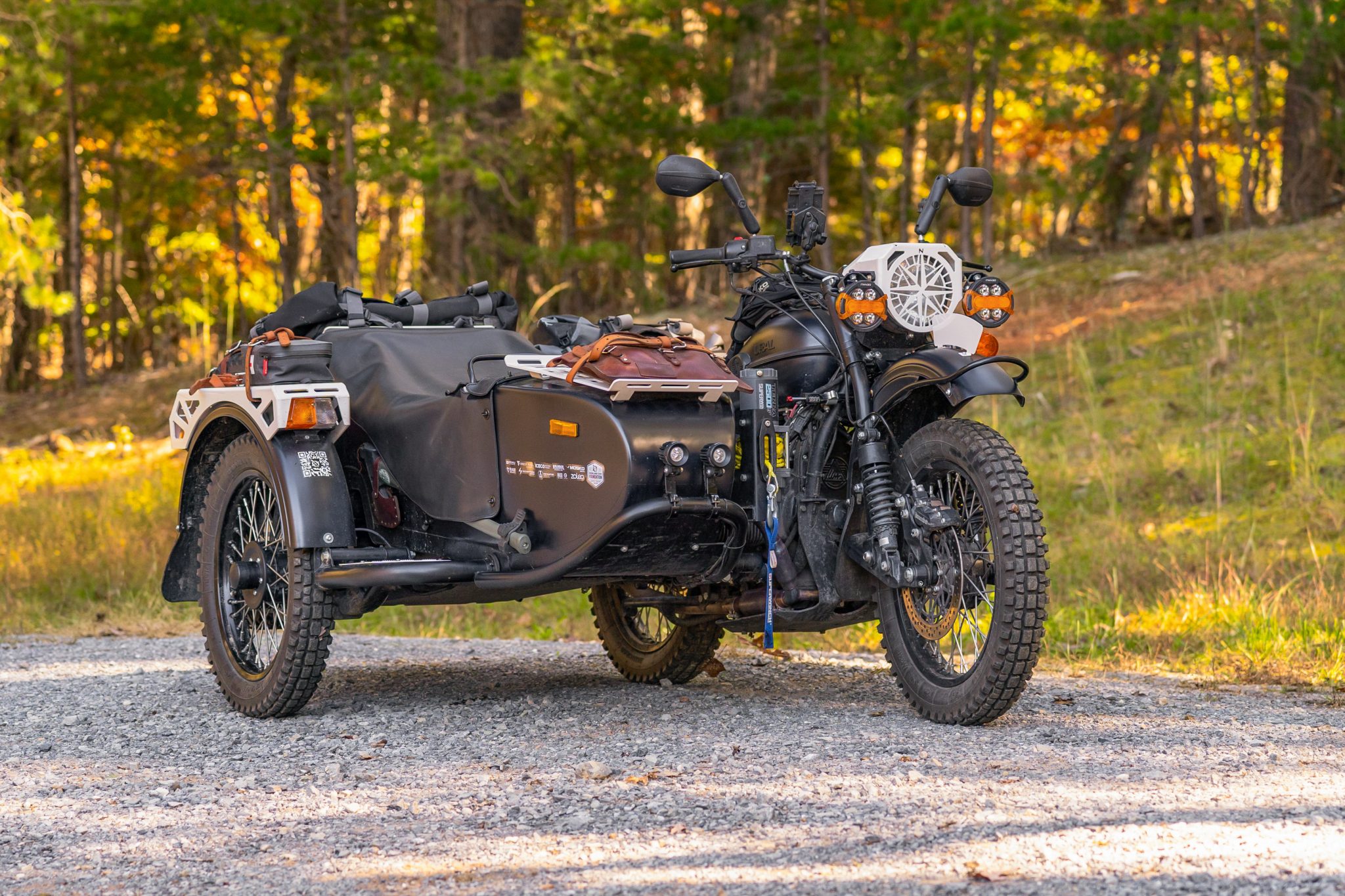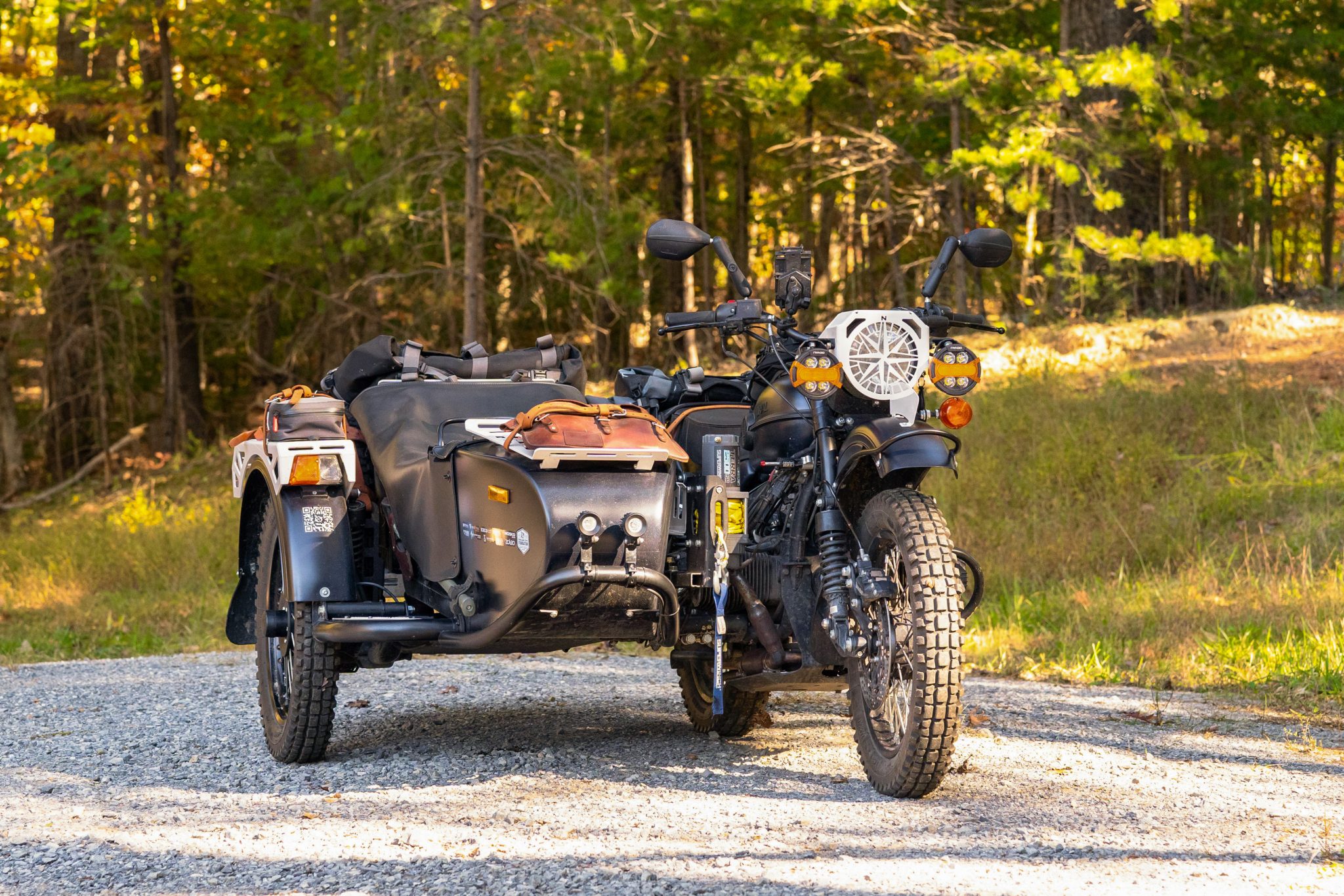 Accessories include a white powder-coated Kalaber rear rack as well as a Mosko Moto Reckless 80L rackless luggage system, a Gnome tank bag, and a Backcountry 40L duffle. A Kalaber Gen 3 winch mount bar attached to the main frame between the bike and the sidecar anchors a Superwinch Terra 2500 with a 1.5-horsepower permanent magnetic motor and a 2,500-lb pull capacity. Lighting is supplemented by a pair of Denali D7 Pro 4″ multi-beam driving light pods that provide over 23k lumens and a multi-color daytime running light (DRL) mode.