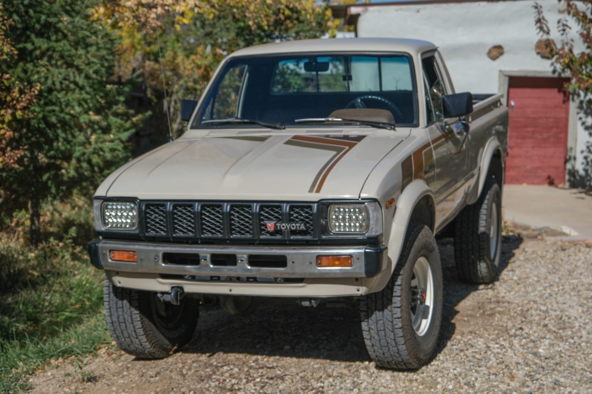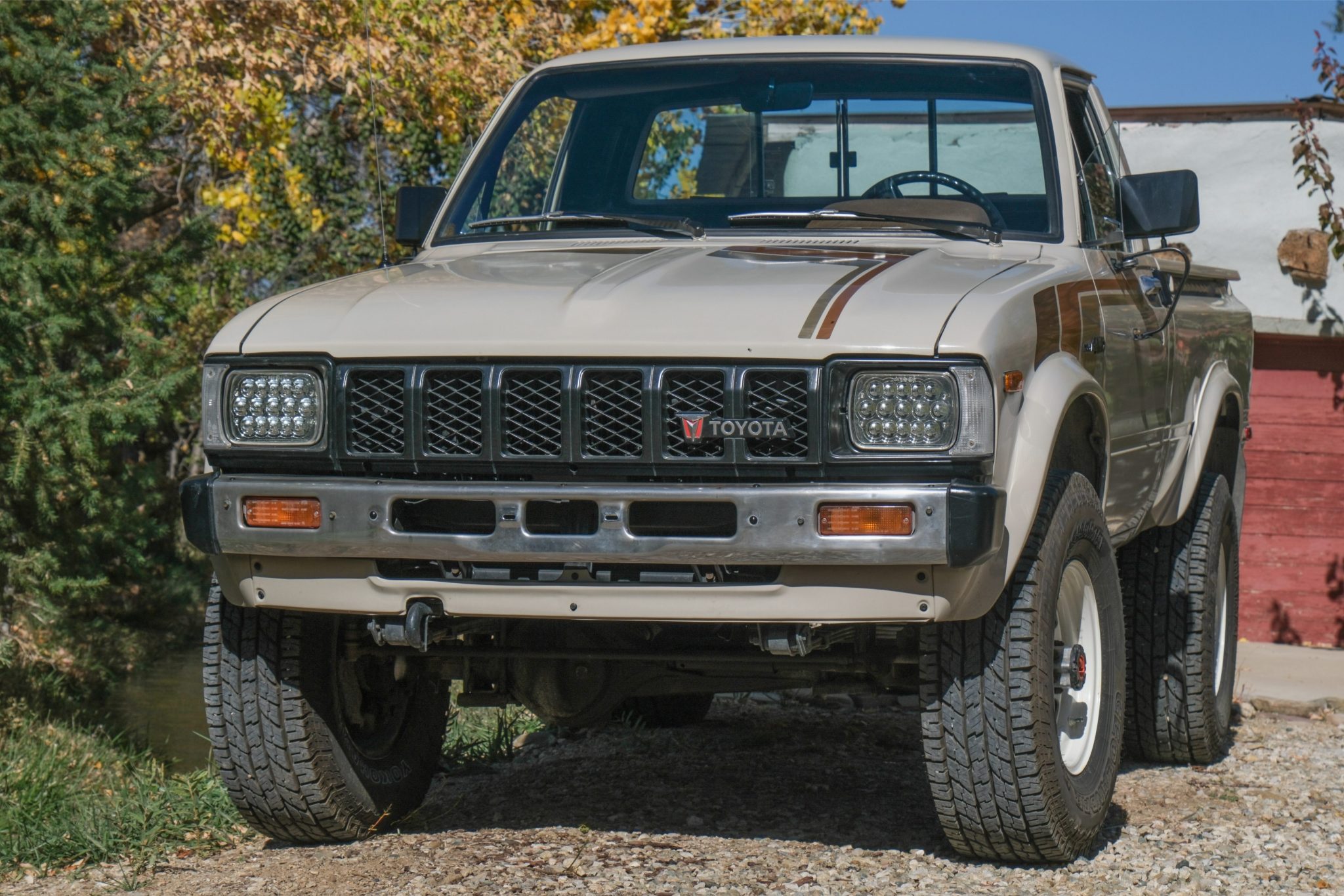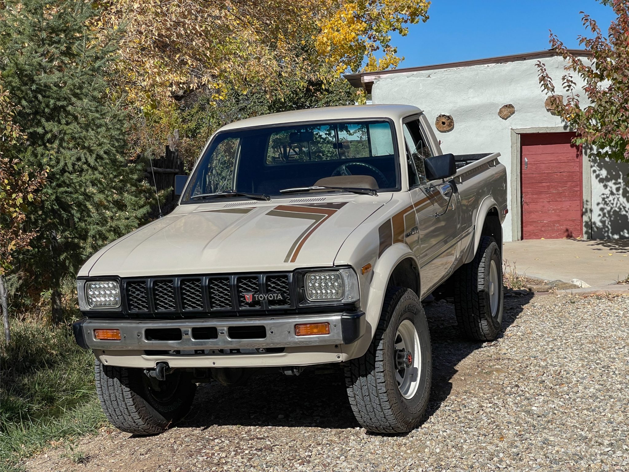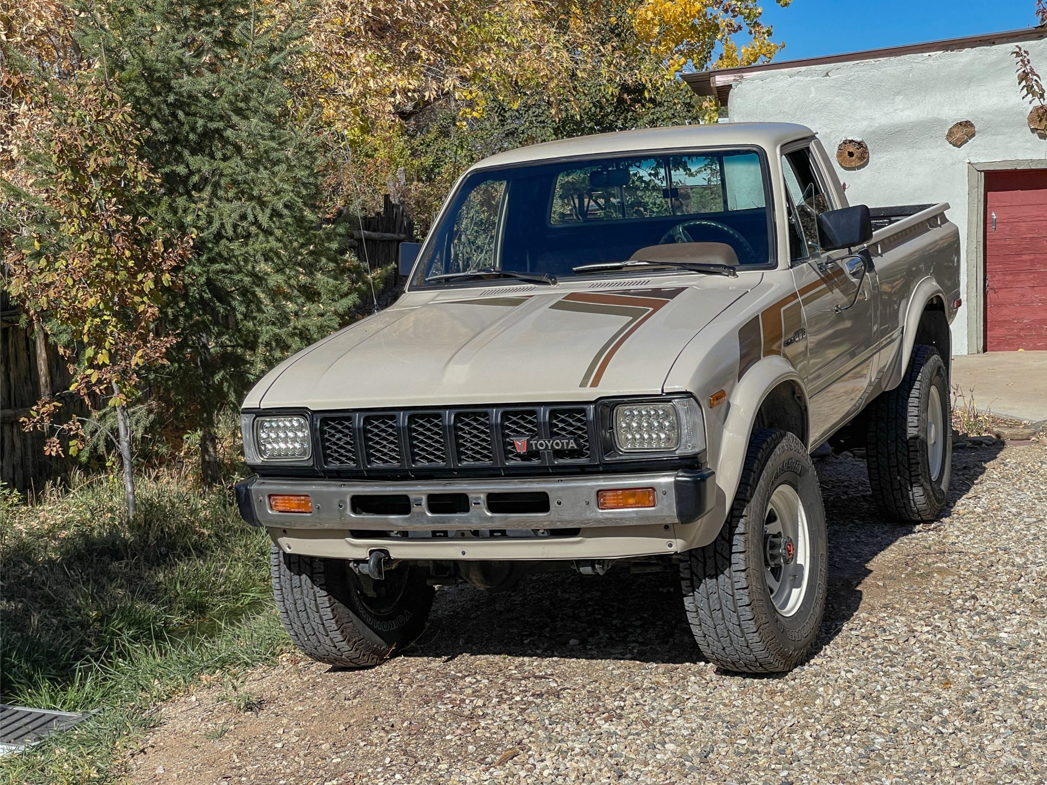 White 15″ steel wheels were mounted with 31×10.5″ Yokohama Geolandar A/T G015 tires in April 2024. The truck is equipped with manually locking front hubs and a 3″ suspension lift. Braking is handled by front discs and rear drums.