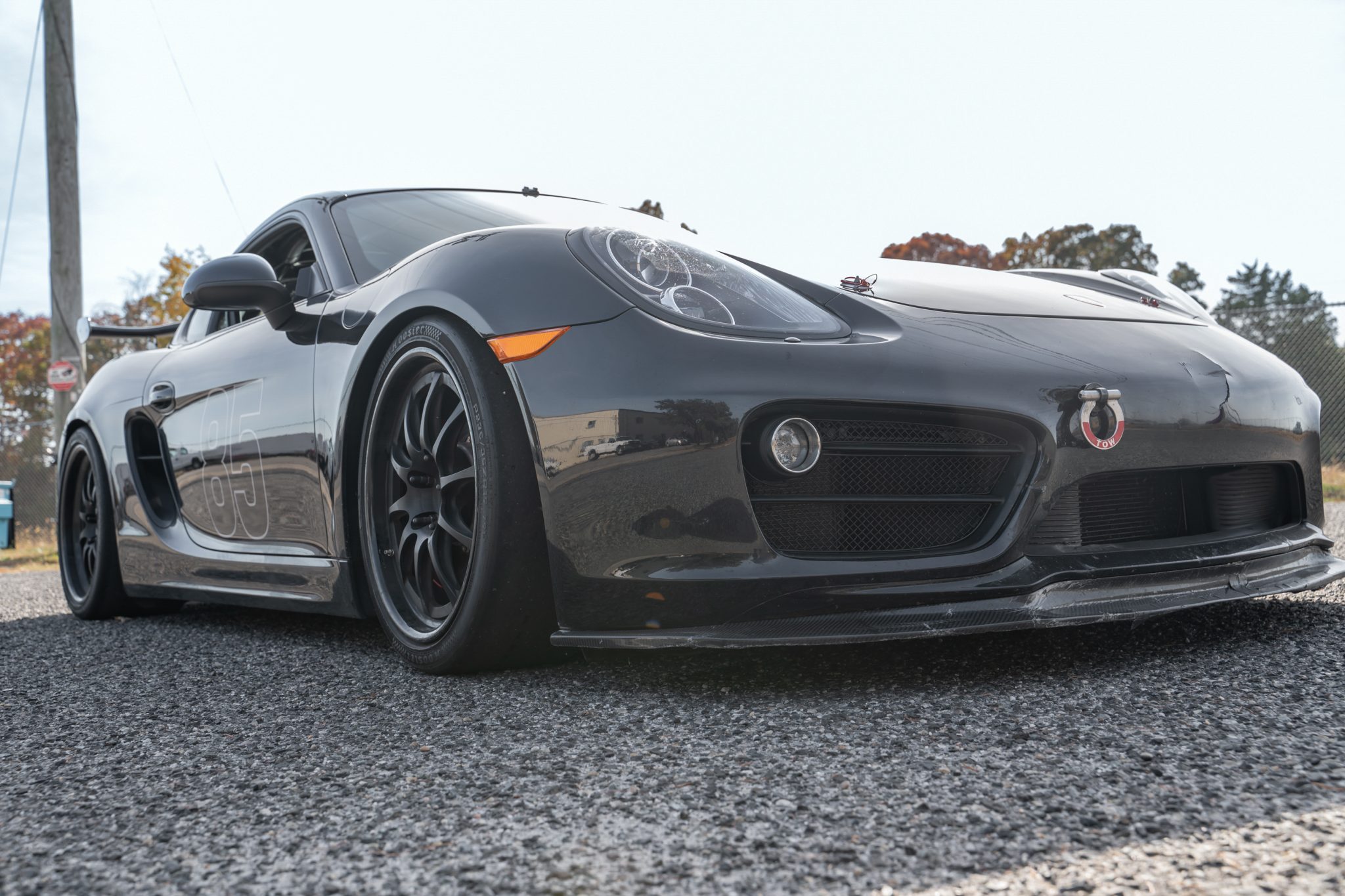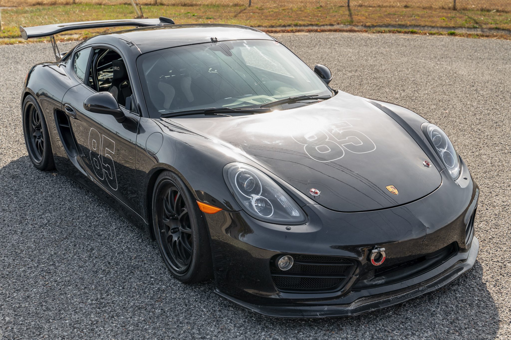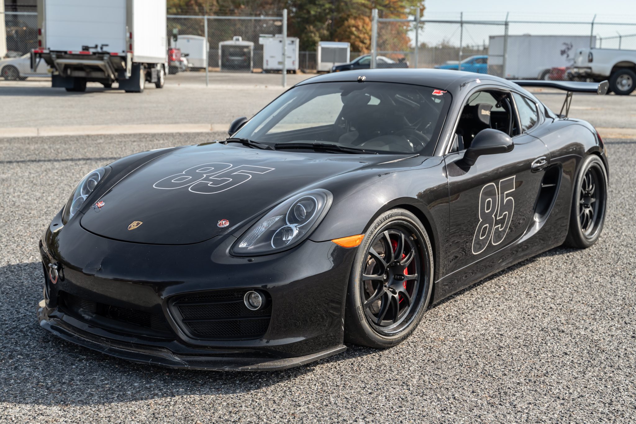 The Forgeline wheels measure 19×9 and 19×10.5 front and rear, and the Hoosier tires were mounted in 2023. The car rides on double-adjustable MCS dampers, adjustable camber plates, and aftermarket sway bars and also has 911S-specification front calipers, braided stainless-steel hoses, GiroDisc two-piece front rotors, and Pagid RS pads.