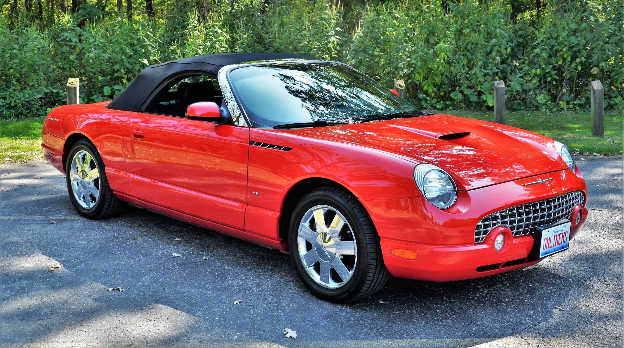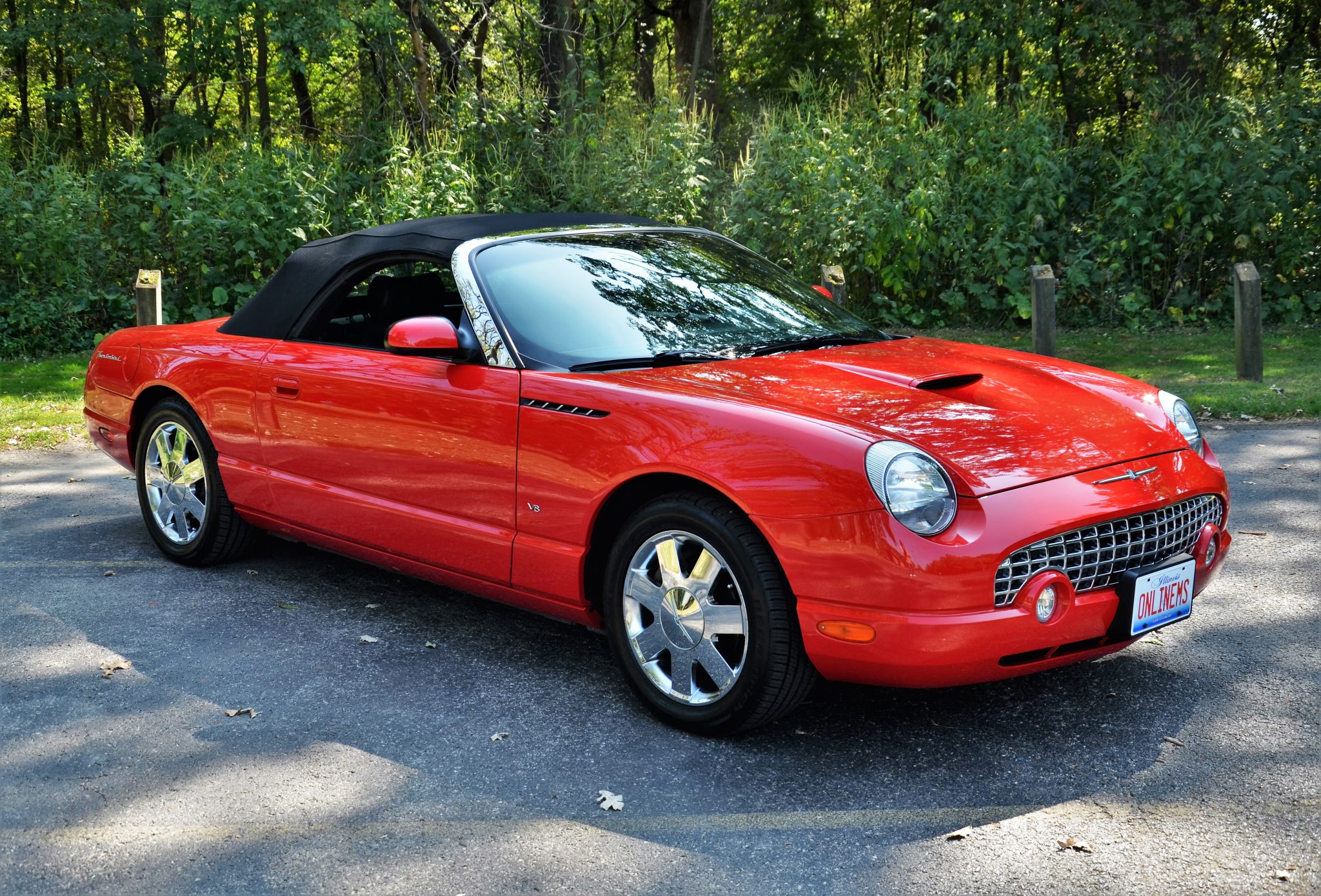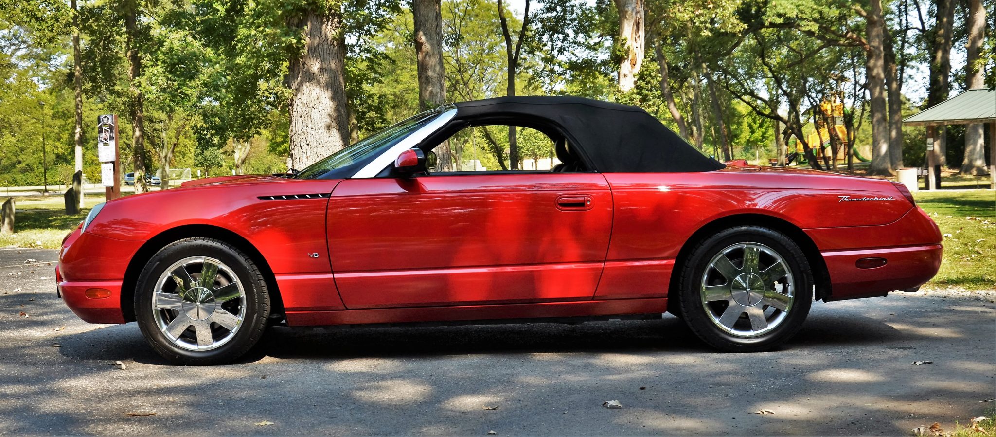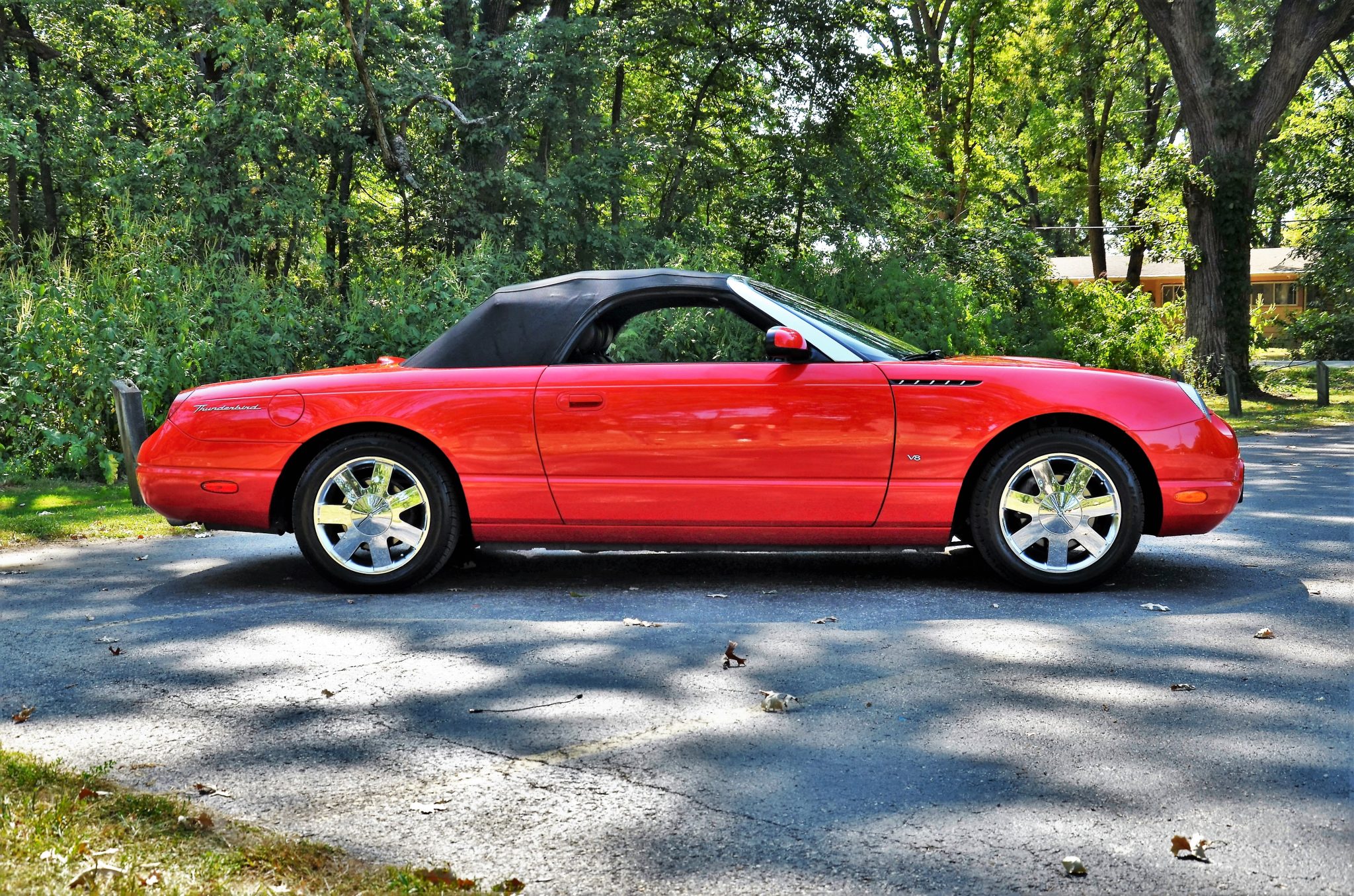 The 17″ seven-spoke chrome Premium wheels feature Thunderbird-branded center caps and are mounted with BFGoodrich Advantage Control tires, which show date codes from 2021. The car is equipped with four-wheel independent suspension and ventilated disc brakes. A wheel bearing was replaced in July 2024.