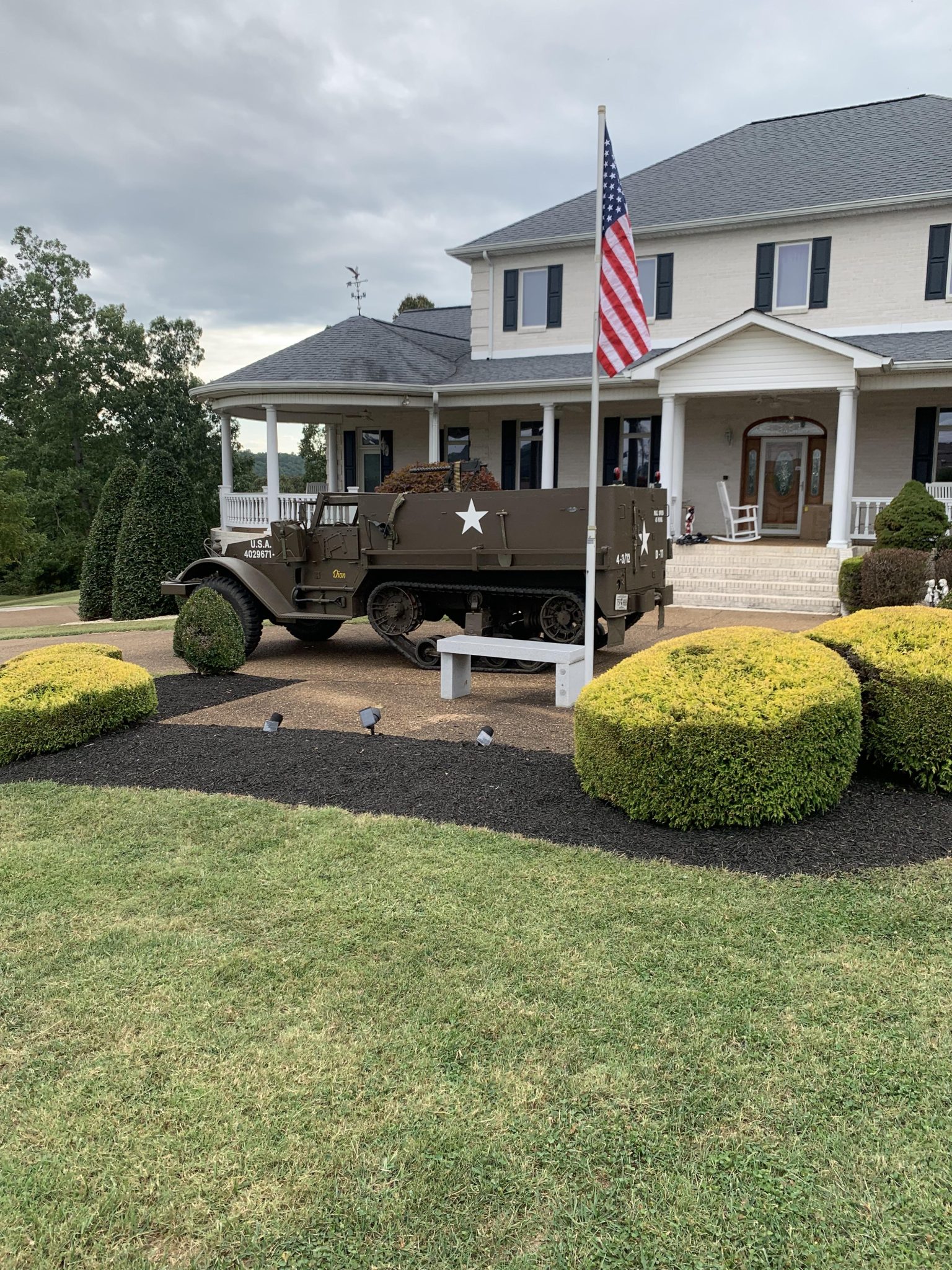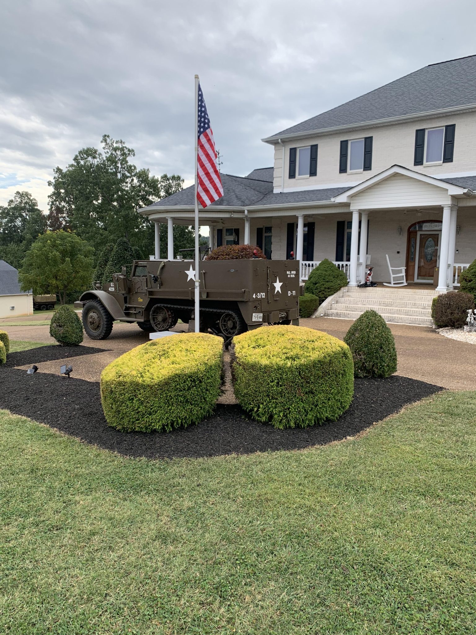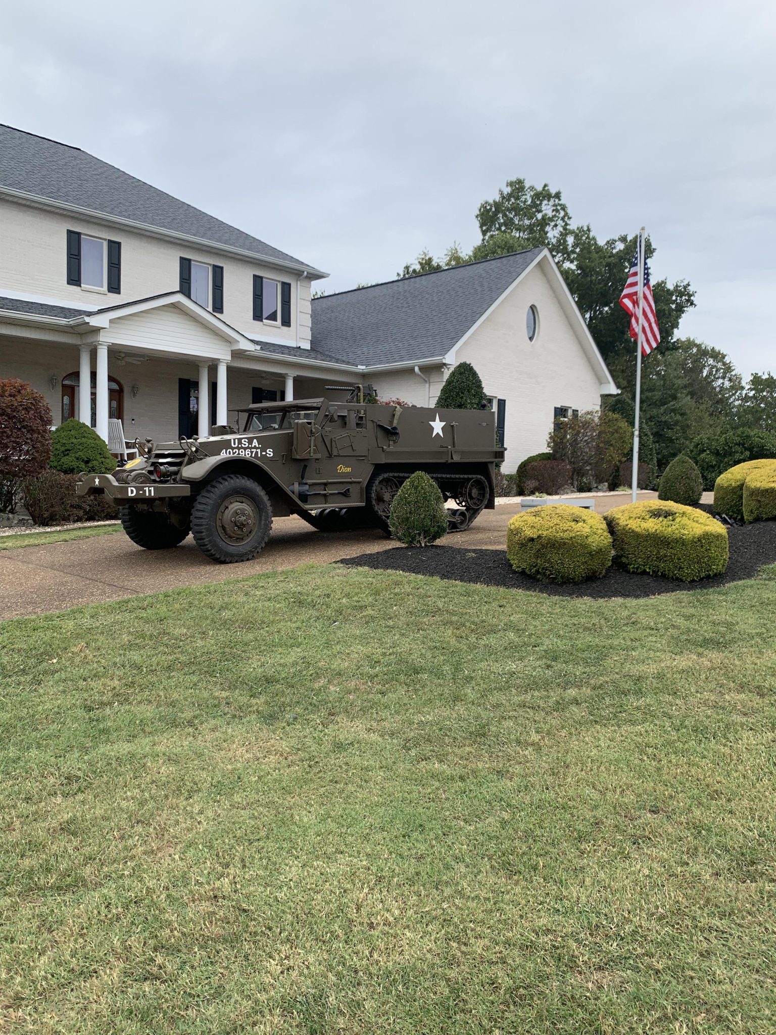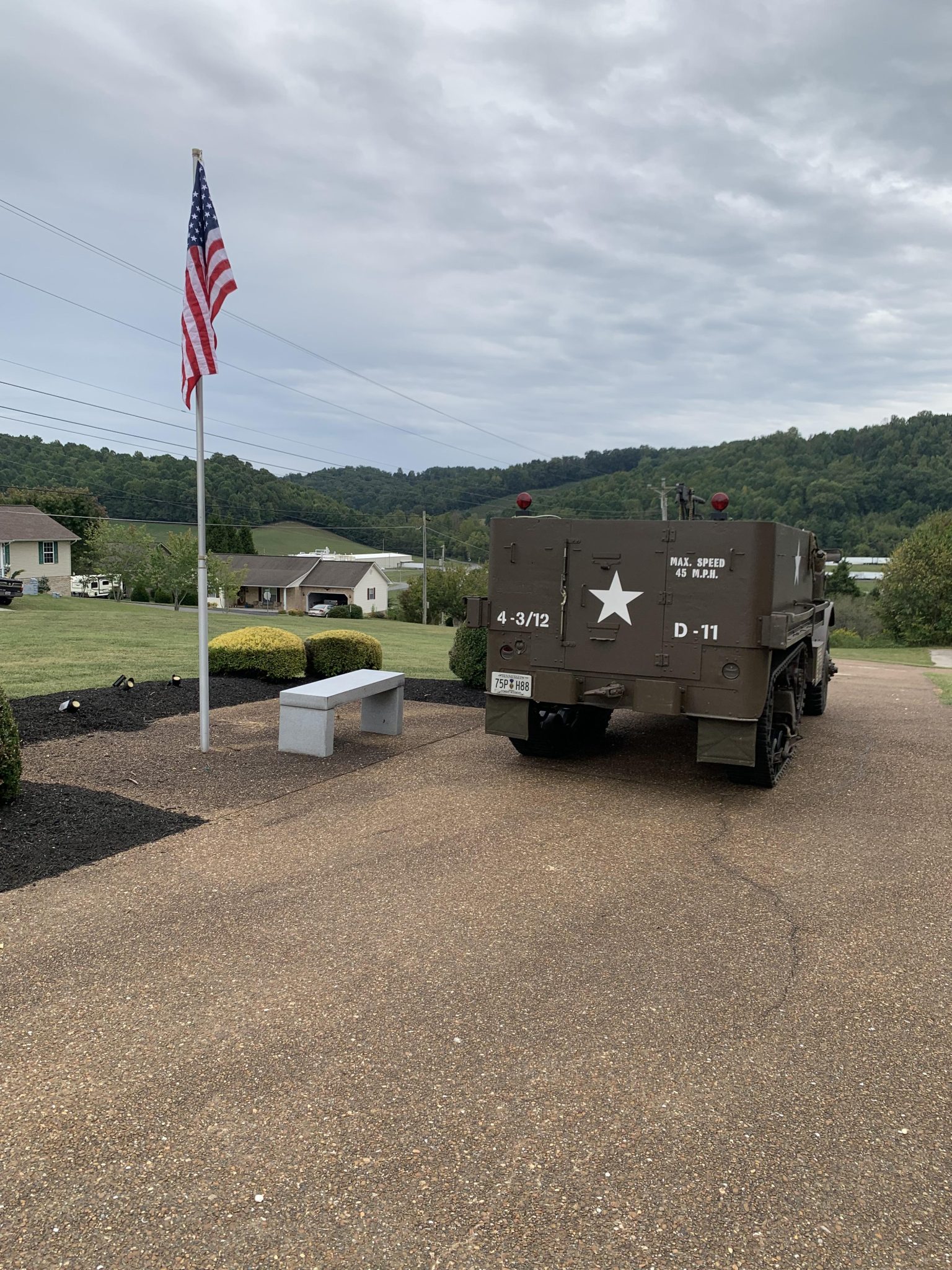 Multi-piece 20″ front steel wheels are mounted with 9.00-series Deestone M Master military-style tires, while each rear track drive is equipped with a front drive sprocket, four road wheels, a support roller, a compensating idler, and rubber-coated steel treads. The suspension features leaf springs up front and vertical volute springs out back. Braking is handled by hydraulically assisted drums.