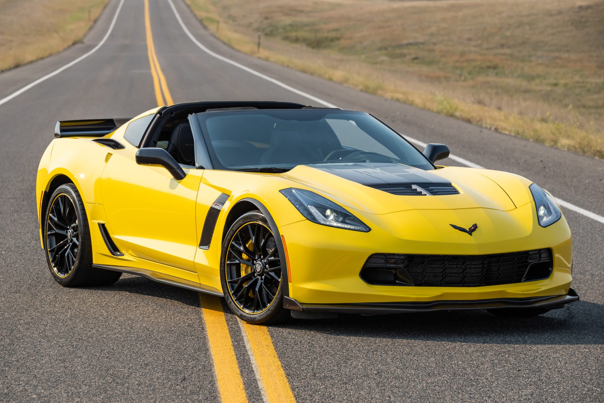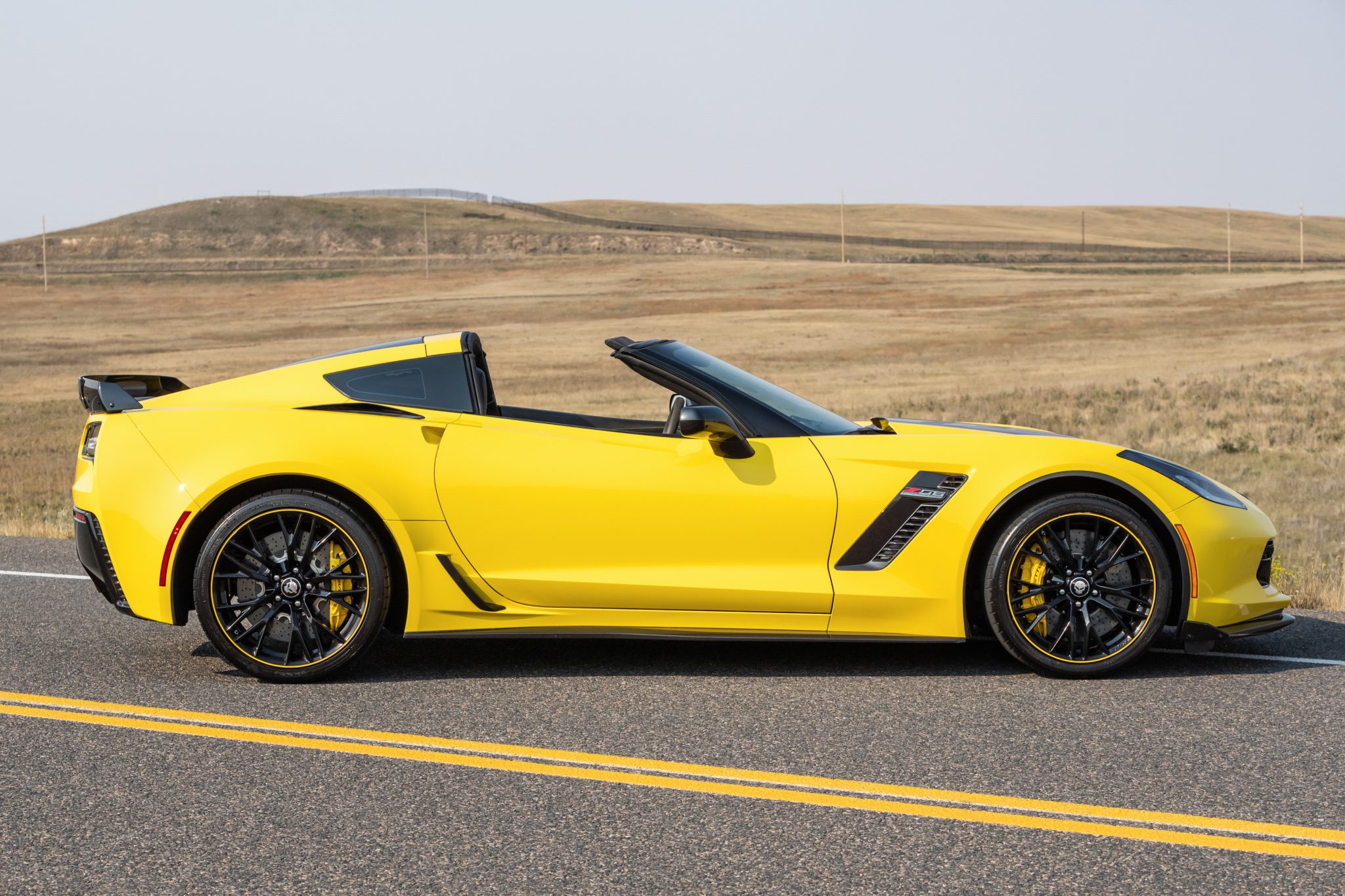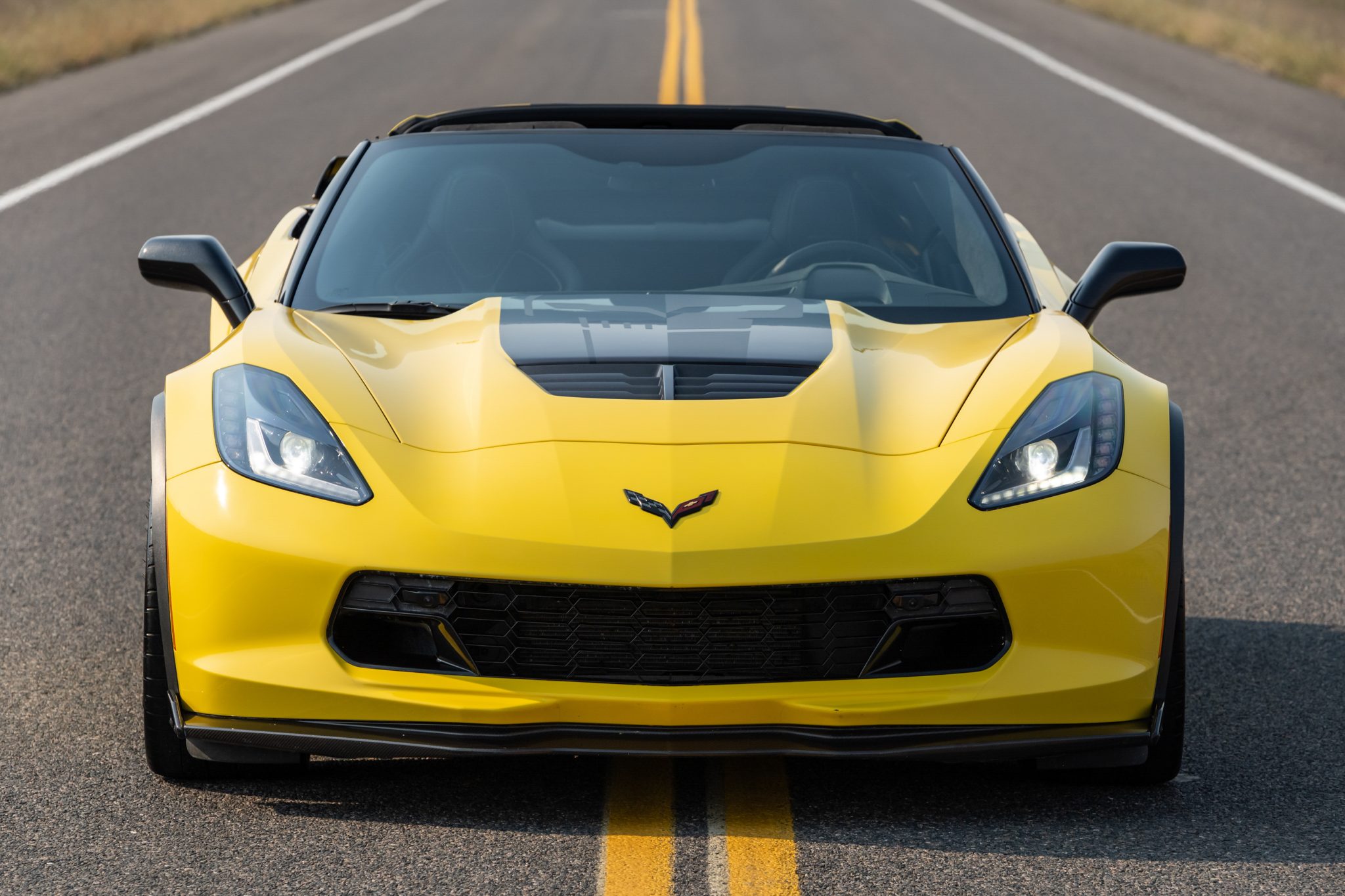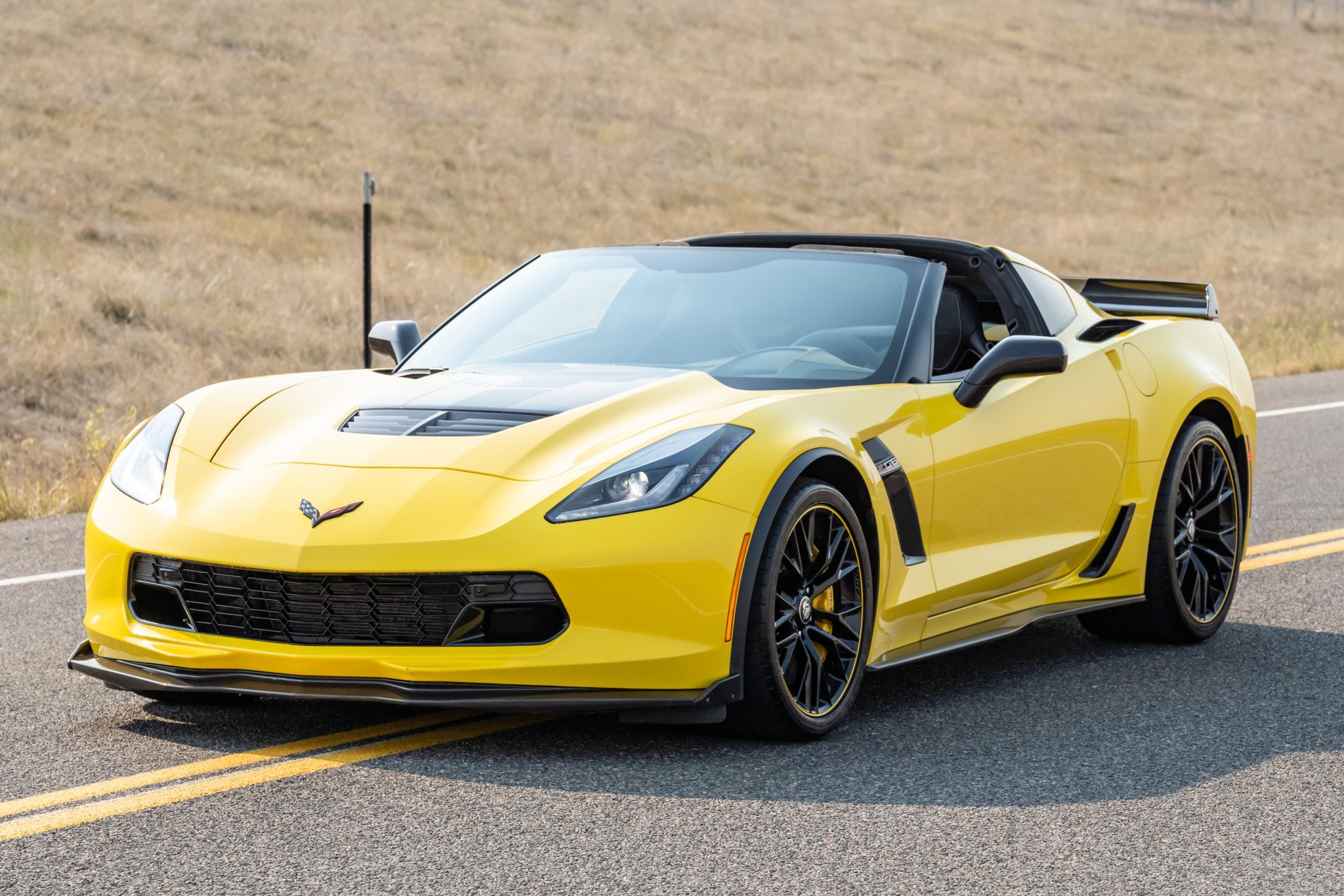 The 19″ and 20″ Z06 alloy wheels feature yellow stripes and Jake center caps and are mounted with Michelin tires. The car is equipped with a Z07 suspension with Magnetic Ride Control in addition to Performance Traction Management and an Active Handling System. Stopping power is provided by yellow-finished Brembo brake calipers over drilled and ventilated carbon-ceramic rotors at each corner. Curb damage is located on the right-front wheel.
