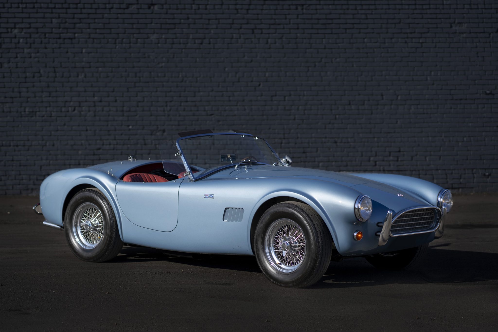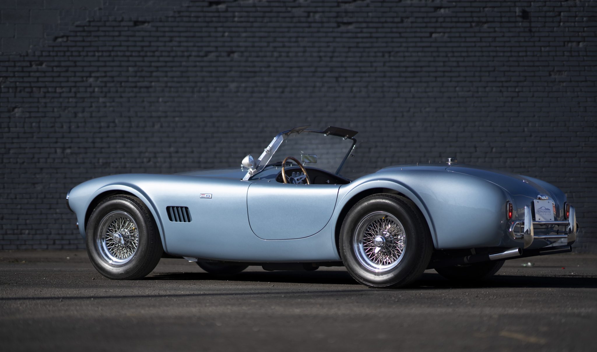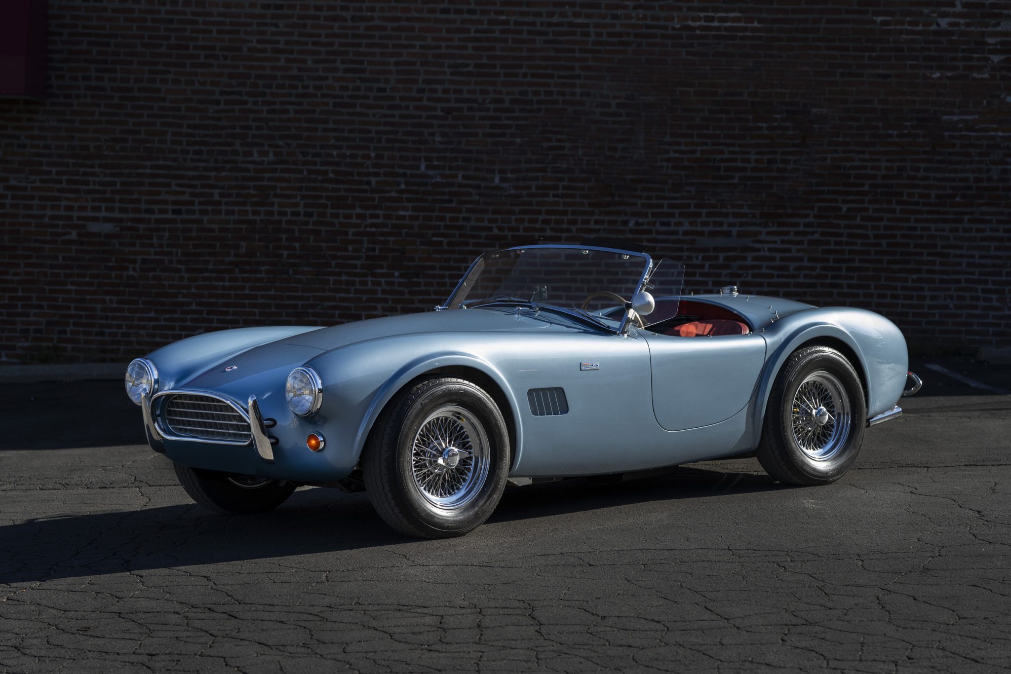 Chrome 15” wire wheels wear two-eared knock-off spinners and are mounted with 205/70 Avon Radial tires. A non-matching Avon spare is located in the trunk floor. The car is equipped with independent suspension, and stopping power is provided by four-wheel discs with Shelby-branded calipers.