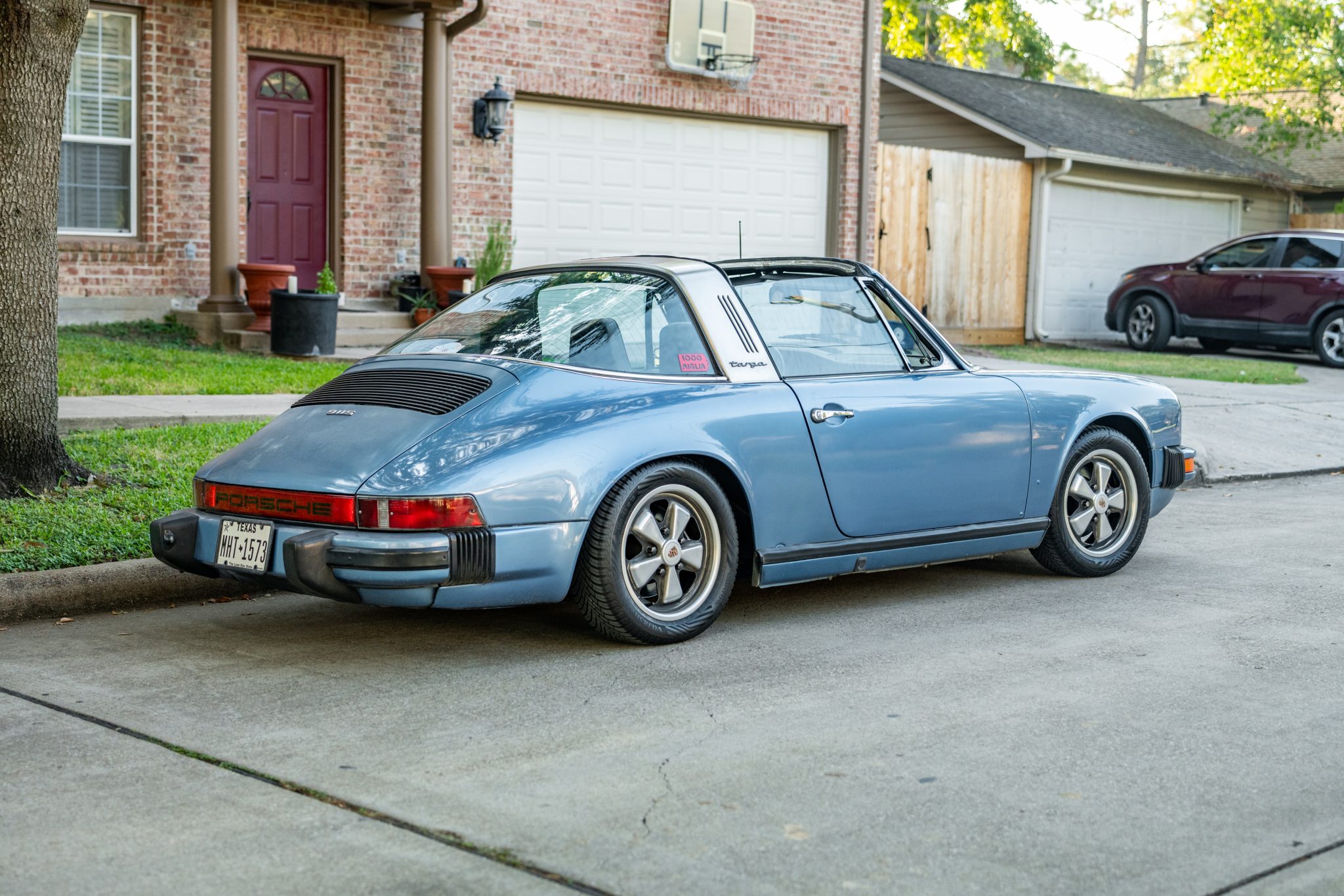 Fuchs 15″ forged-alloy wheels with black-finished recesses are wrapped in 195/55 Vredestein Quatrac tires that have 2023 production-date codes. A space-saver spare is secured in the front trunk, and braking is provided by four-wheel ventilated discs.
