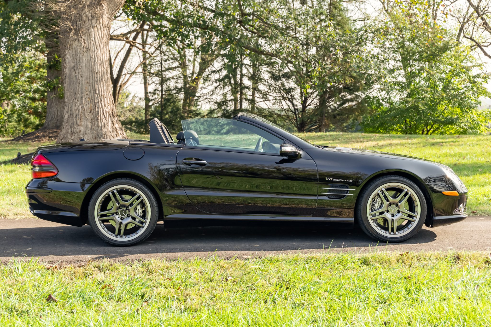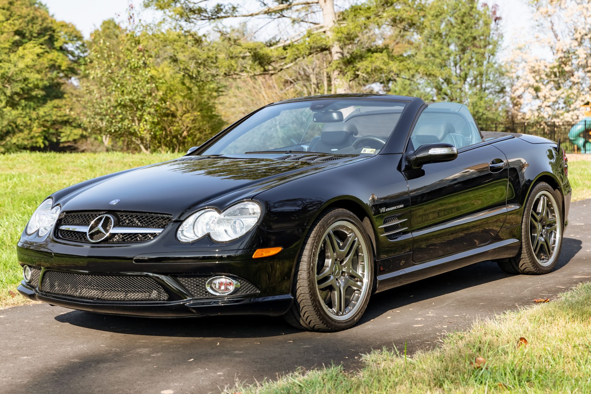 The 19″ two-piece alloy wheels have curb marks and are mounted with Michelin Pilot Sport tires. The car features Active Body Control suspension as well as an Electronic Stability Program, Automatic Slip Regulation, and an AMG High-Performance Braking System with cross-drilled rotors.