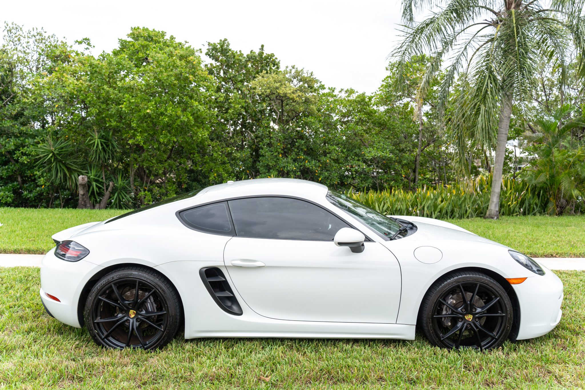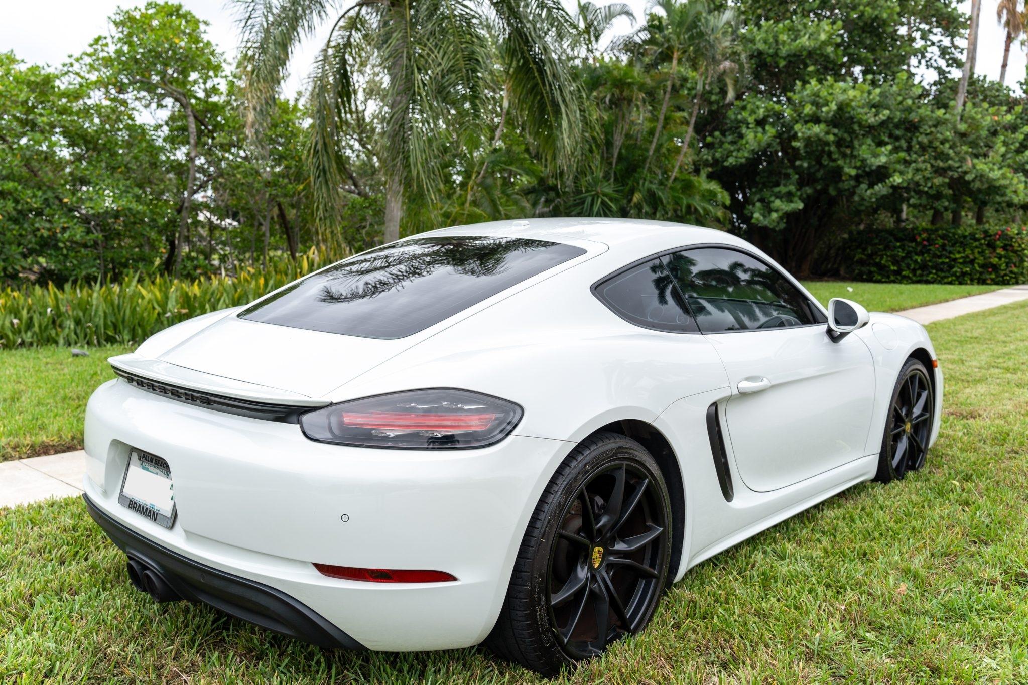 Satin black-painted 20″ Carrera S wheels are mounted with 235/35 front and 265/35 rear Falken Azenis FK510 tires. The seller notes that the rear tires were replaced in 2022 and the fronts were replaced in 2023. Braking is handled by cross-drilled and ventilated discs at each corner.