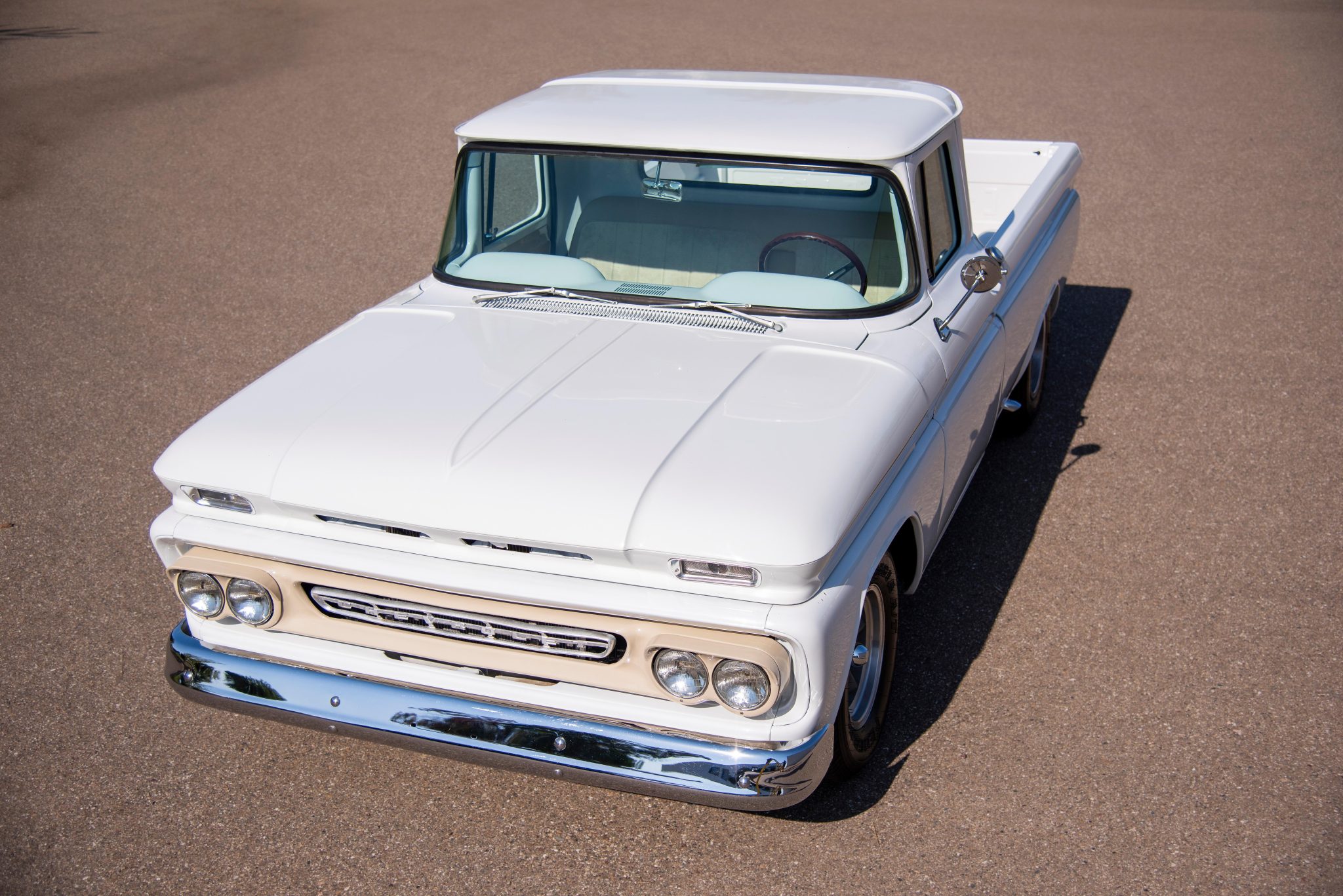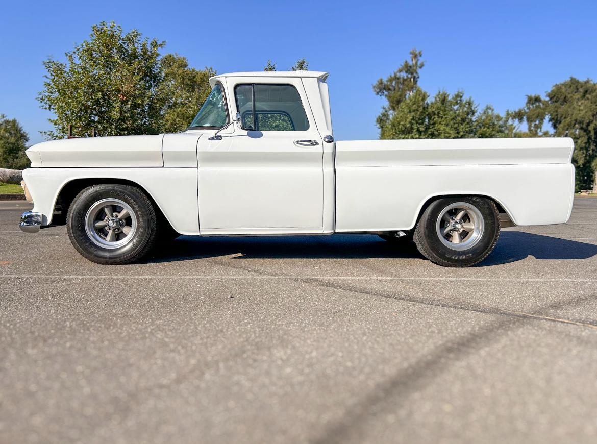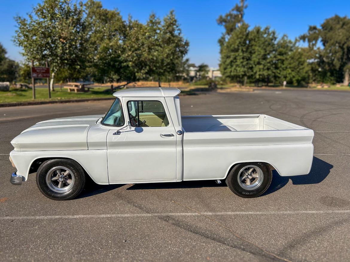 The pickup bed was refinished with stained wood slats and body-color runners. The rear wheelhouses have been tubbed to accommodate the wider rear tires and lowered ride height.