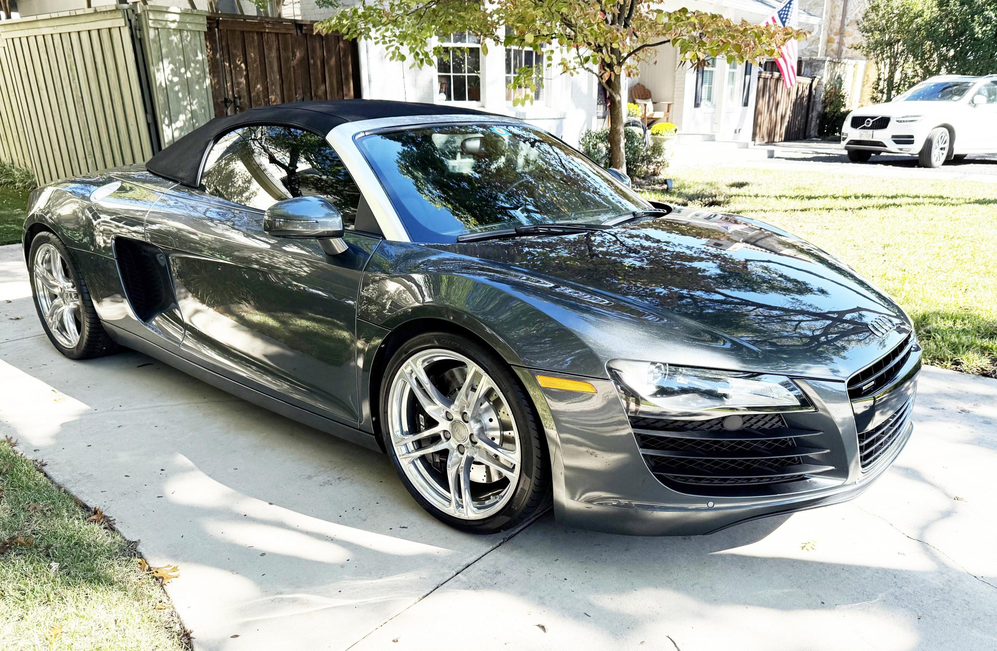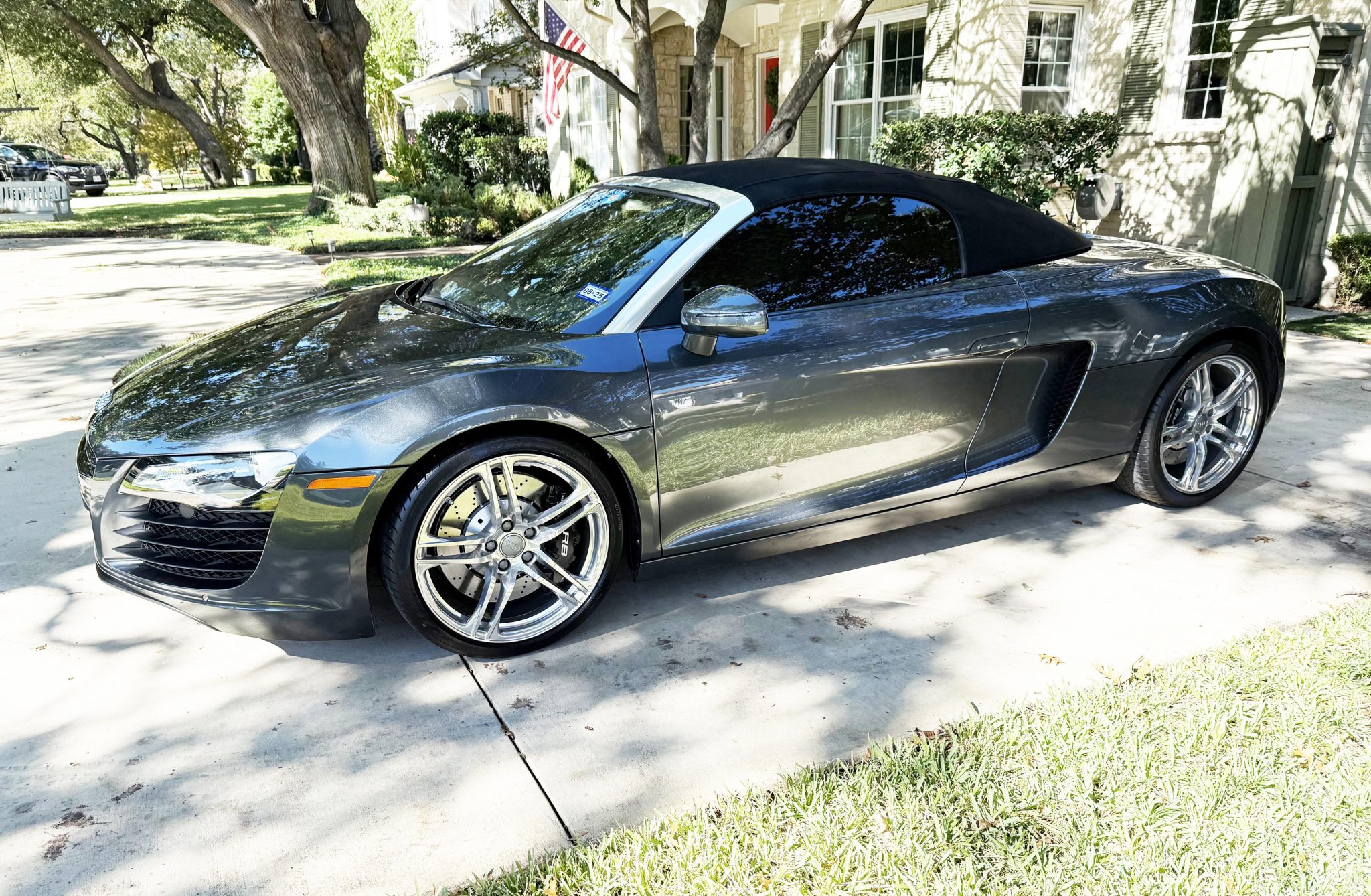 Polished 19″ double-spoke wheels are mounted with Pirelli tires the seller recommends replacing due to age. Audi Magnetic Ride magnetorheological dampers were standard equipment on the R8, and braking is handled by four-wheel ventilated and cross-drilled discs. The seller also recommends flushing the brake fluid.