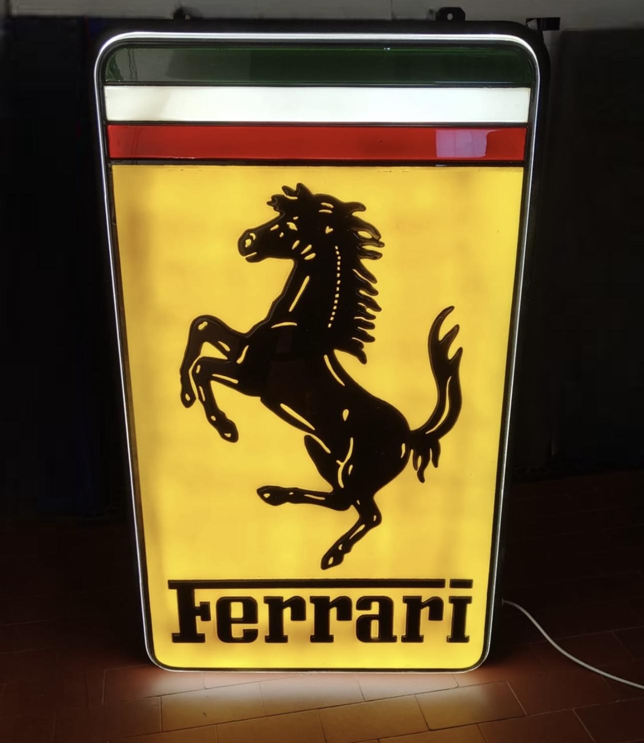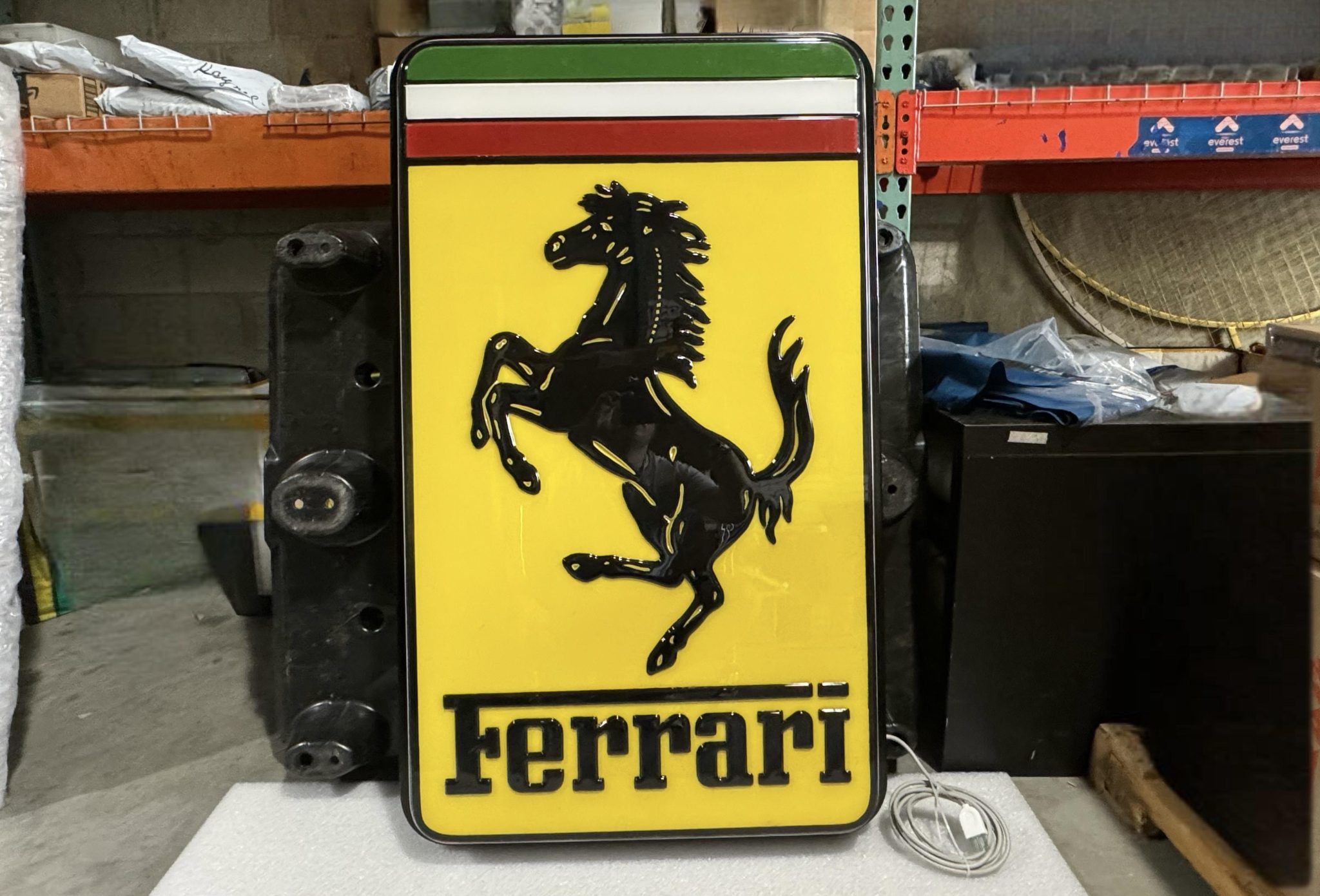 The thermoformed panel presents a prancing horse logo against a yellow background along with a Ferrari script logo and a tri-color stripe. Measurements are approximately 50″ tall by 30″ wide and 4″ deep.
