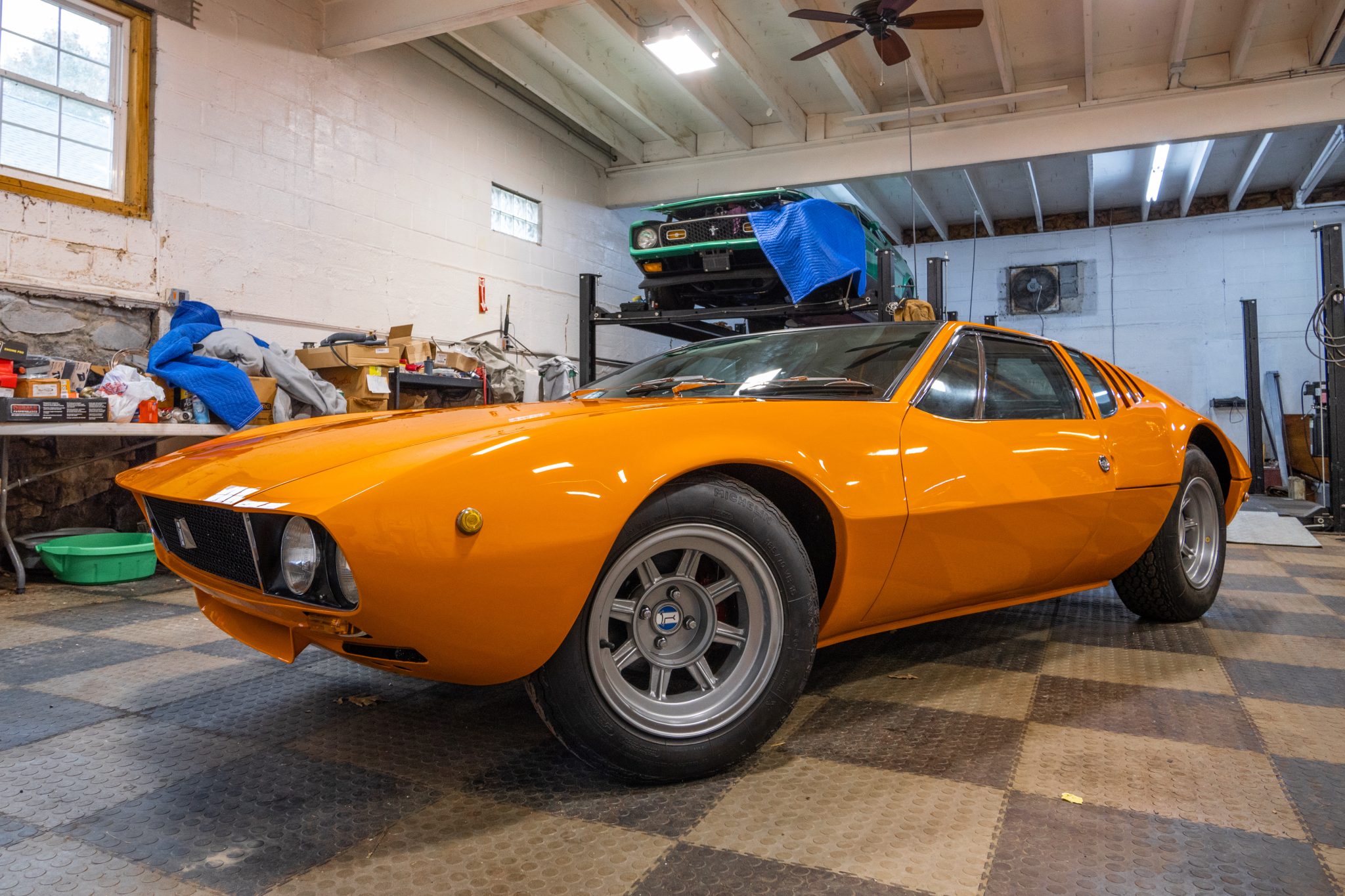 This example underwent a refurbishment under previous ownership that included a repaint in orange, which is reportedly its original color. Exterior features include fixed quad headlights, round side markers, a mesh rear grille, and gullwing-style engine compartment doors, the latter of which incorporate rectangular glass panels, rear vents, quarter windows, and side louvers.