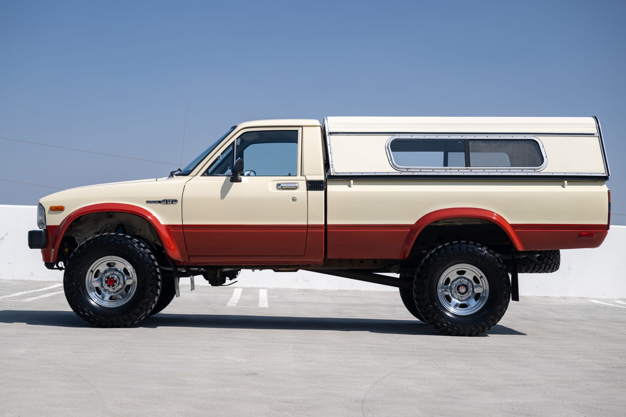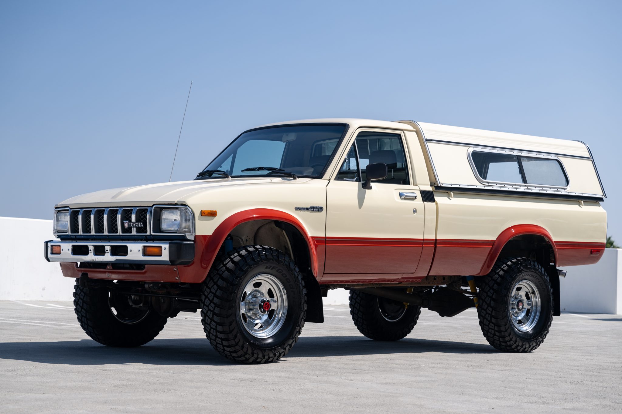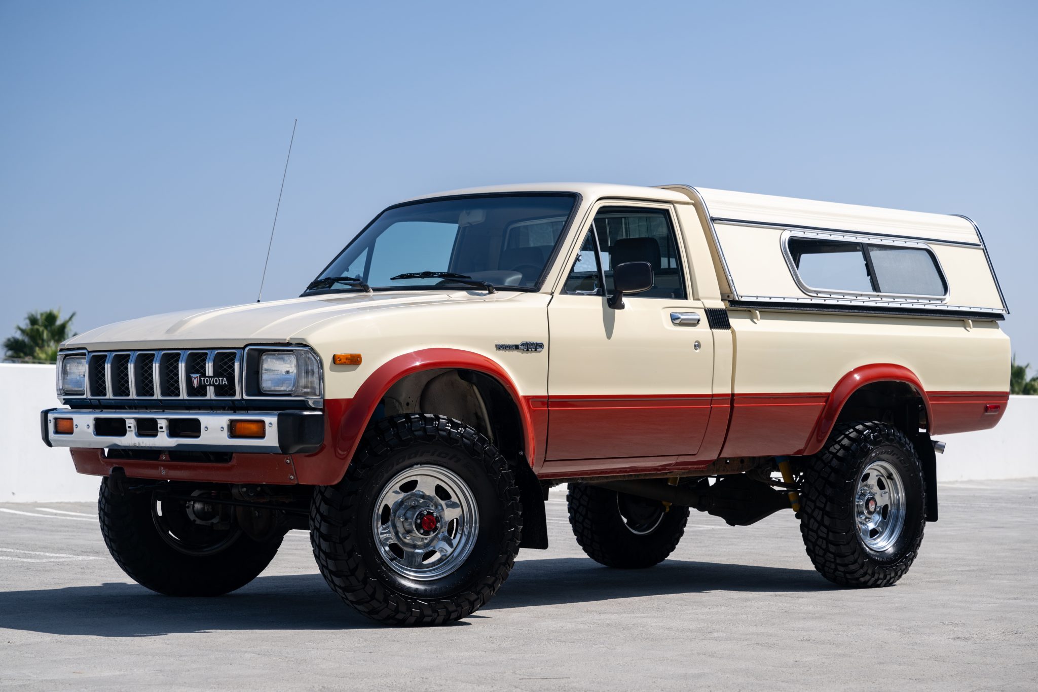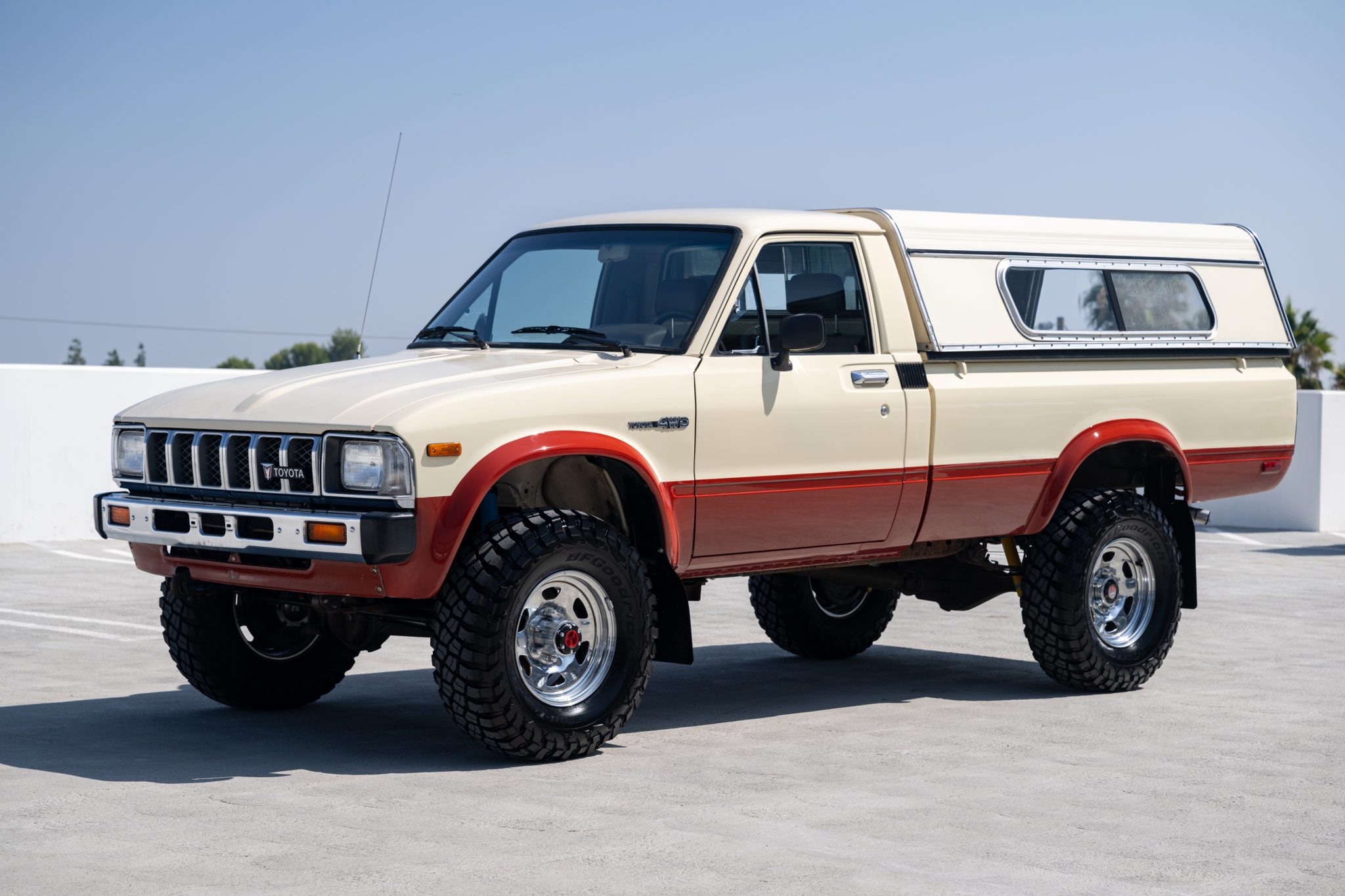 Chrome 15″ wheels are mounted with BFGoodrich All-Terrain T/A KM3 tires. The steering knuckle was rebuilt in January 2024, at which time Bilstein shocks were installed and the brake booster, master brake cylinder, and front brake pads, rotors, and calipers were also replaced.