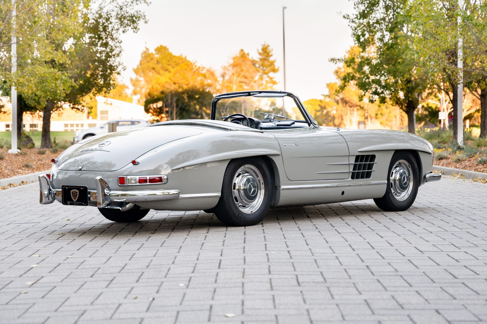 Originally finished in Cement Gray (186), this example is said to have been repainted in red earlier in its life before receiving a repaint in its factory shade during a refurbishment performed in the early 2000s. The car is accompanied by a contrasting dark gray removable hardtop with 300SL pillar badges and is equipped with a black soft top that was installed during the 2011 refurbishment work. European-specification headlights were also installed in 2011, and additional features include bumper guards at front and rear, a driver-side mirror, pivot-out door handles, and fender louvers framed by grooved accent lines that extend onto the quarter panel doglegs.
