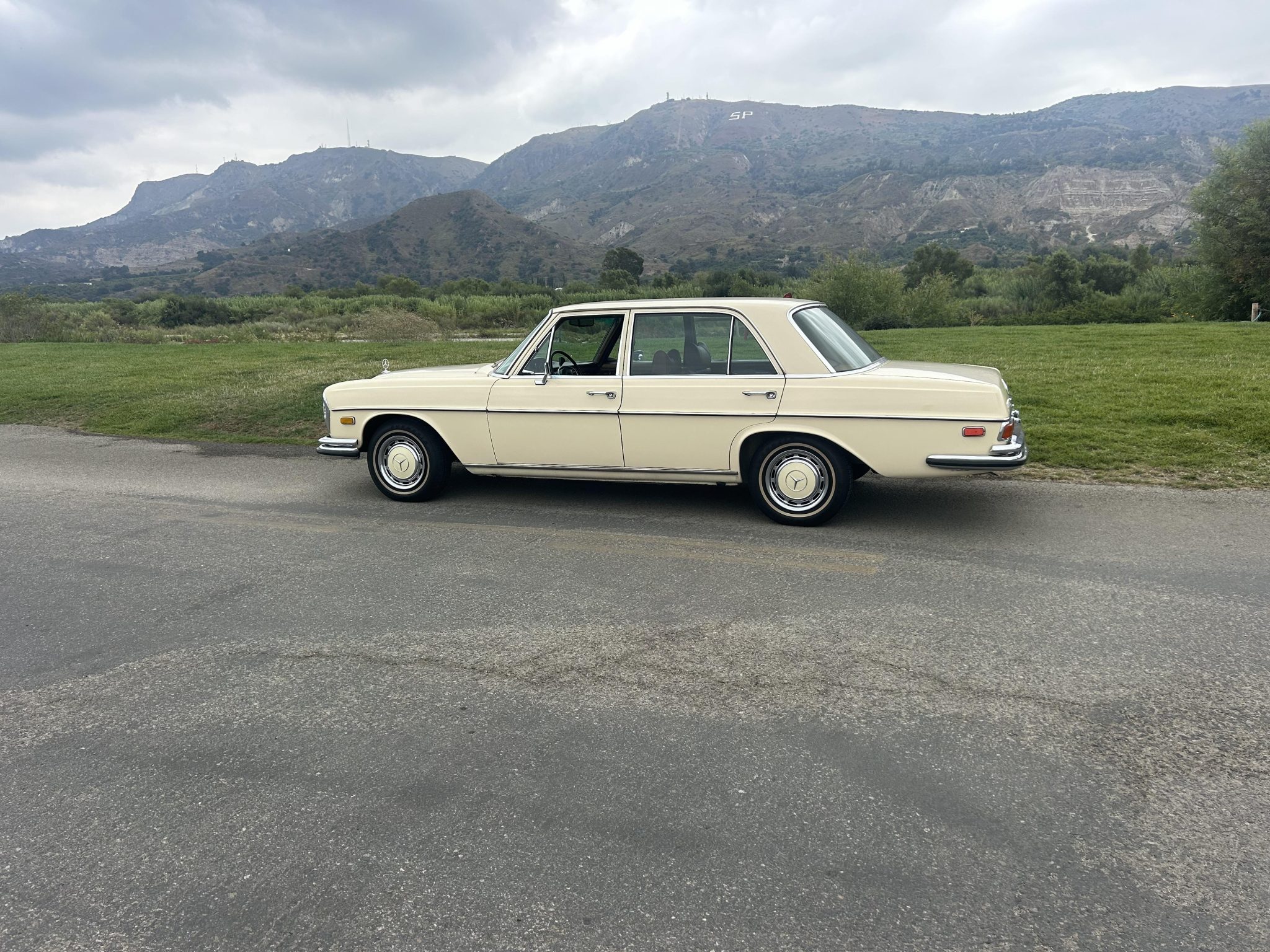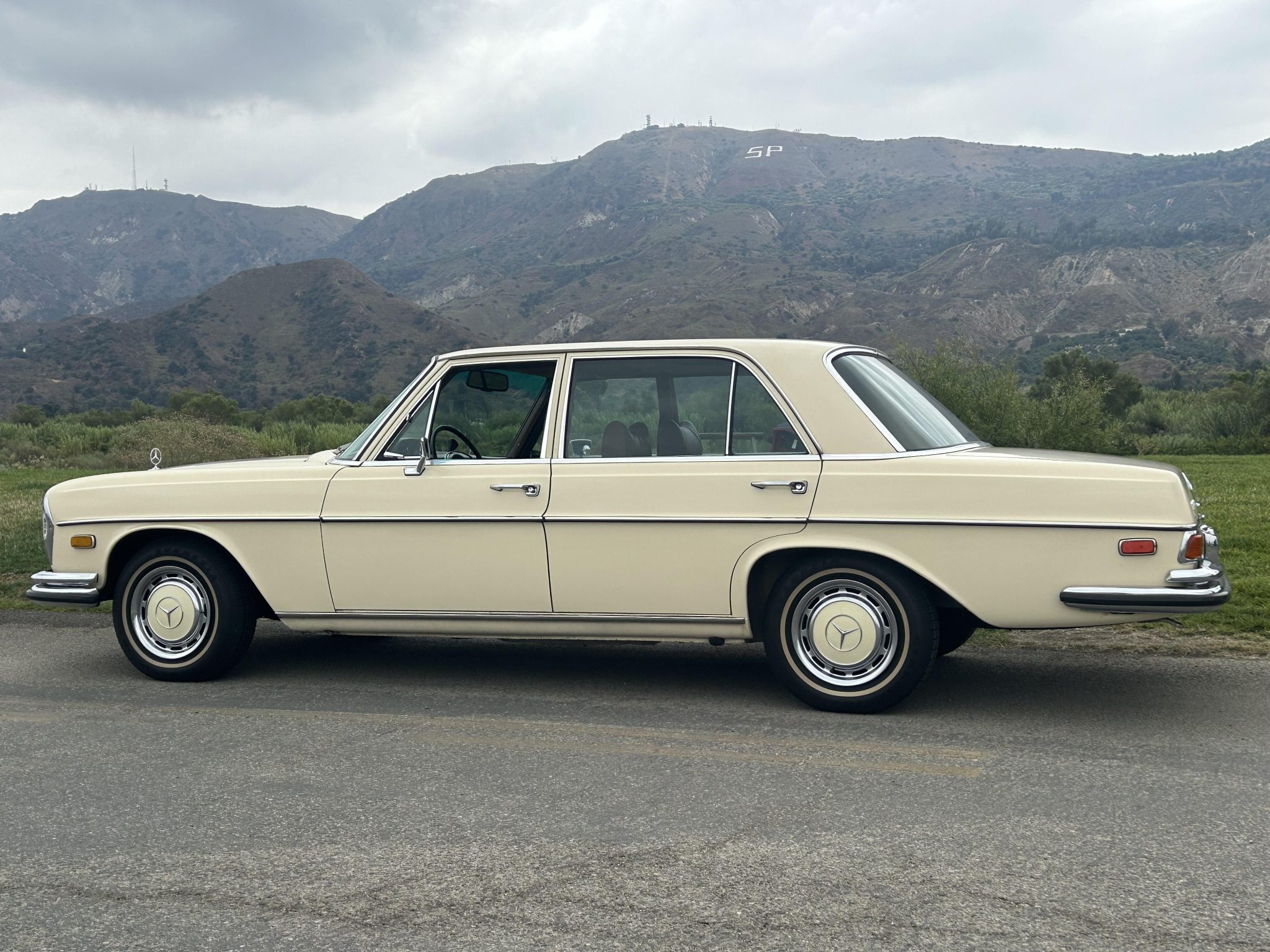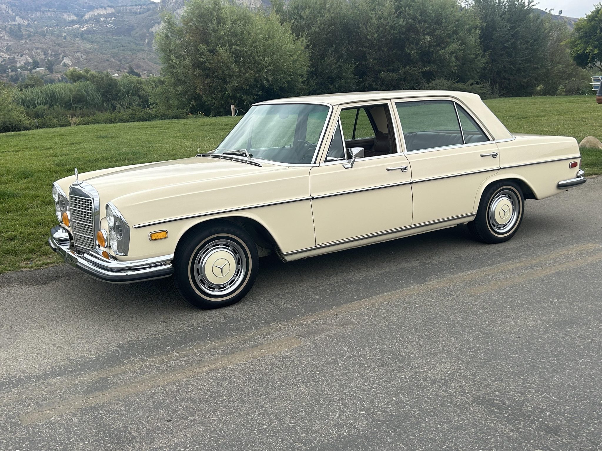 Steel 14″ wheels wear polished hubcaps with body-color accents and are mounted with 195/75 thin-whitewall tires. The car is equipped with power steering, and stopping power is provided by power-assisted disc brakes at each corner.