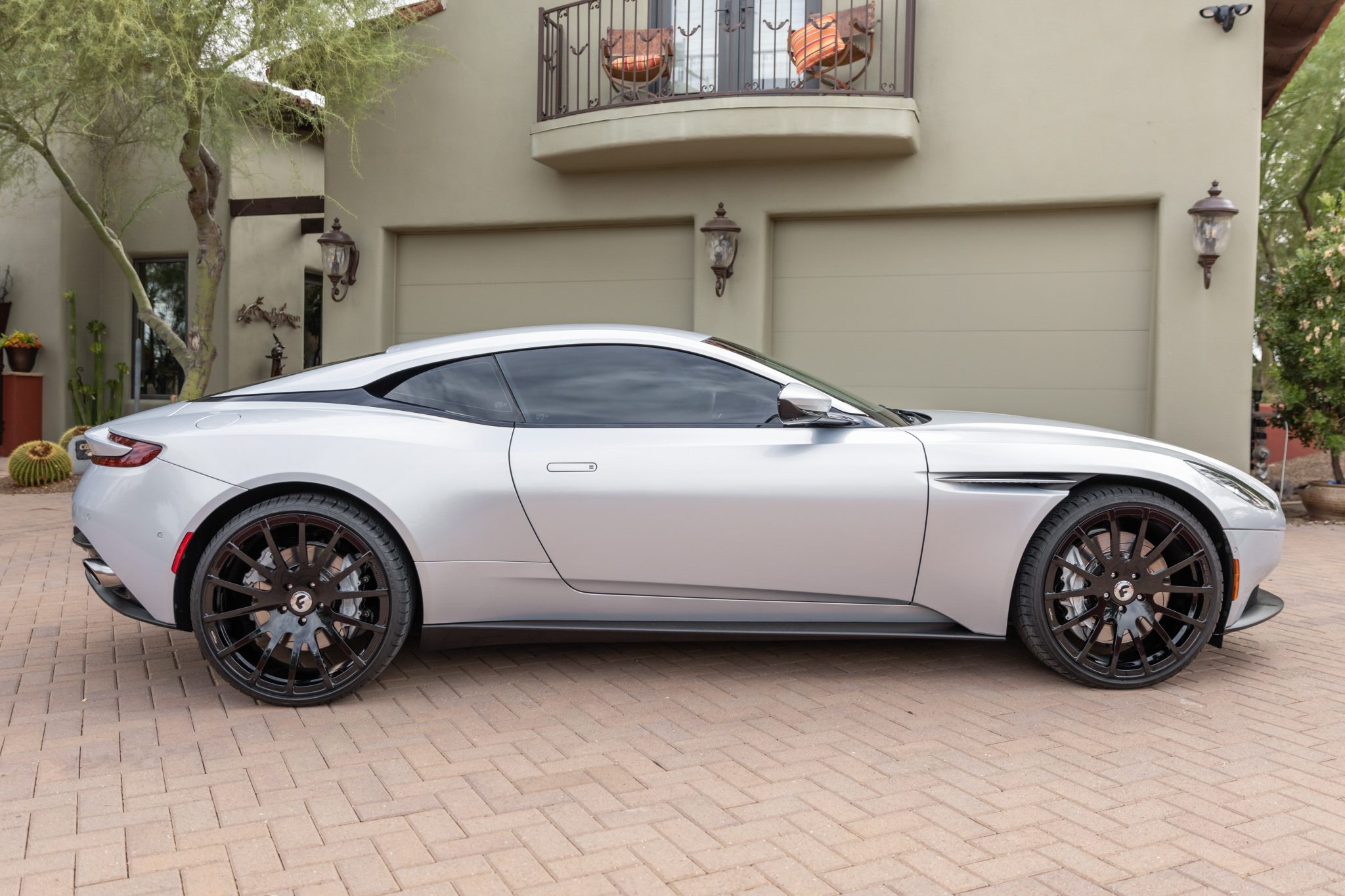 The black-finished 22″ Forgiato V-spoke wheels are mounted with Radar Dimax AS-8 tres, and braking is handled by slotted and ventilated discs at each corner. The car came equipped from the factory with an Adaptive Damping System. The brake fluid was changed in November 2023. The removed 20″ wheels are included in the sale.