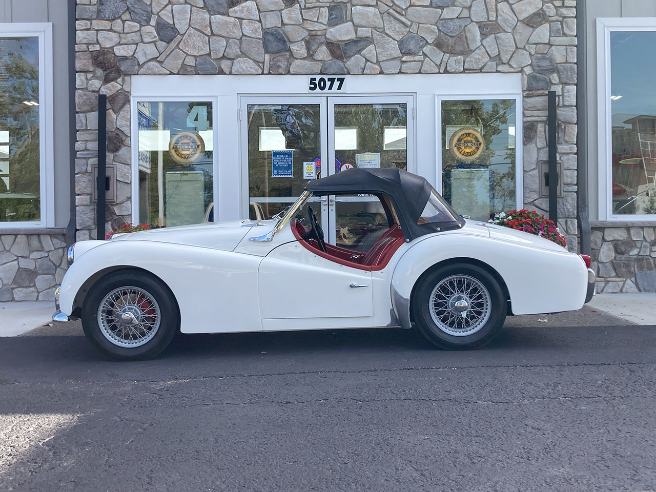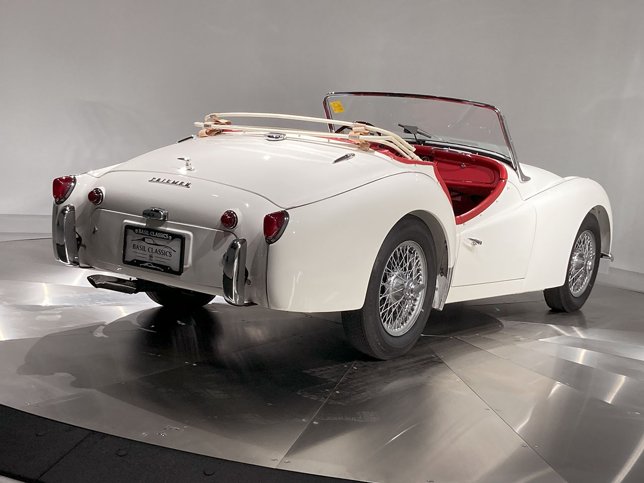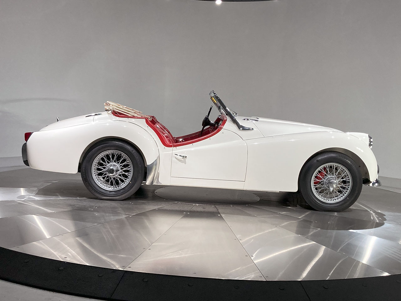 Silver-painted 15″ knock-off wire wheels are mounted with 6.00–15 Atlas Cushionaire tires. The car was factory equipped with a coil-spring independent front suspension and a semi-elliptic leaf-spring rear suspension. Front disc brakes are complemented by red calipers, and drum brakes are fitted at the rear.