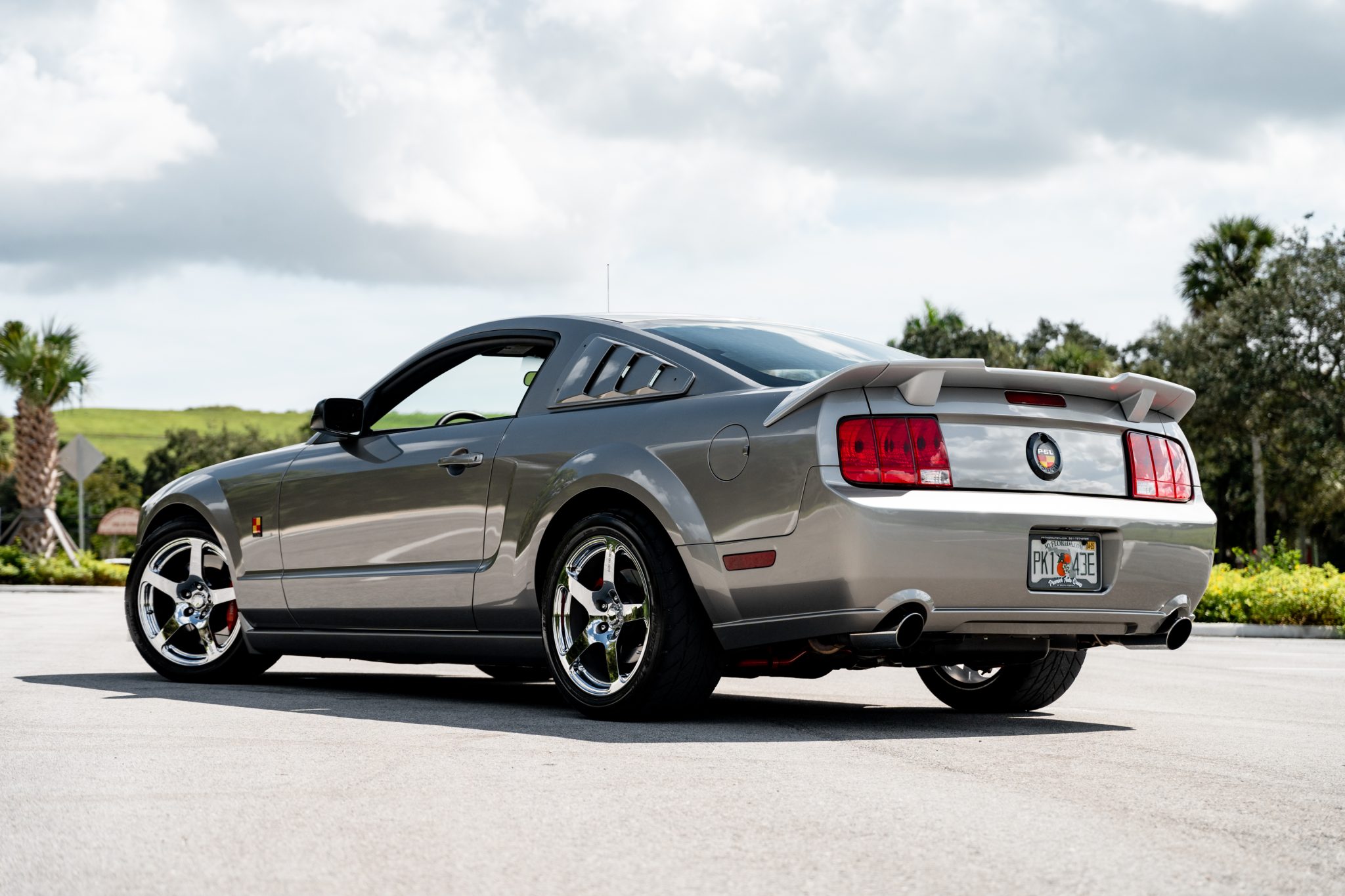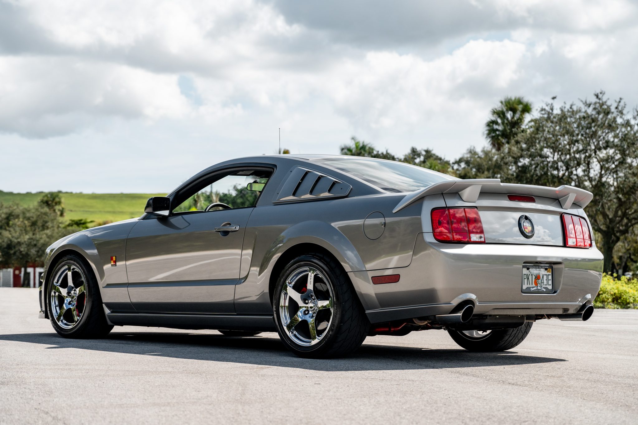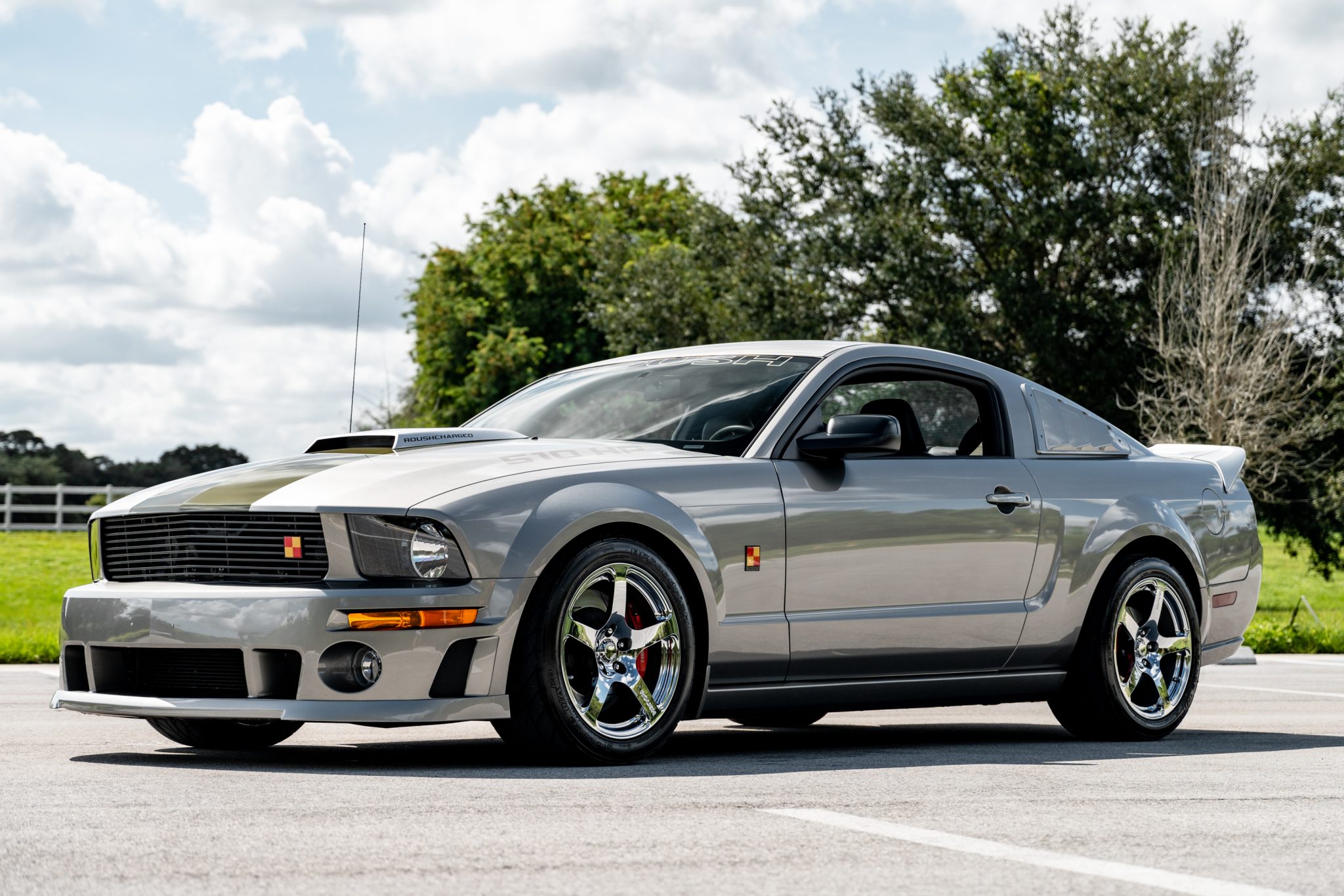 Roush 18″ forged wheels are mounted with 275/40 BFGoodrich g-Force T/A tires. The Roush Stage 3 suspension included revised swaybars, springs, front struts, rear shocks, and pinion snubbers. Braking is provided by red-finished calipers over slotted rotors at all four corners. The ABS module was replaced in preparation for the sale.