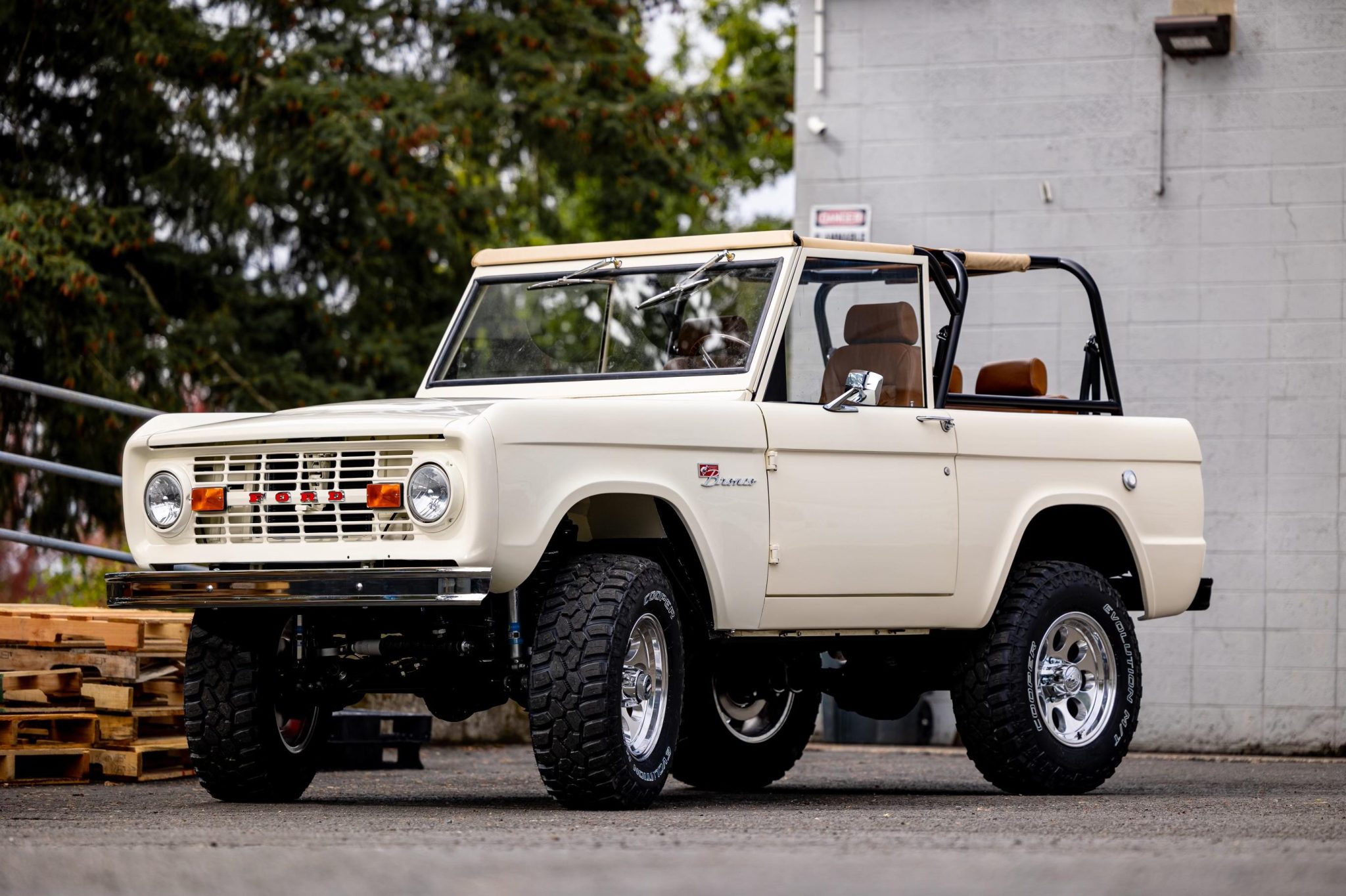 The truck rides on a lifted suspension with dual Bilstein shocks at each corner, and a body lift was installed to accommodate the modified drivetrain. Polished 17″ Ion wheels are mounted with 265/70 Cooper Evolution M/T tires. The truck is equipped with manually locking hubs up front along with a Borgeson power steering unit, and braking is provided by hydroboosted four-wheel Wilwood discs.