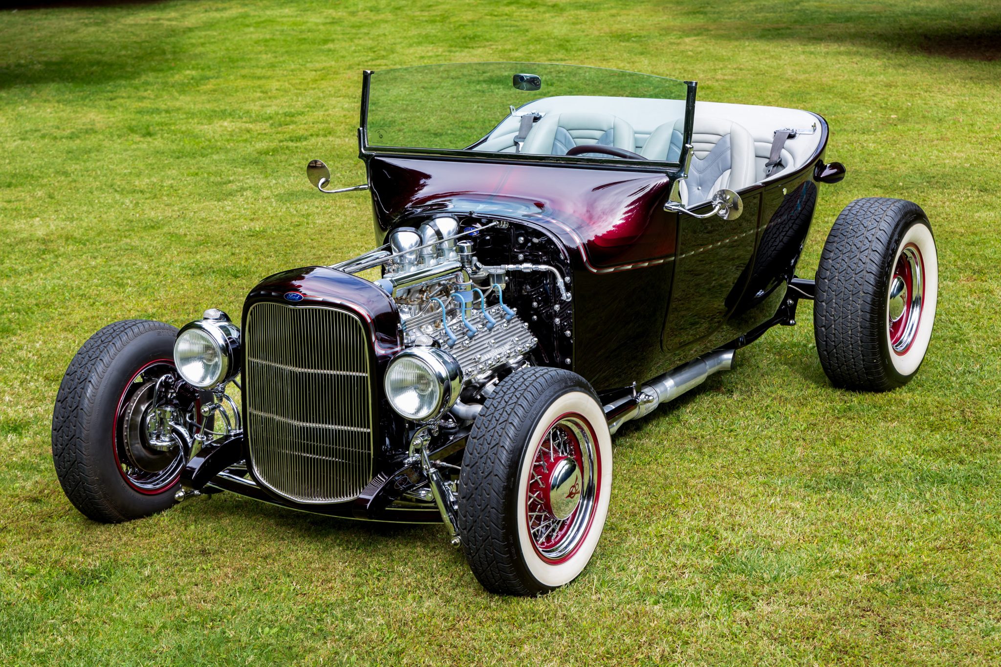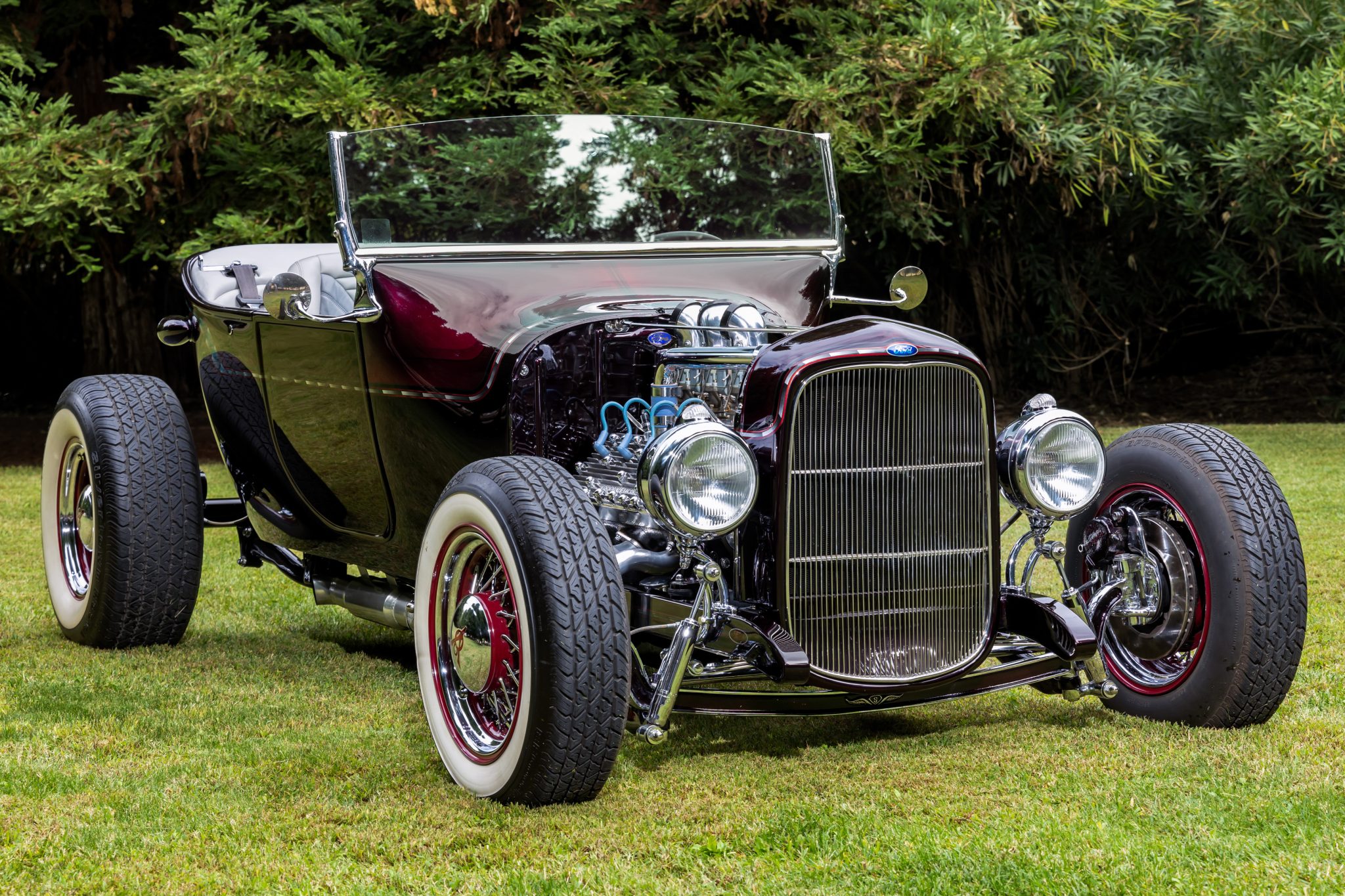 Wheel Vintiques 15″ wire wheels have chrome-finished spokes, red hubs and rims, and chrome hubcaps and inner and outer trim rings. BFGoodrich Silvertown Radial whitewall tires measure 165/70 at the front and 255/70 out back. Braking is provided by ventilated discs at each corner and a dual-reservoir master cylinder housed beneath the dashboard. The I-beam front axle has been dropped 4″ and works in conjunction with a Unisteer rack-and-pinion steering system, Pete & Jake’s Hot Rod Parts front shocks, and a transverse spring. The rear suspension is a custom multi-link setup with coilovers.