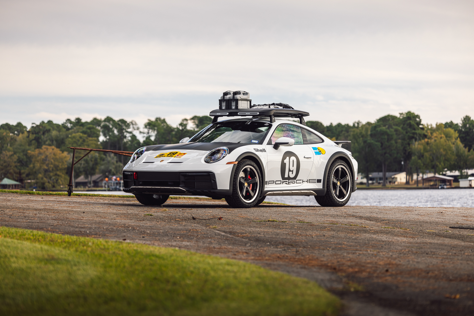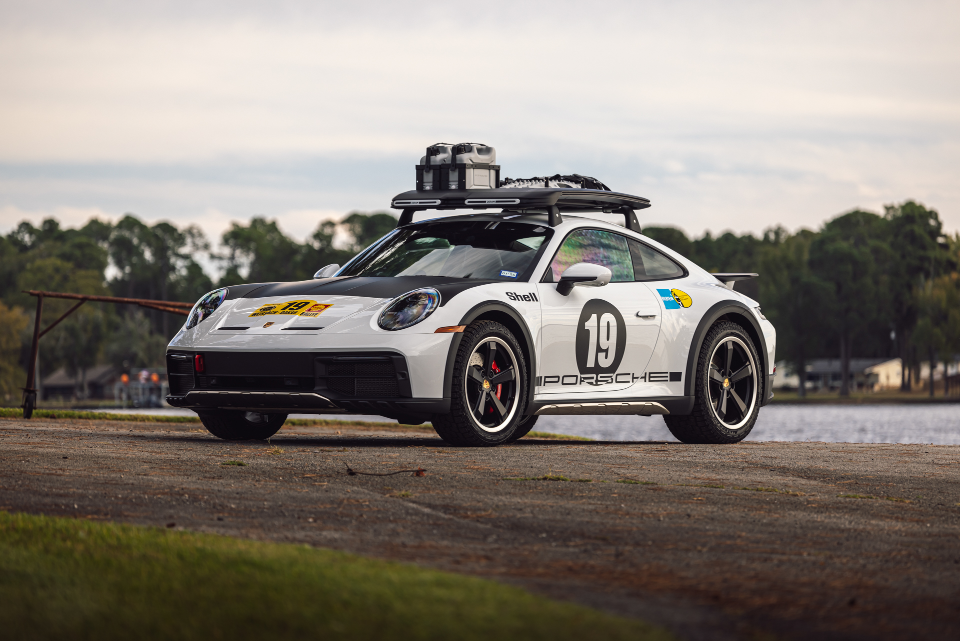 This example is finished in white with “Rallye 1971” graphics and has been fitted with a Tequipment roof rack that holds two water canisters, recovery boards, and a water-resistant travel bag. The Dakar-specific front and rear fascias incorporate stainless-steel skid plates as well as forged-aluminum tow eyes, while the side skirts wear inset stainless-steel guard plates and are accompanied by black wheel-arch extensions. The carbon-fiber front hood features air outlets shared with the GT3, and a carbon-fiber fixed rear spoiler is equipped out back. Further details include LED headlights with the Porsche Dynamic Lighting System as well as fog lights, 911 Dakar–logo puddle lamps, and a tinted taillight strip.