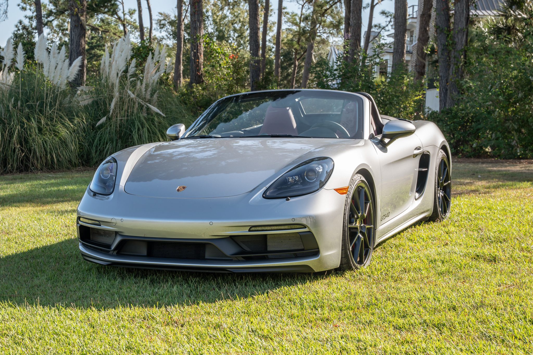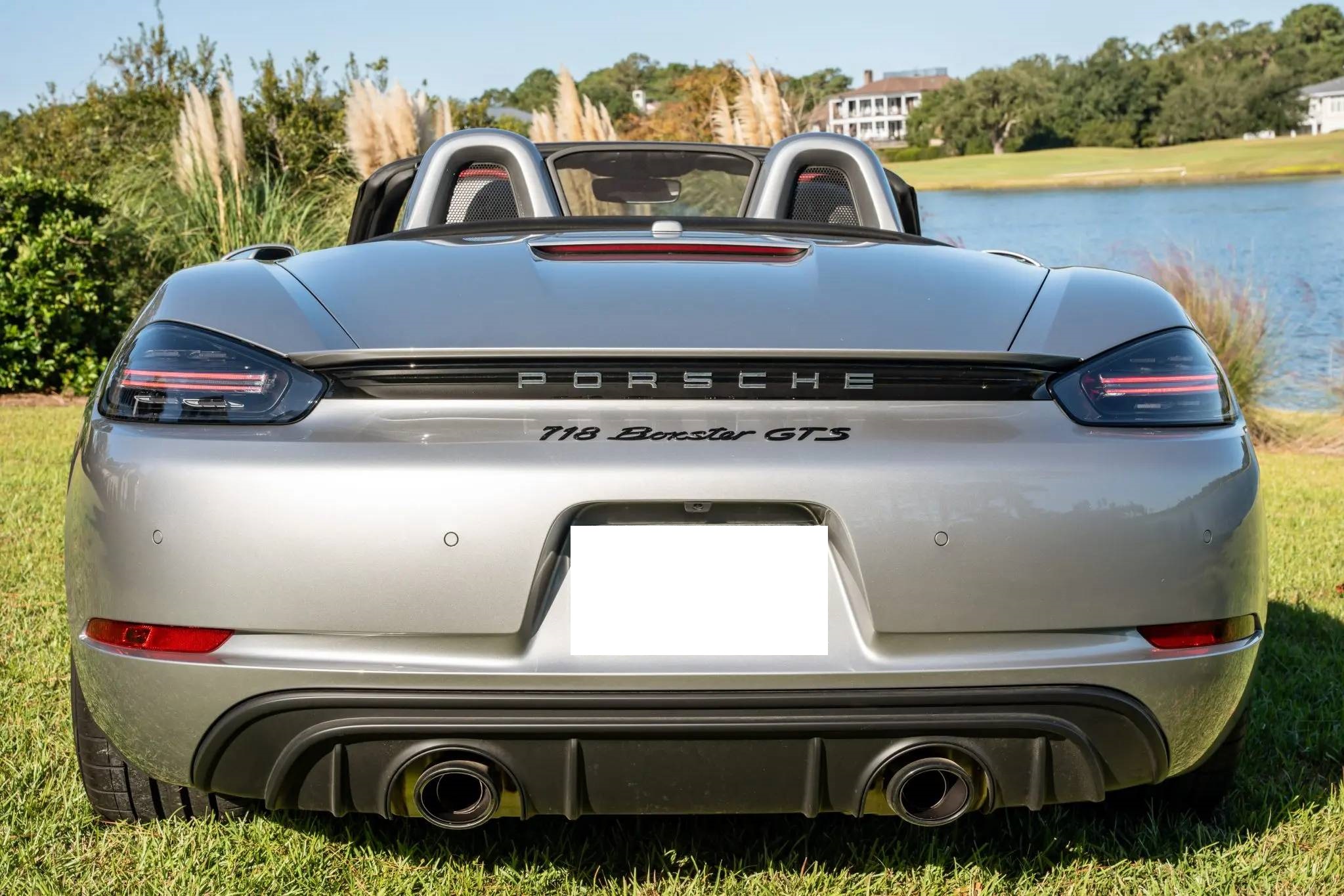 Black-finished 20″ 718 Sport alloy wheels are mounted with Pirelli P Zero tires. The car is equipped with Porsche Active Suspension Management (PASM), and the ride height of the GTS 4.0 is 20mm lower than the standard model. Stopping power is handled by cross-drilled and ventilated rotors and red-finished Porsche-branded calipers.