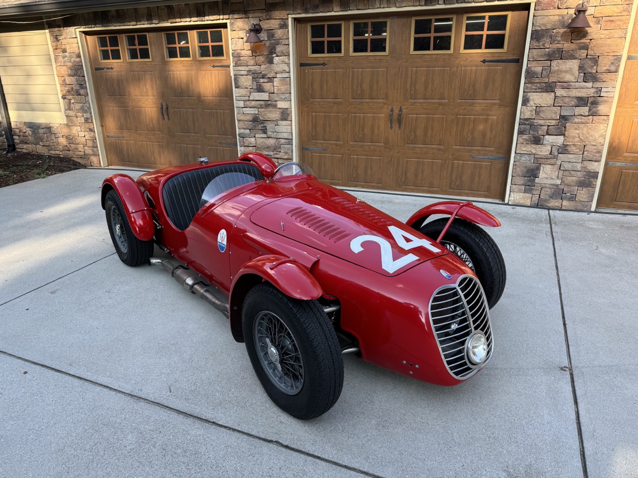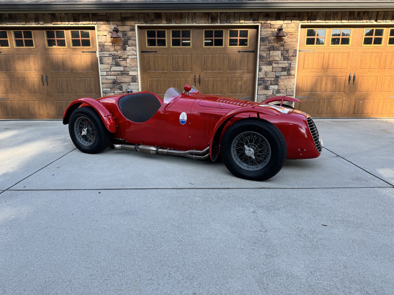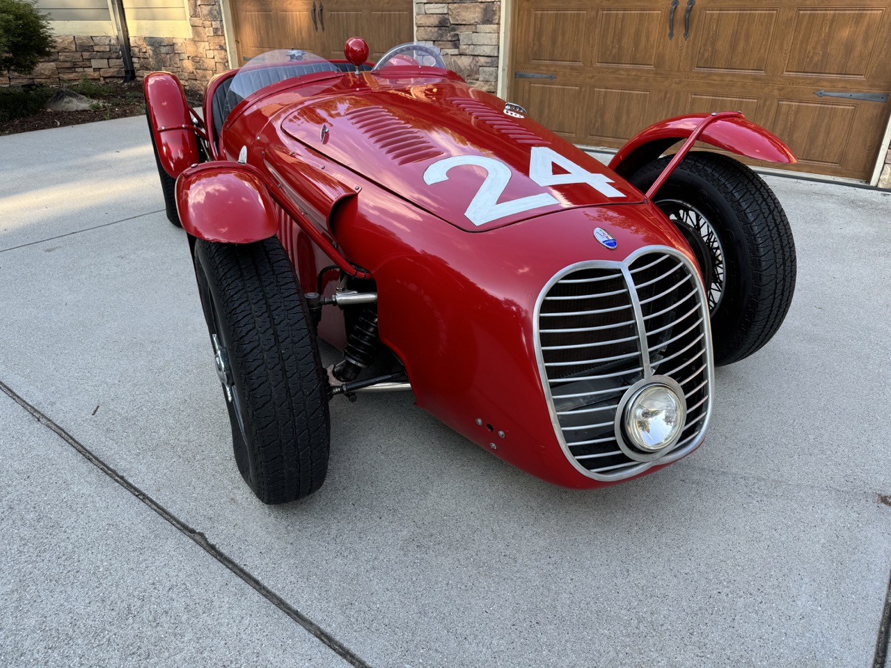 This re-creation’s construction incorporates a custom-fabricated steel-tube frame wrapped in aluminum and fiberglass bodywork finished in red. Closeups of the finish can be viewed in the photo gallery below and include various imperfections. Features include removable cycle-style fenders, an aluminum grille, a louvered hood panel, low-profile plexiglass windscreens, a Monza-style fuel filler cap, taillights, and a vented tail panel. A pair of uninstalled removable headlights is included in the sale.