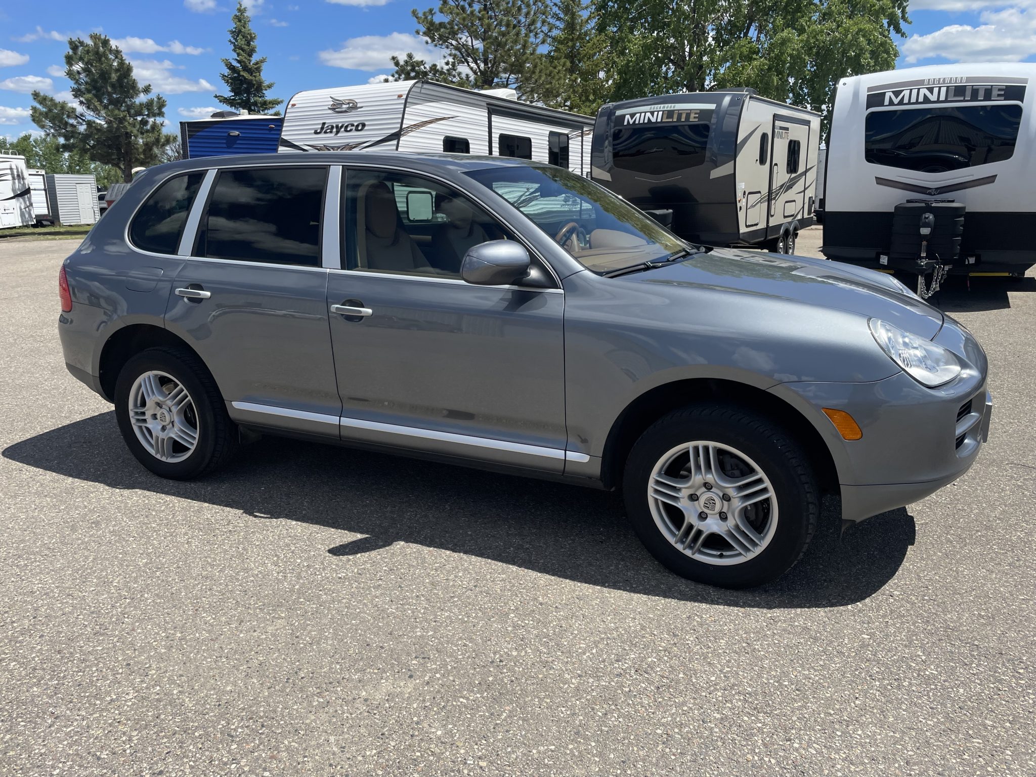 The 18″ Cayenne S II alloy wheels are mounted with 255/55 Toyo Versado CUV tires. Stopping power is from Porsche-branded calipers over ventilated rotors at each corner.