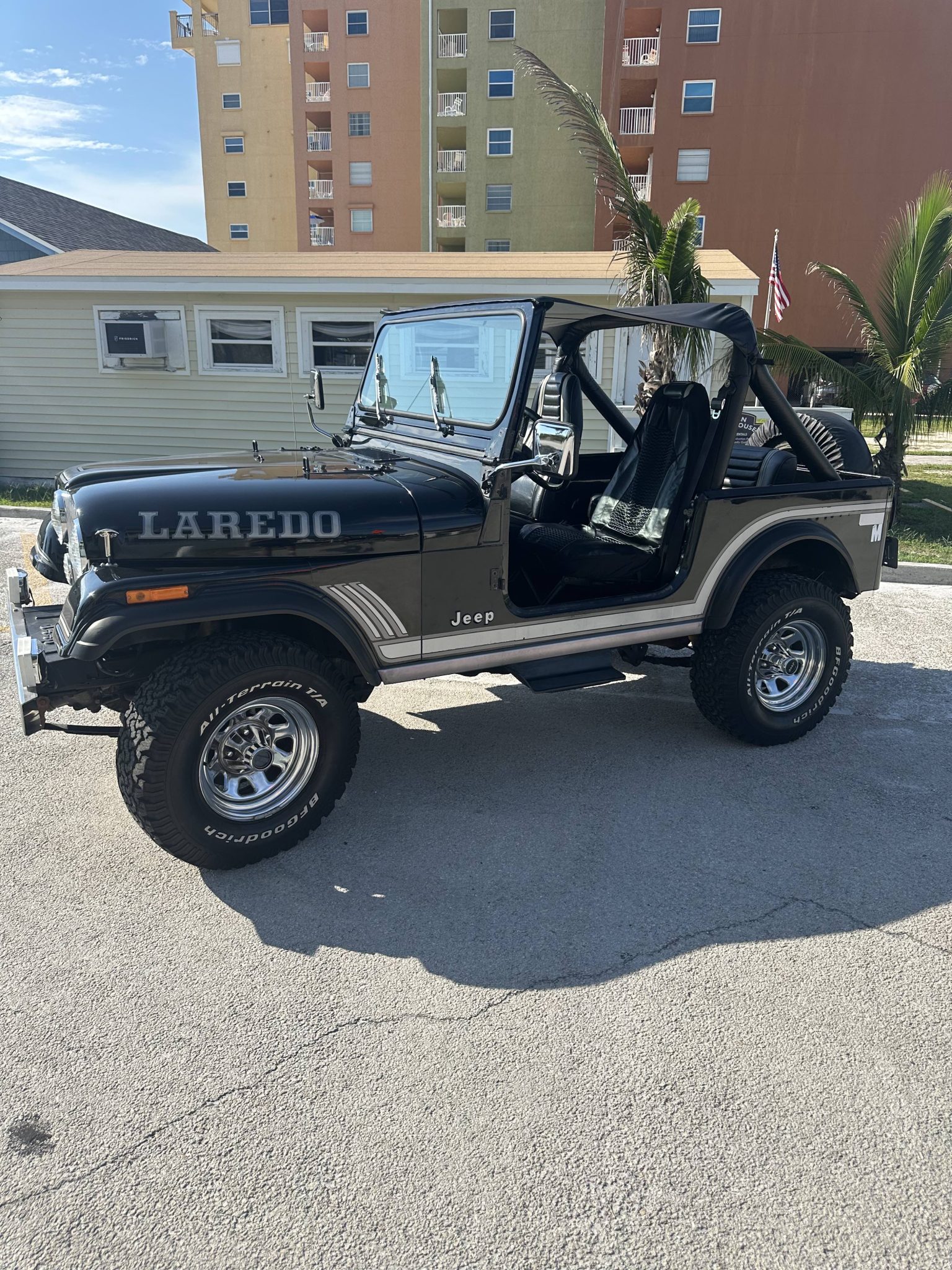 Polished 15″ steel wheels are mounted with BFGoodrich All-Terrain T/A tires, and a covered spare is affixed to the swing-away rear carrier. The truck is equipped with manually locking front hubs and power steering, and braking is provided by power-assisted front discs and rear drums.