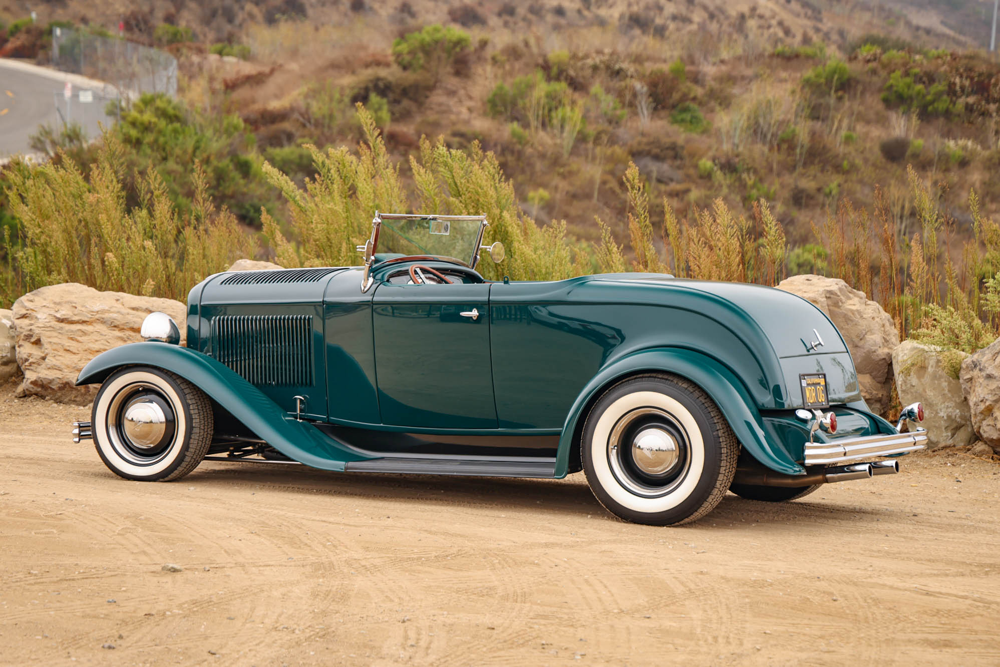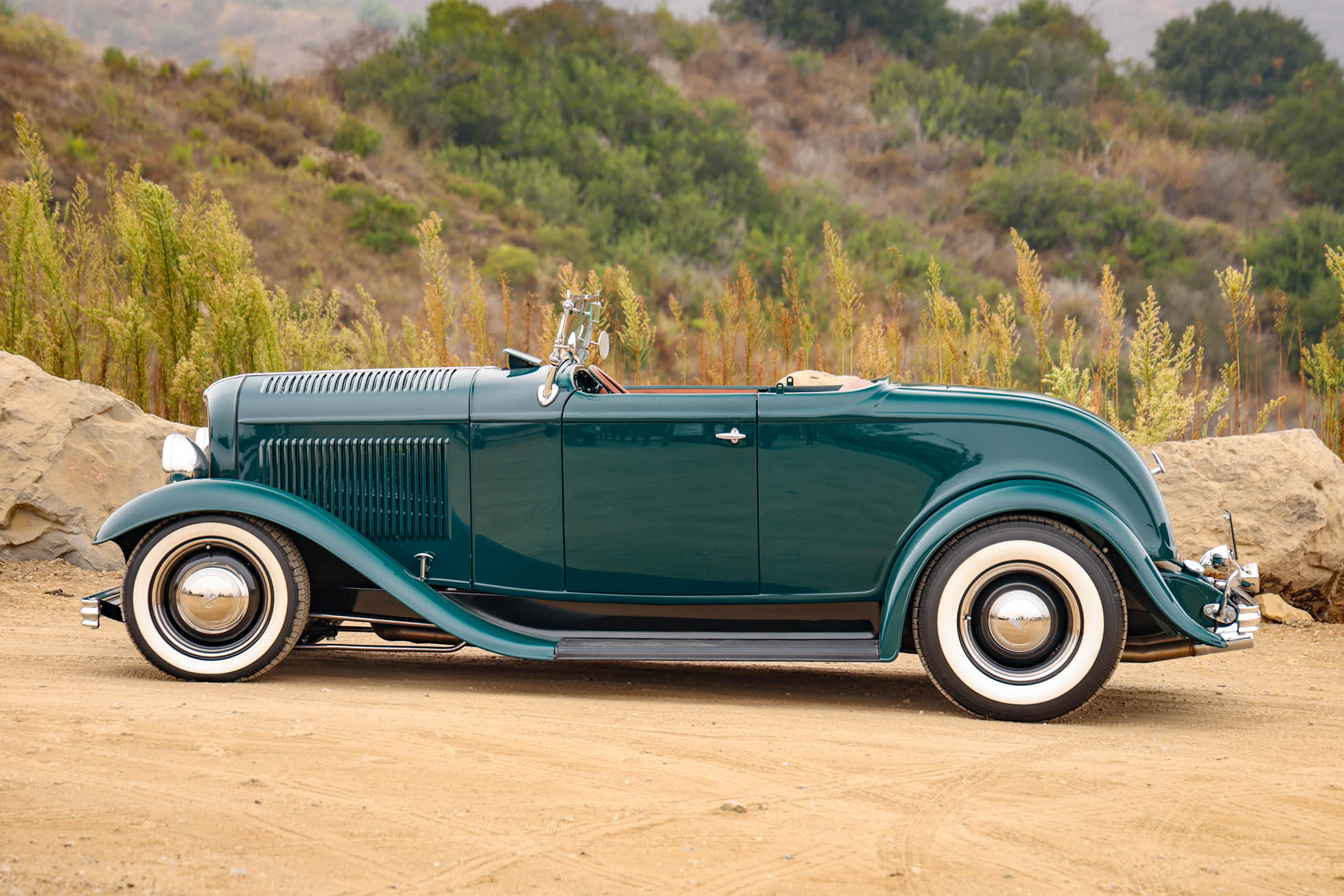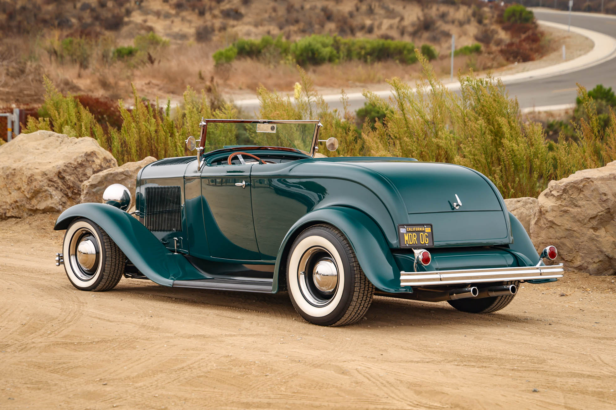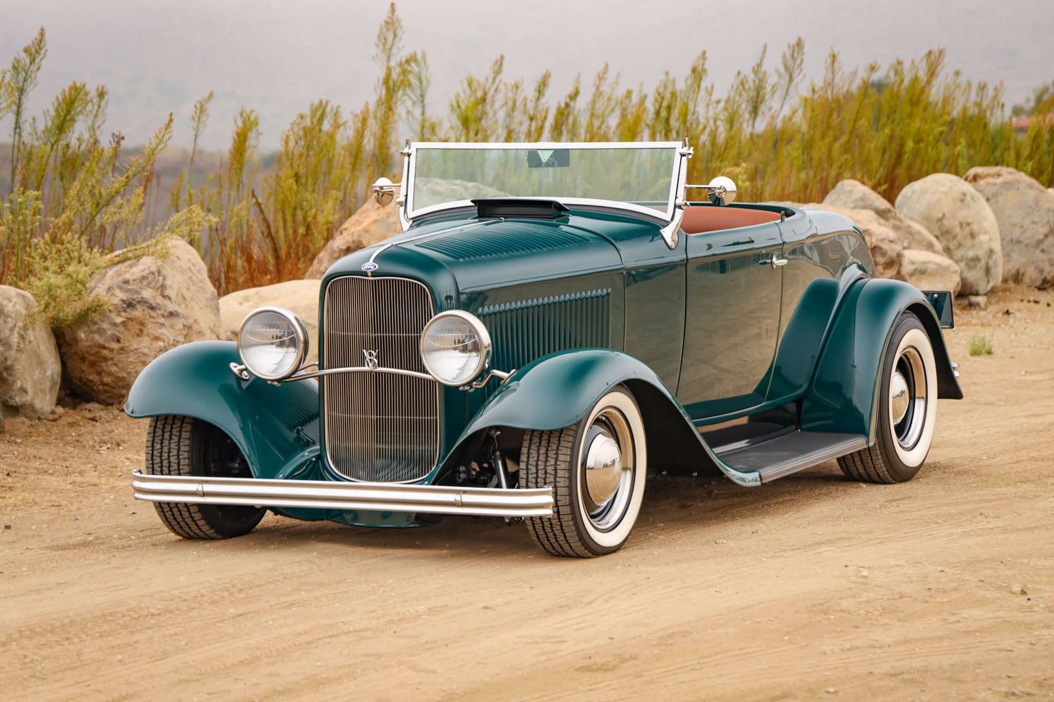 The car has hairpin radius rods, a drop axle, and a transverse-leaf-sprung front end, while out back it rides on coilover suspension with a four-bar rear locating link setup. The staggered-diameter steel wheels are mounted with whitewall tires, V8-logo hubcaps, and trim rings. The car has front disc brakes and a Wilwood proportioning valve, and the steering box was replaced in 2022.