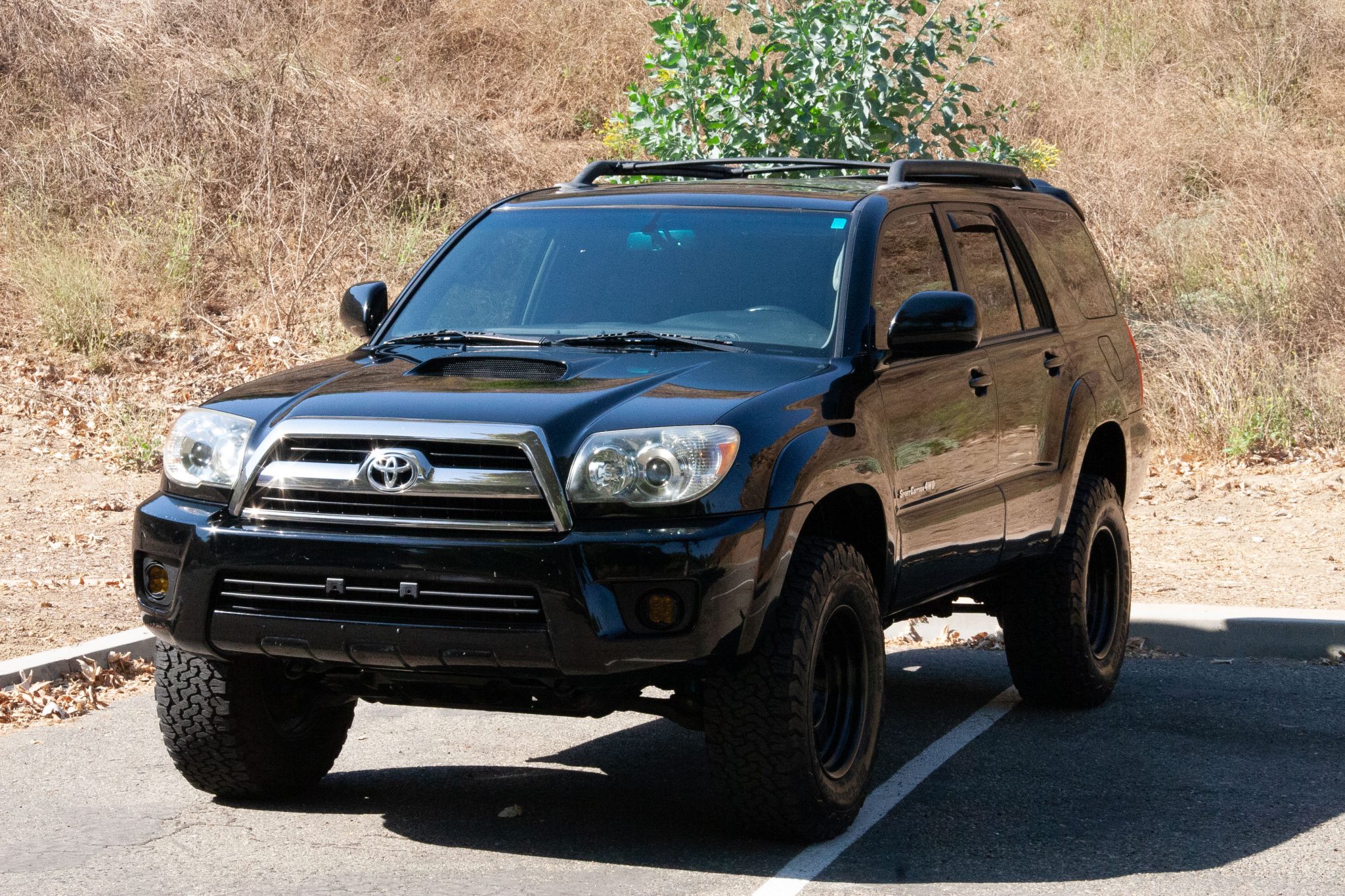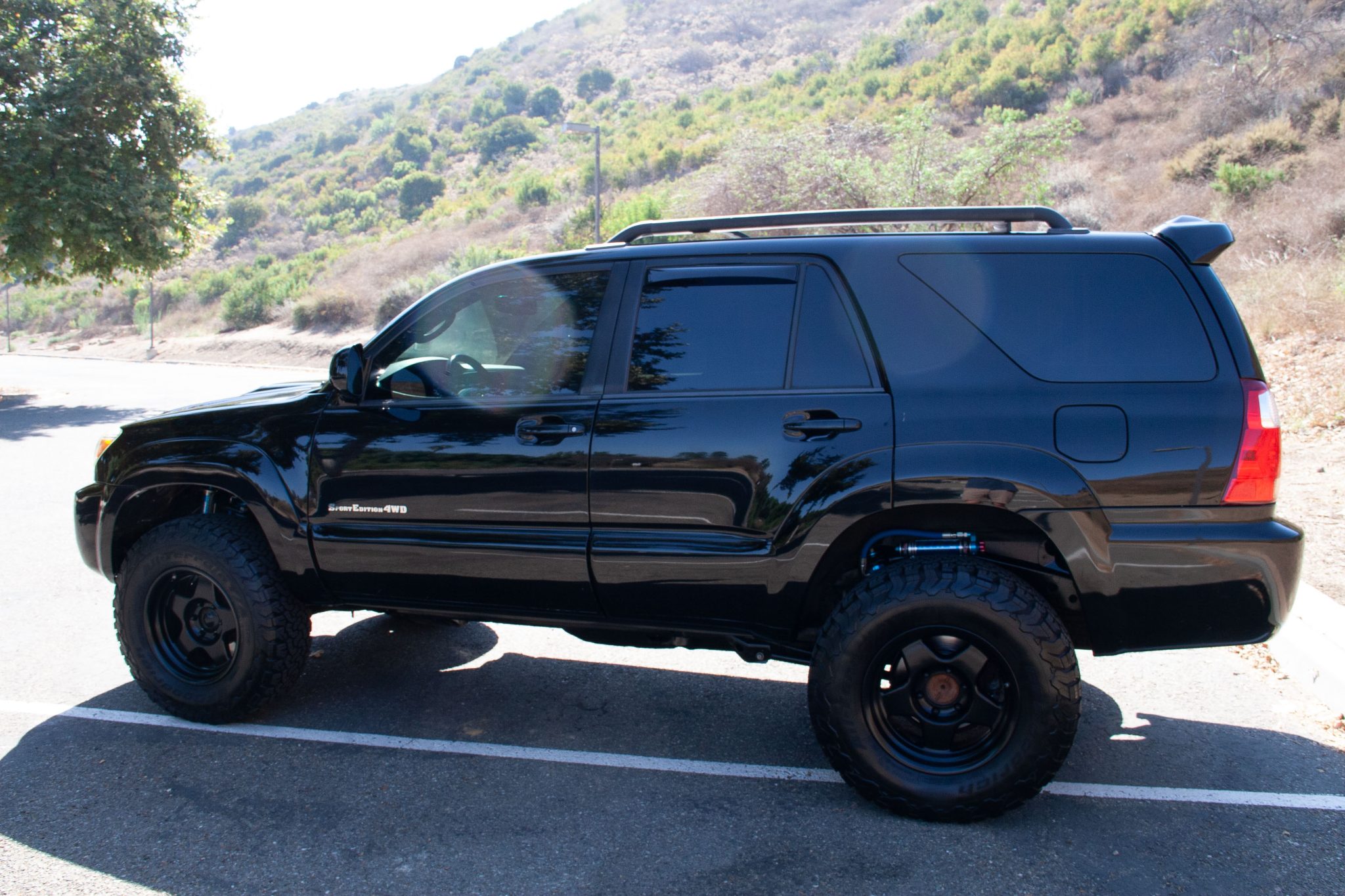 Black 17″ Stealth Custom Series wheels are mounted with BFGoodrich All-Terrain T/A KO2 tires measuring 285/70. The suspension has been fitted with King 2.5 front coilovers and rear shocks with remote reservoirs. Additional noted modifications include SPC control arms, Eibach rear springs, AccuTune Off-Road bump stops, and a Dr KDSS Panhard bar correction kit. Stopping power is provided by four-wheel ventilated disc brakes with ABS, and the brake fluid was flushed in 2024.