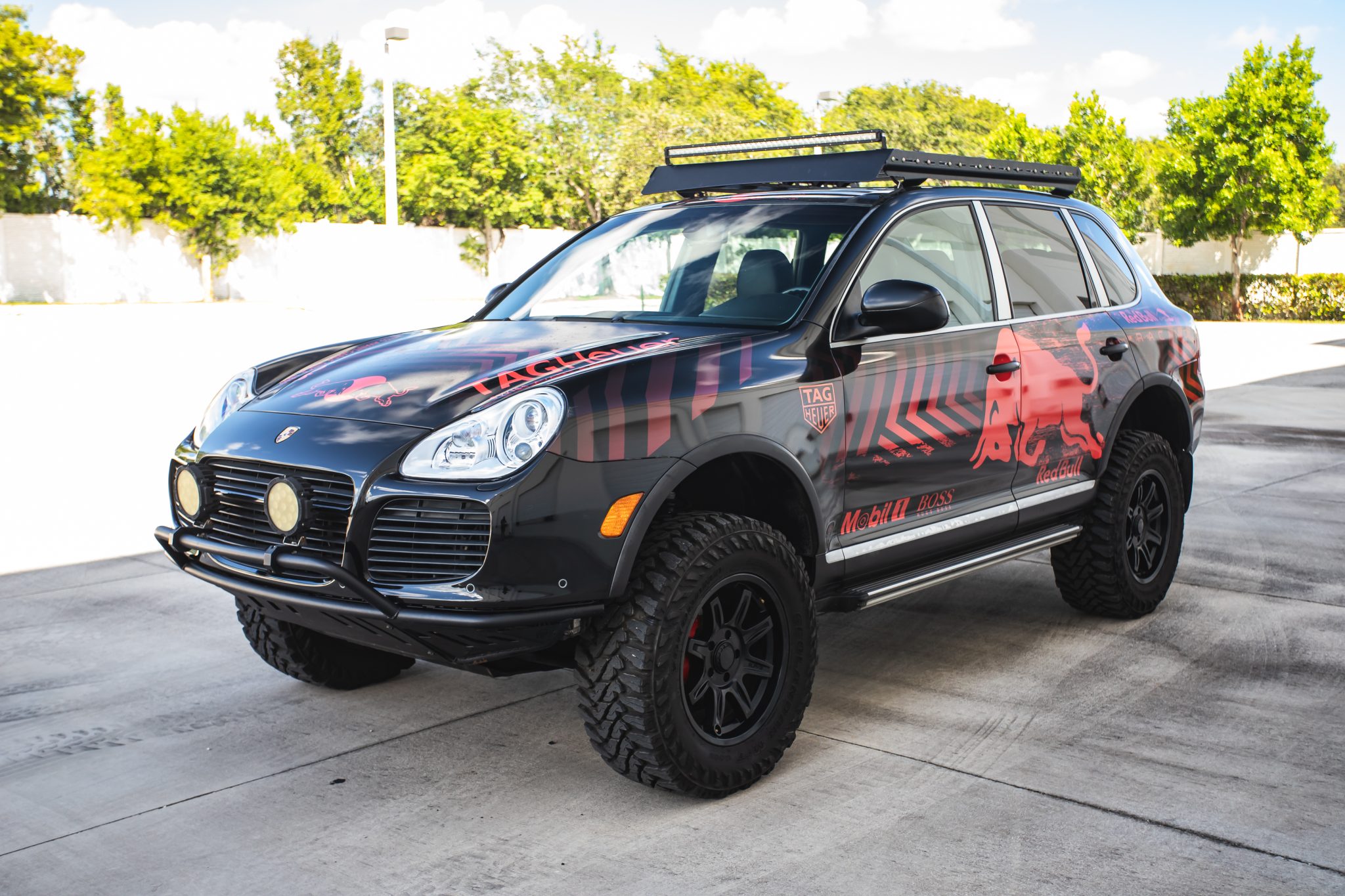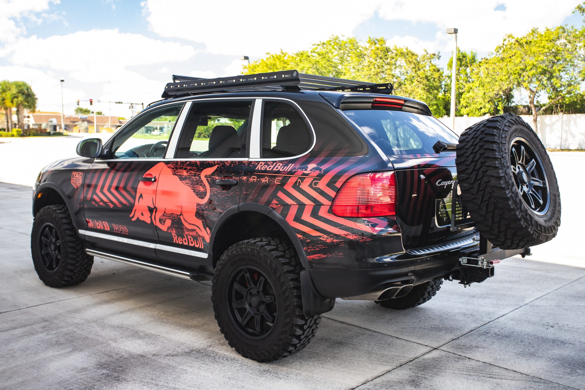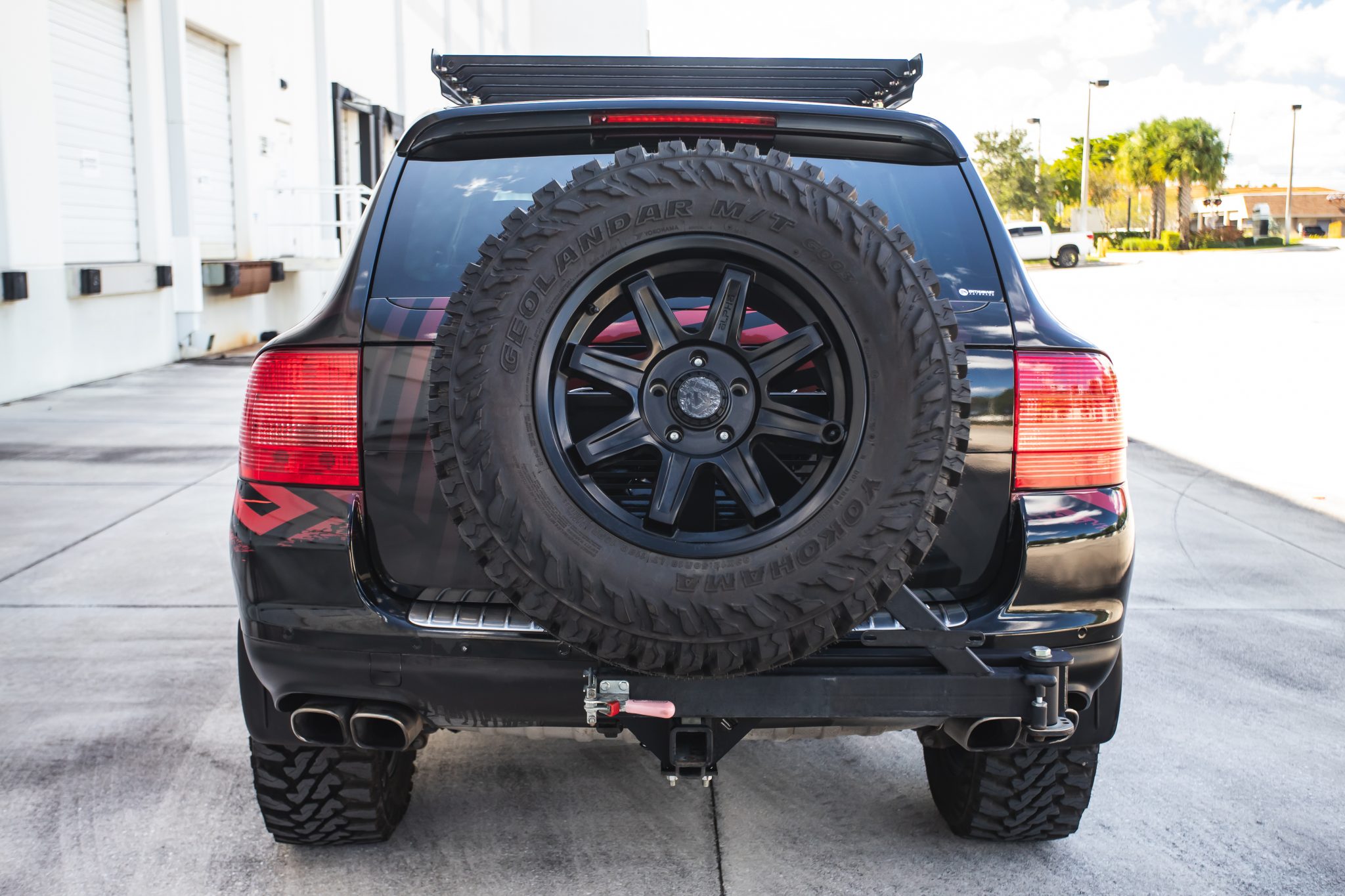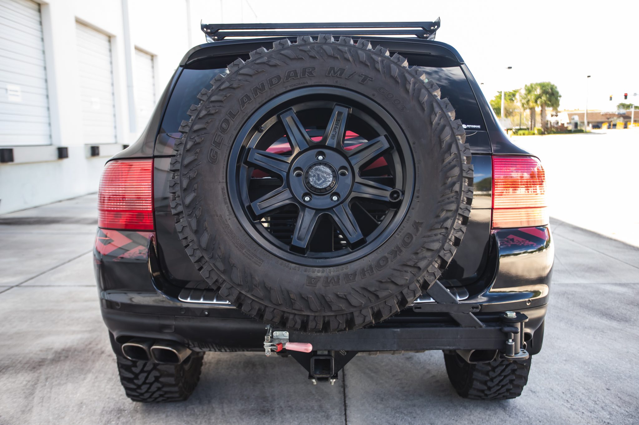 Black-finished 18″ ALPHAequipt Command wheels are mounted with 33×12.5″ Yokohama Geolandar M/T G003 tires, and a matching spare is affixed to a swing-out carrier. The truck is equipped with an air suspension, and stopping power is from red-finished brake calipers over slotted and cross-drilled rotors at each corner. A Eurowise lift kit and a subframe drop kit have been installed. The power steering pump was repaired in November 2023.