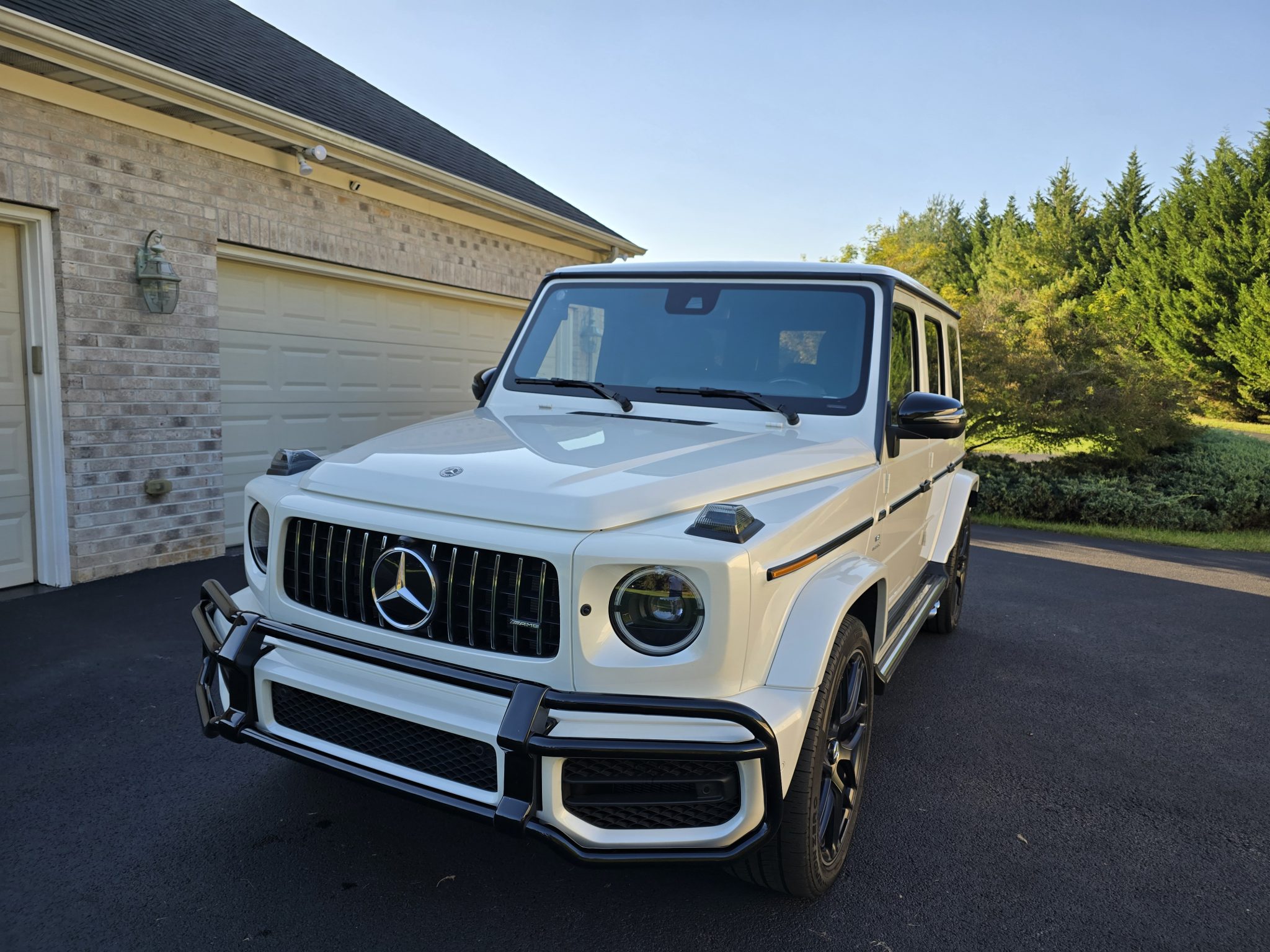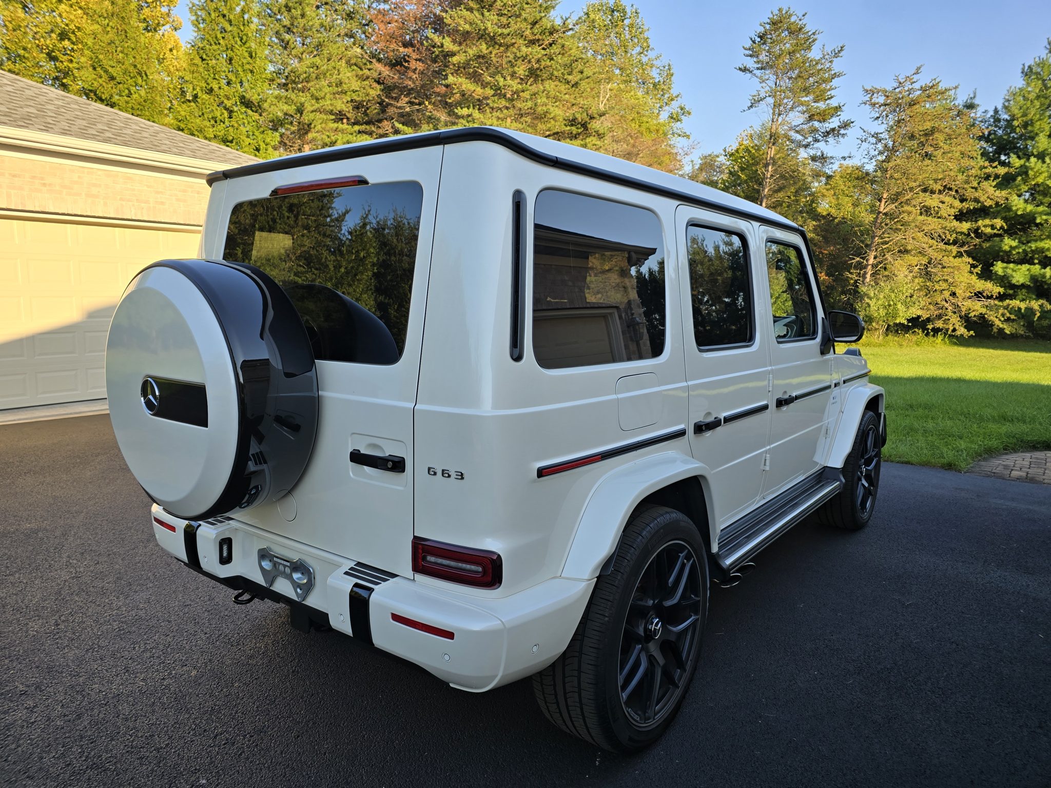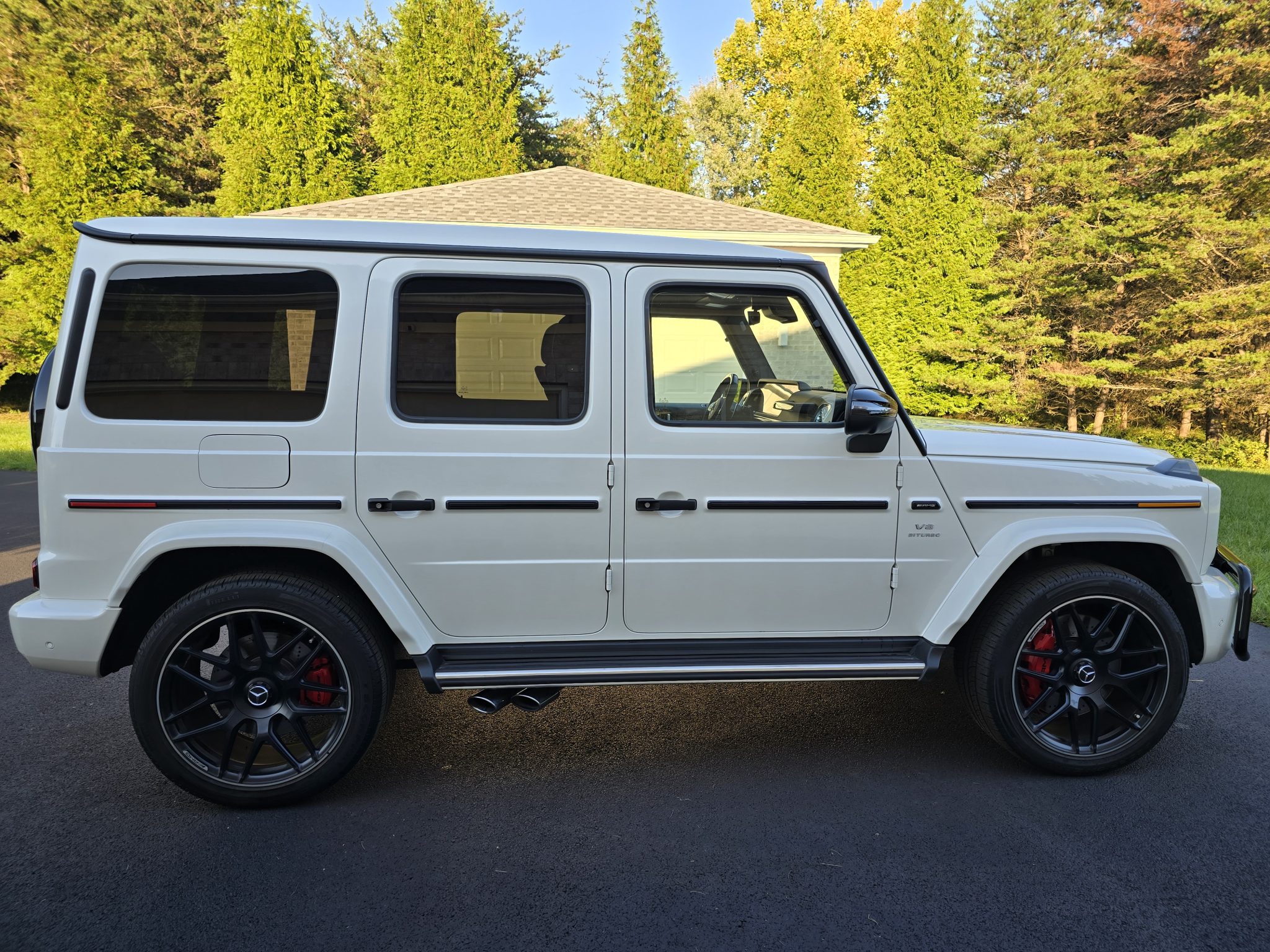 Matte black 22″ AMG forged cross-spoke wheels are mounted with Pirelli Scorpion tires. Braking is provided by red-painted calipers fitted over cross-drilled discs at each corner. The truck came equipped from the factory with AMG Ride Control featuring adaptive damping.