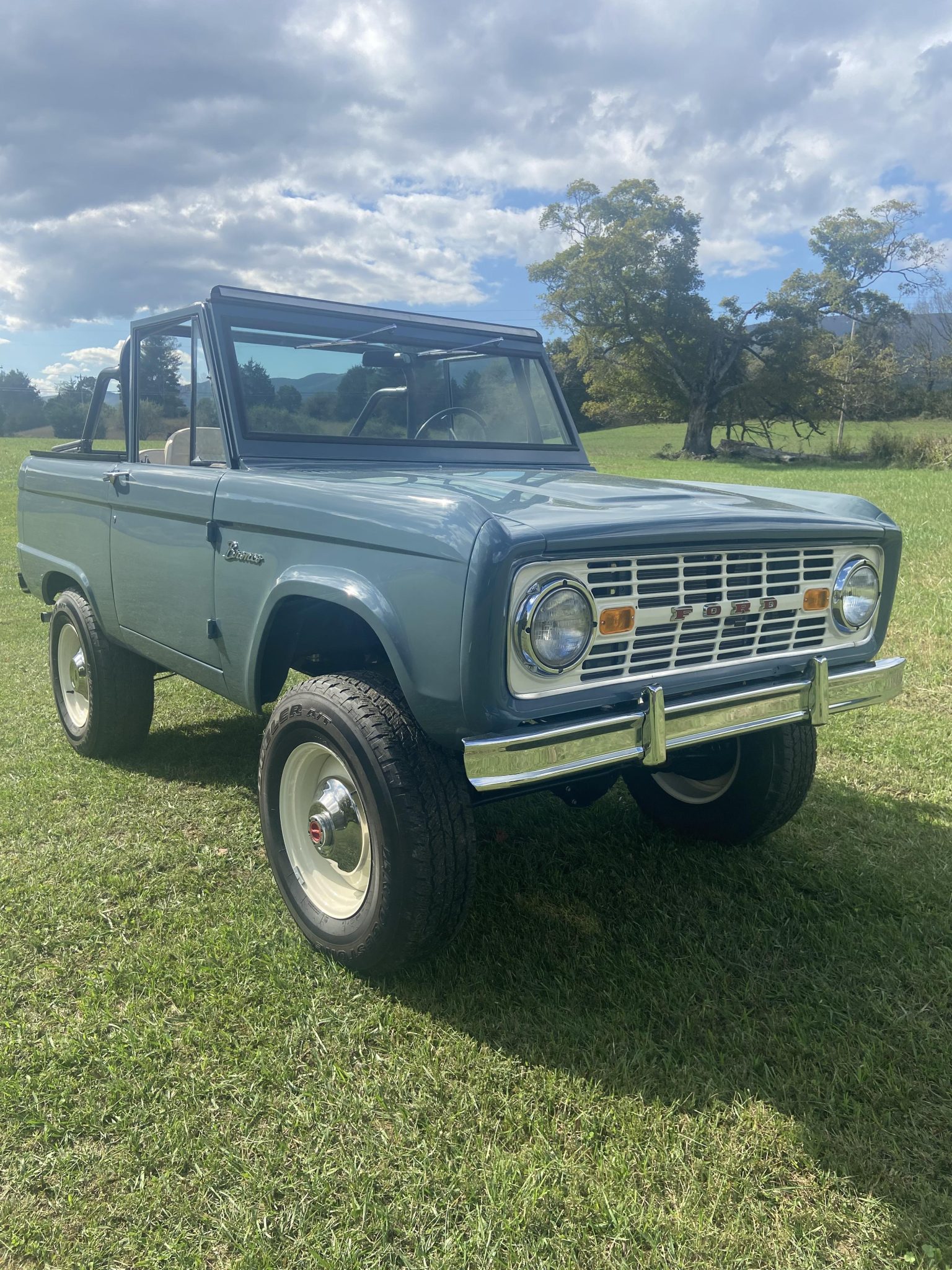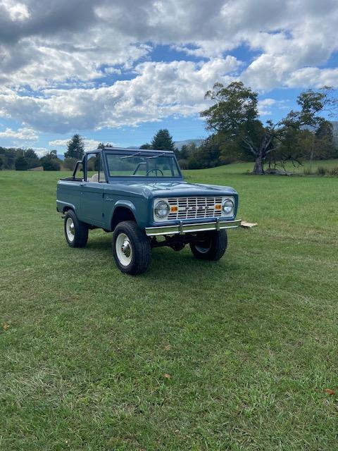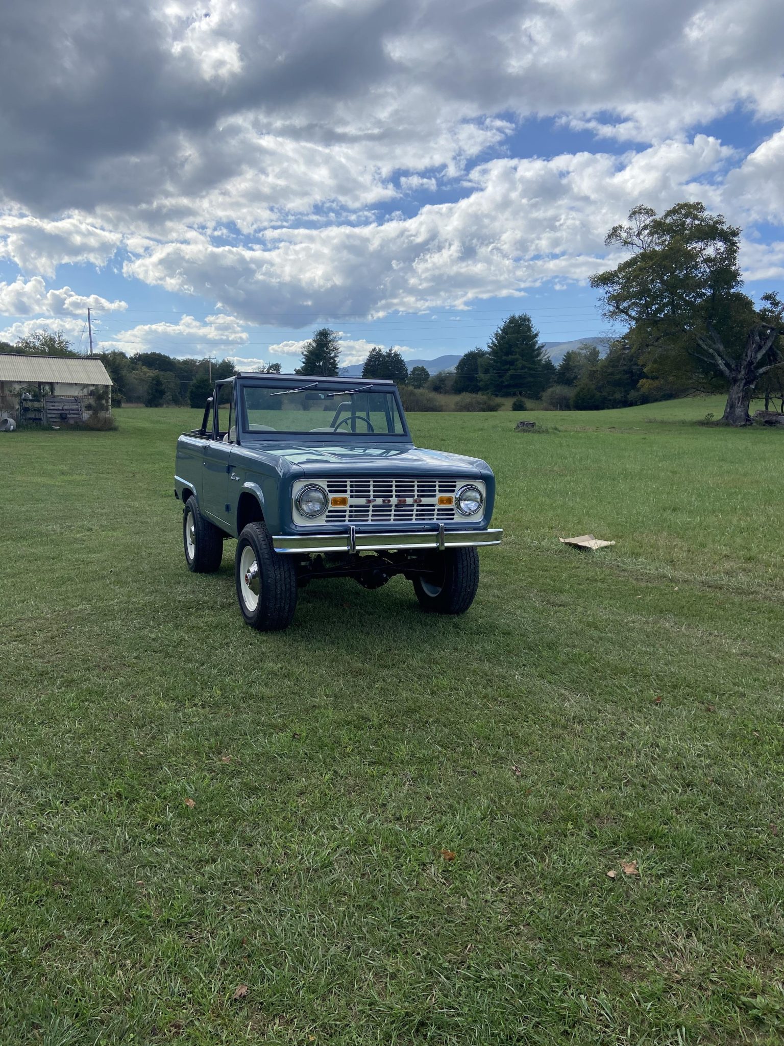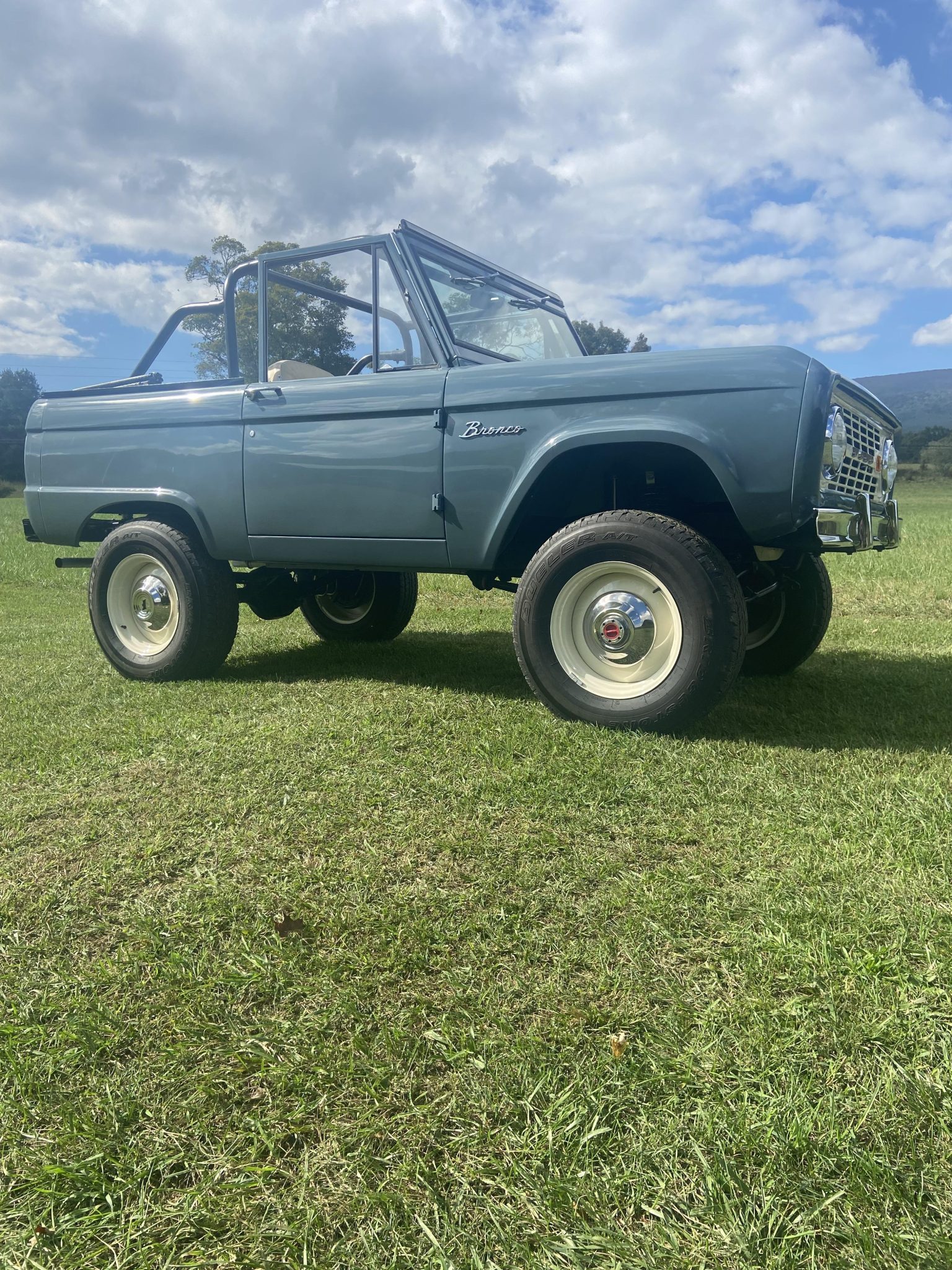 White-finished 17″ steel wheels are mounted with 255/75 Bridgestone Dueler A/T tires. The truck is equipped with manually locking front hubs, a revised Pitman arm, and a lifted suspension with James Duff shocks and coil springs. Stopping power is handled by Ford front disc and rear drum brakes.