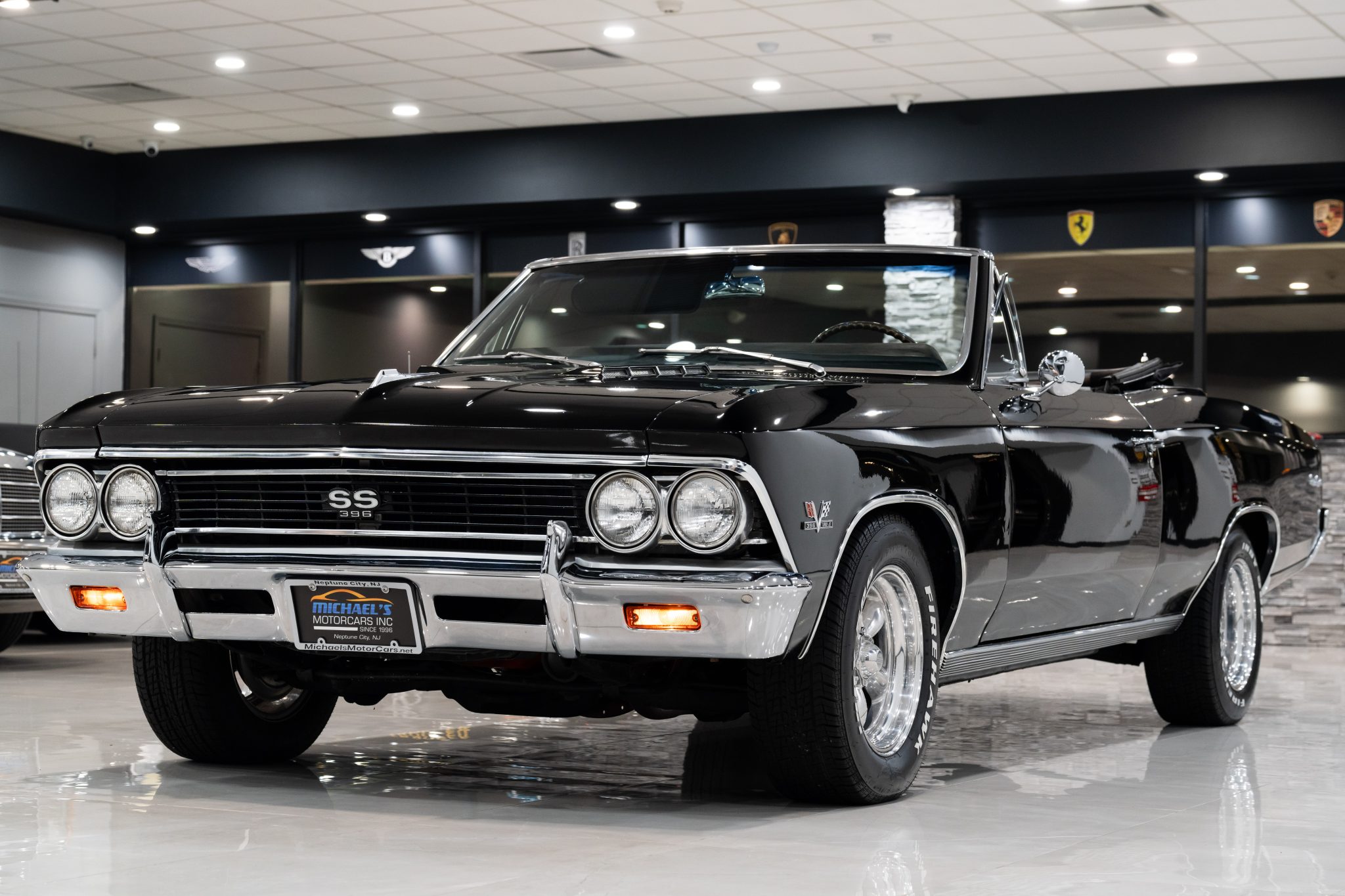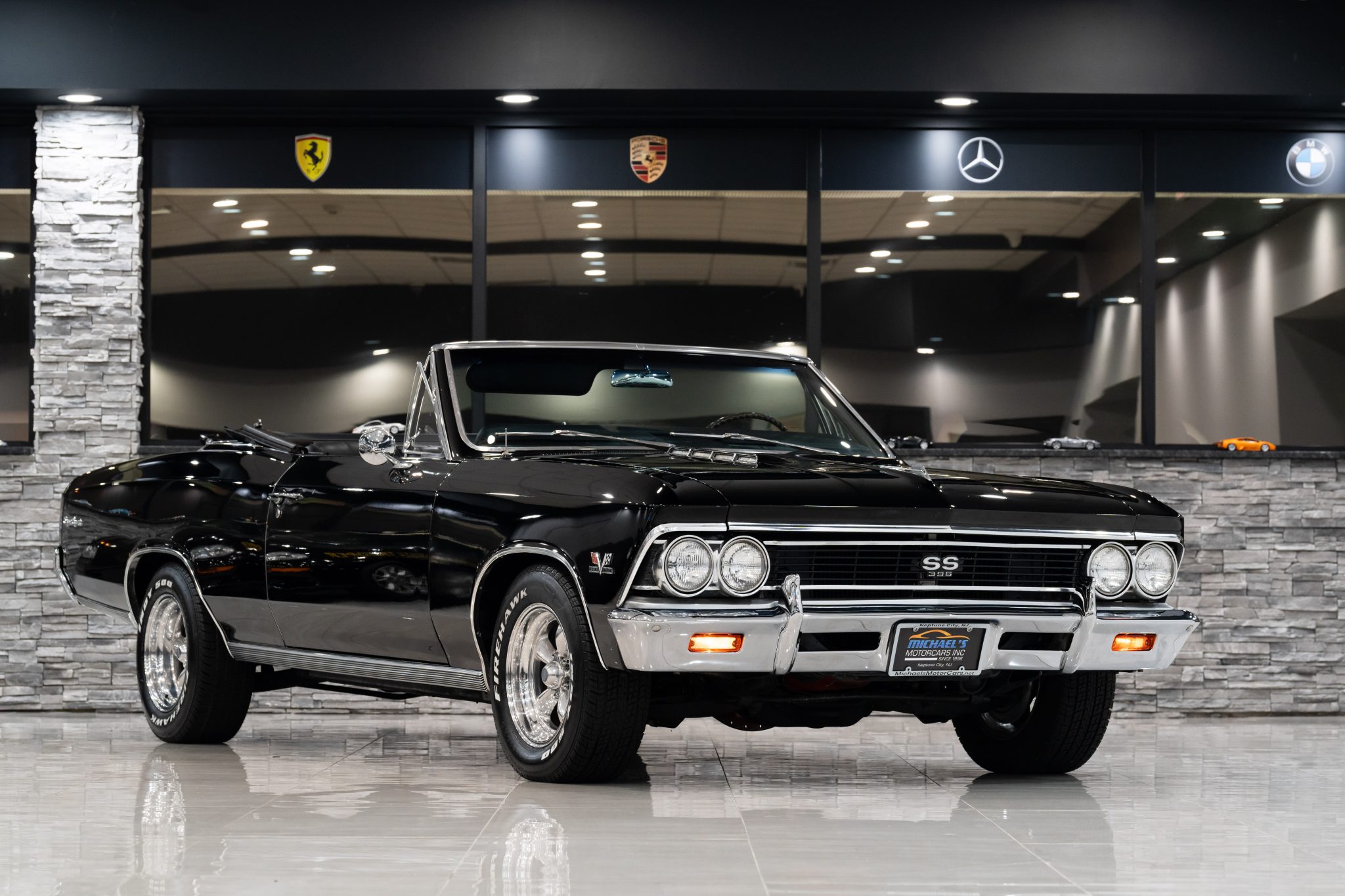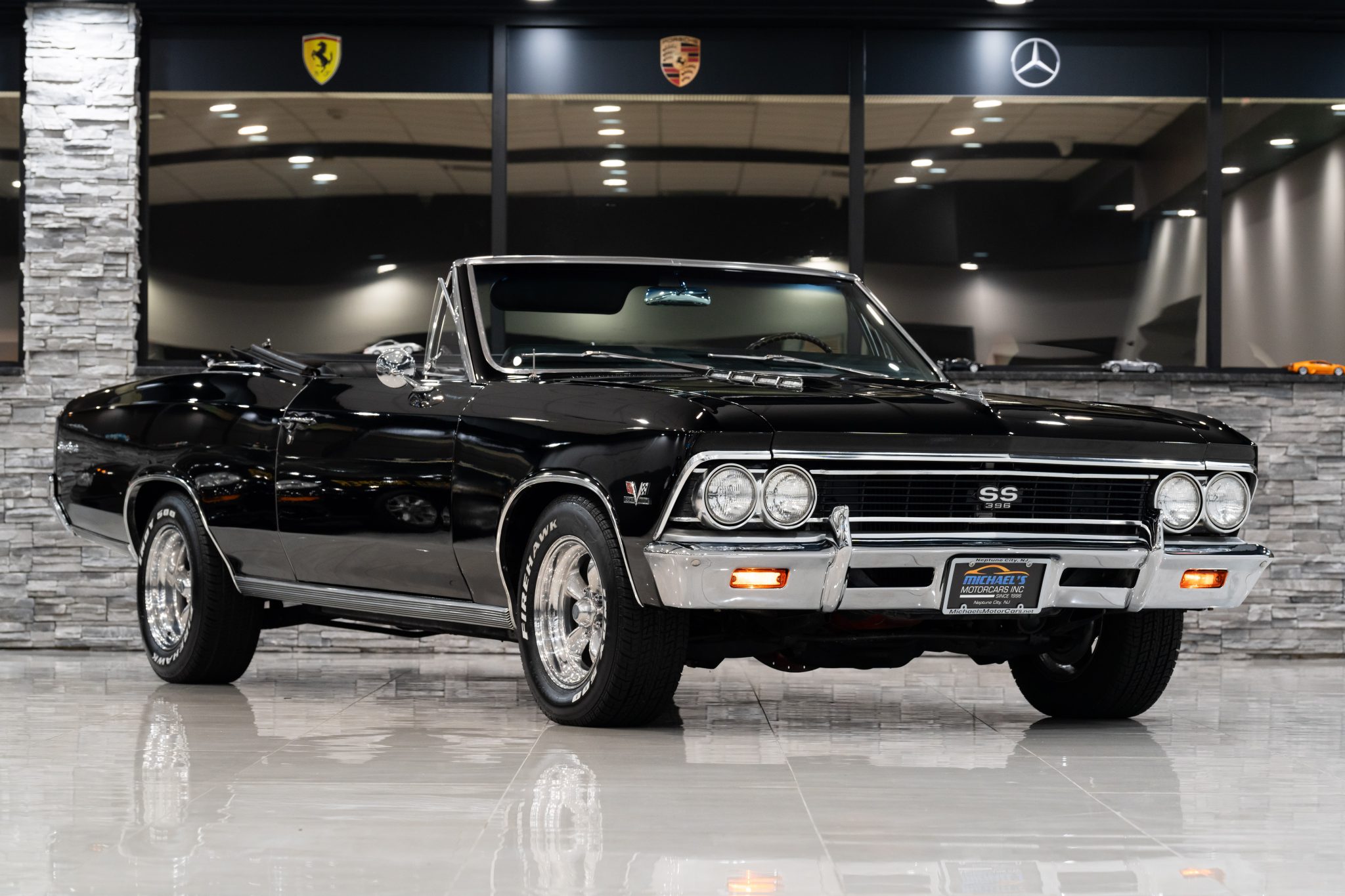 American Racing 15″ five-spoke wheels are mounted with Firestone Firehawk Indy 500 tires. The car is equipped with power steering as well as a front and rear coil-spring suspension, and stopping power is provided by front disc and rear drum brakes.