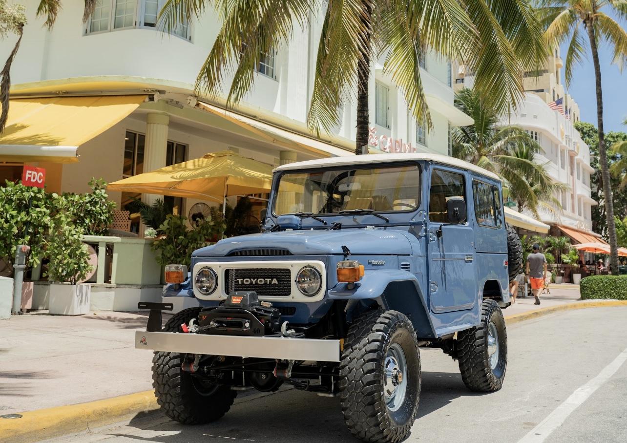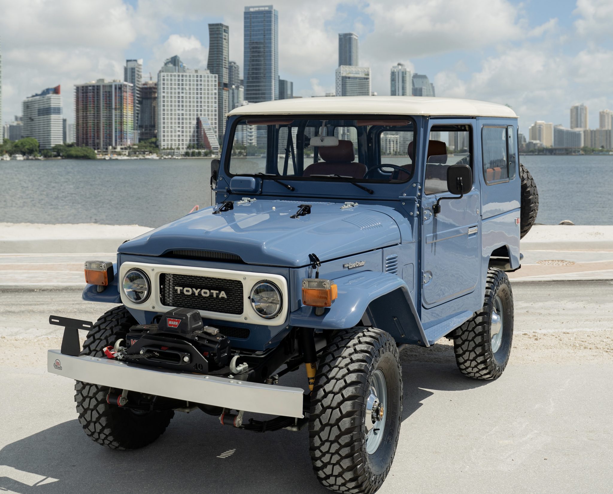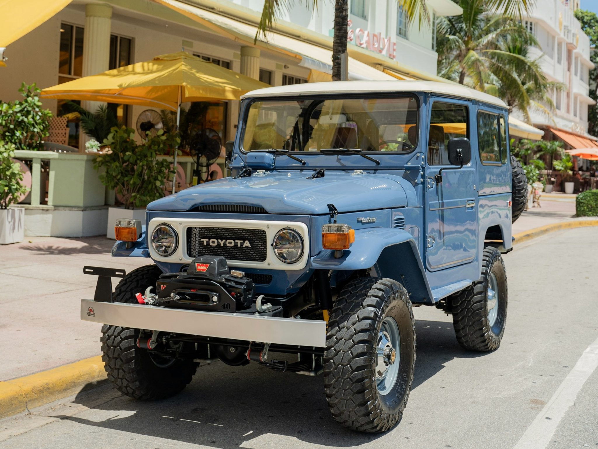 The 15″ steel wheels with polished hubcaps are mounted with 33×12.5″ Nereus NS523 M/T tires, and a matching spare is affixed to the swing-away tire carrier. The truck is equipped with manually locking front hubs, power steering, and an Old Man Emu steering stabilizer and shock absorbers. The front disc and rear drum brakes were overhauled and the master cylinder and booster were replaced under current ownership.