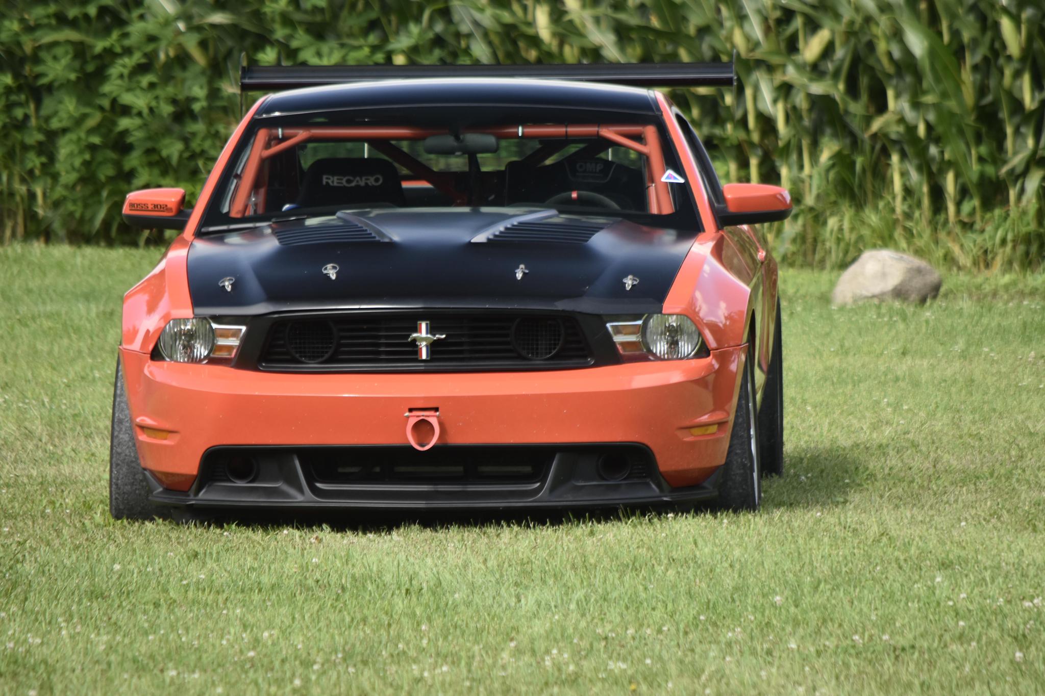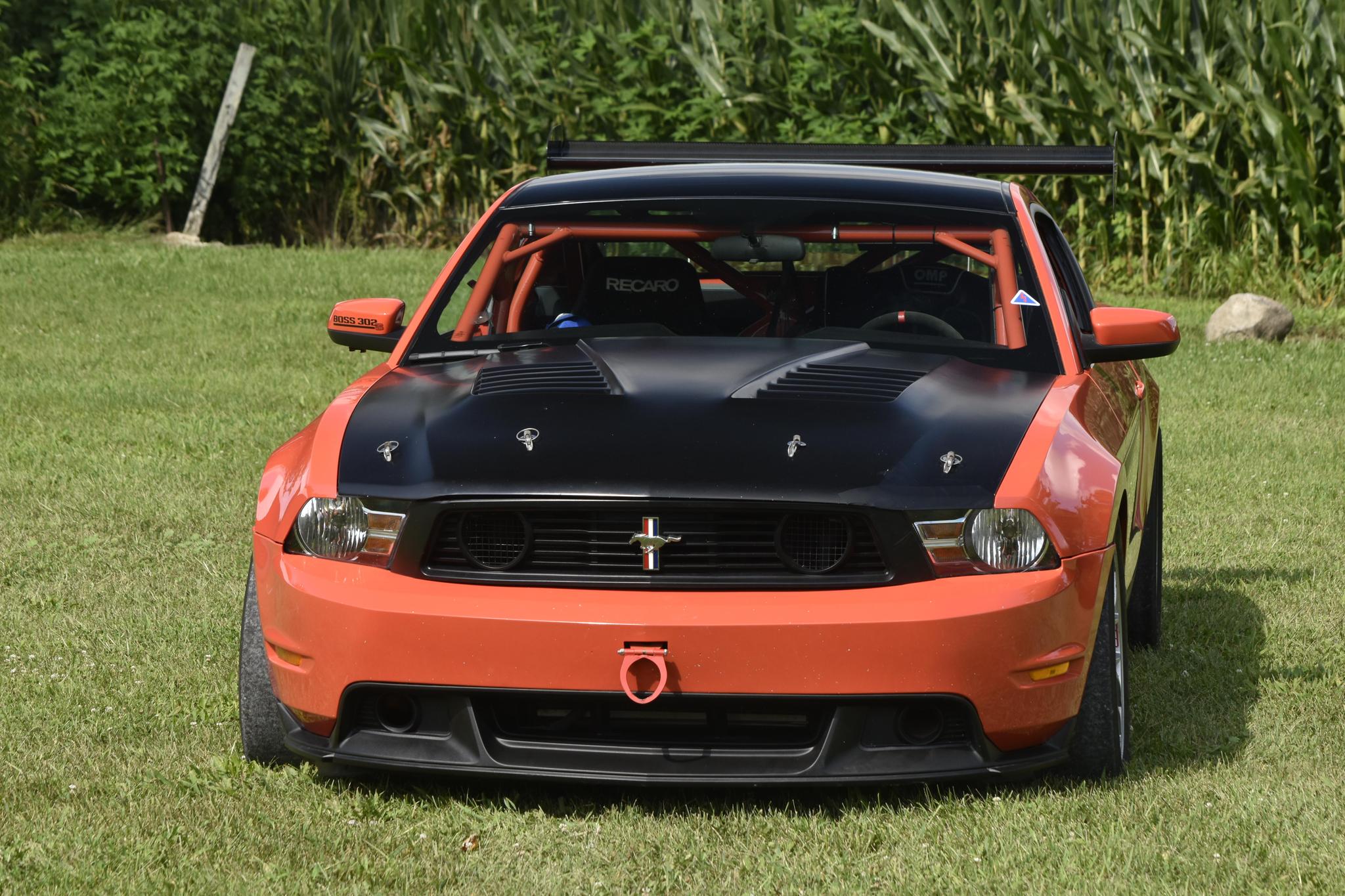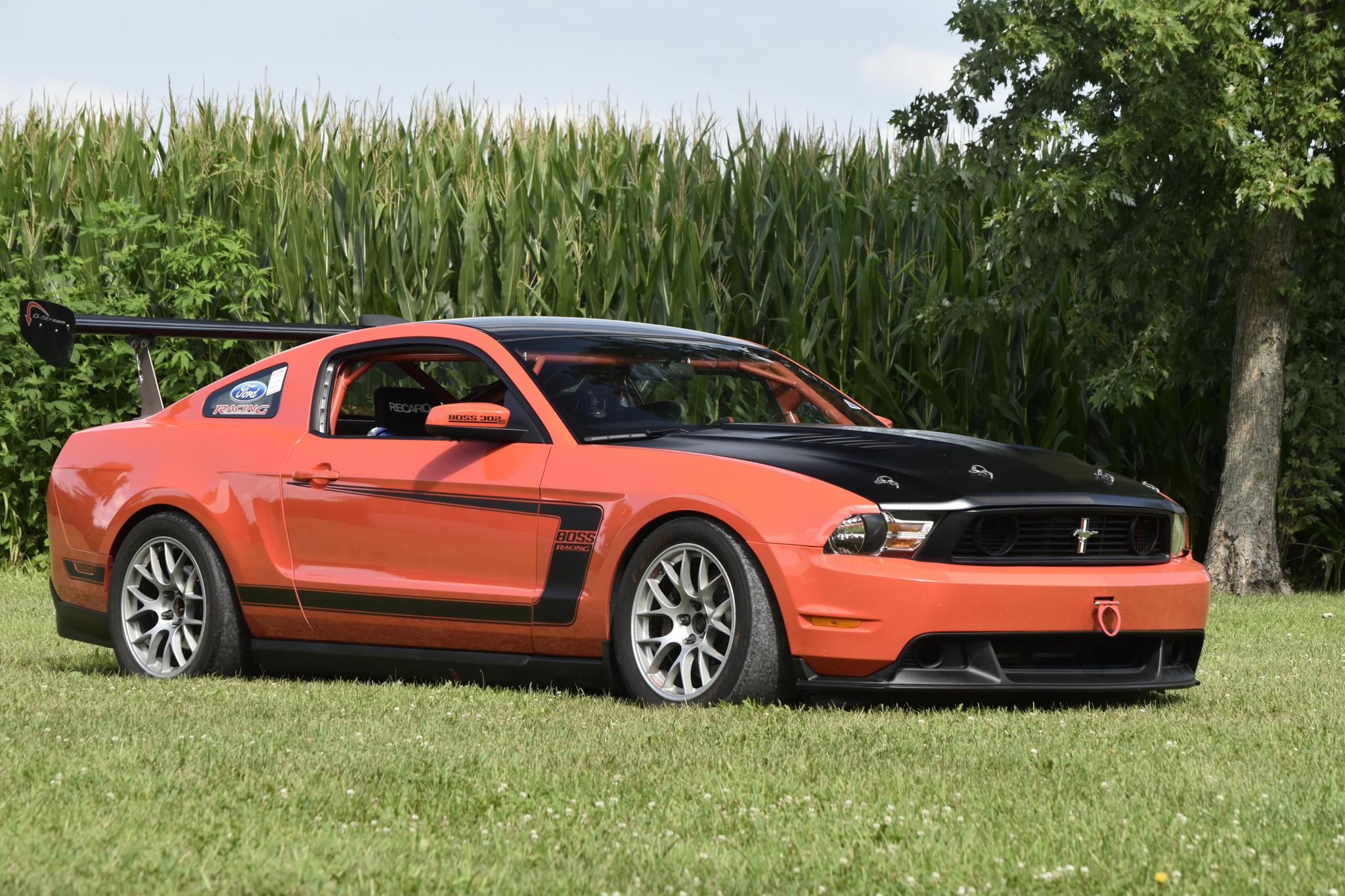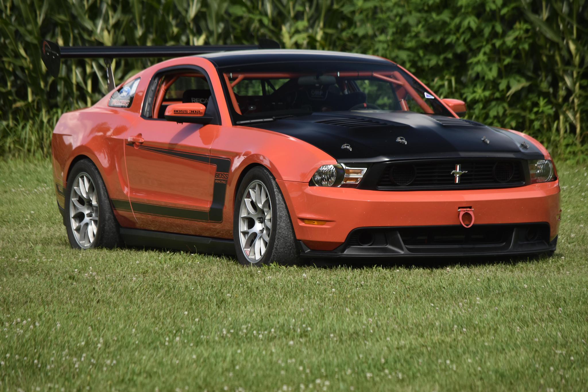 Silver 18″ BBS alloy wheels are mounted with 305/680 Pirelli P-Zero tires up front, and 300/680 Hankook Ventus tires out back. The braking system features four-piston Brembo calipers and two-piece slotted rotors up front, and Boss 302S-specific equipment includes carbon-fiber brake cooling ducts and a Ford Racing track-oriented antilock brake system. The car is equipped with adjustable remote-reservoir coilovers and a Ford Racing adjustable panhard bar and anti-sway bars.