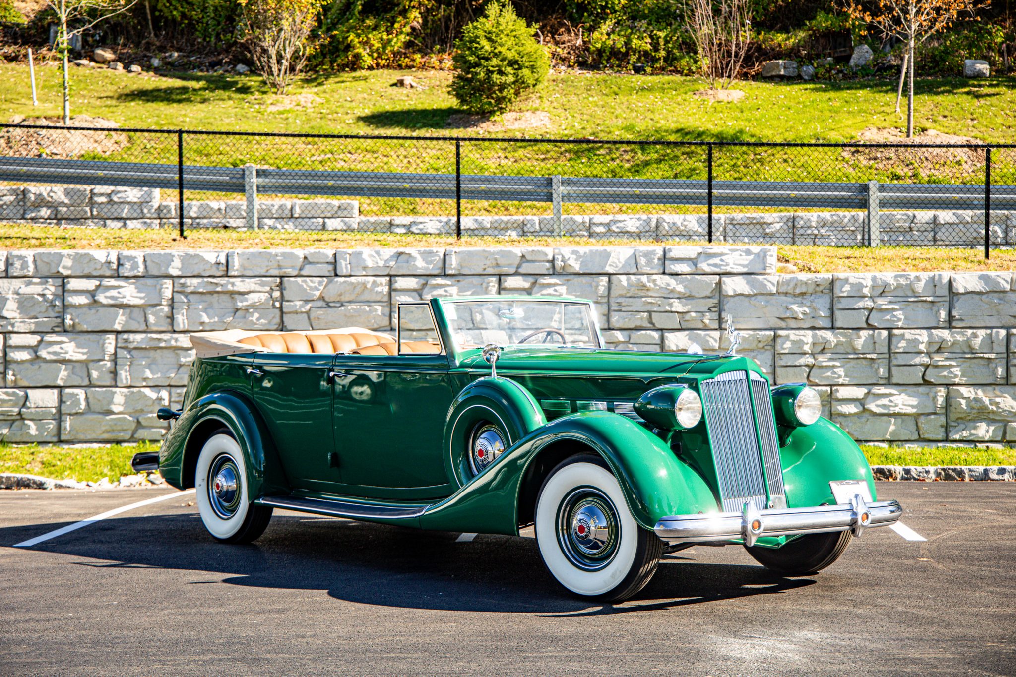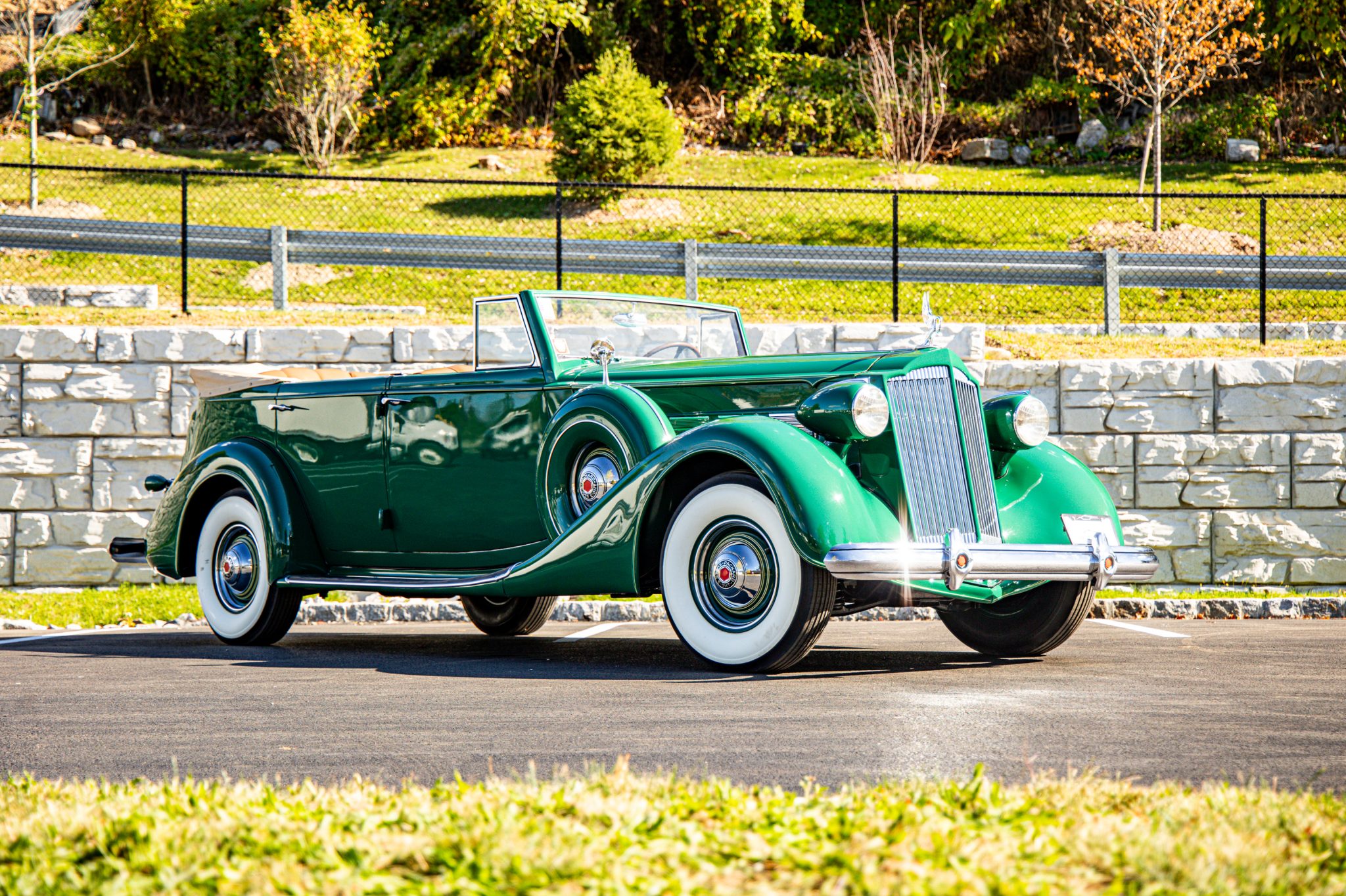 The body wears an older repaint in green with straw yellow coachlining and features a beige convertible top that can be stowed under a matching boot. Features include forward-hinged doors, a body-color radiator shell, thermostatically controlled grille shutters, a cormorant radiator mascot, an integrated trunk, and a fold-down rear luggage rack.
