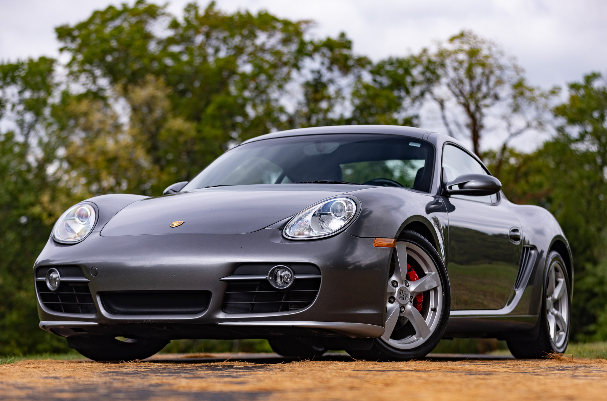 The 18” Cayman S wheels are mounted with Hankook Ventus V12 Evo 2 tires. The front tires were replaced in preparation for the sale. The car is equipped with Porsche Stability Management, and braking is handled by red four-piston Porsche-branded calipers over cross-drilled rotors.