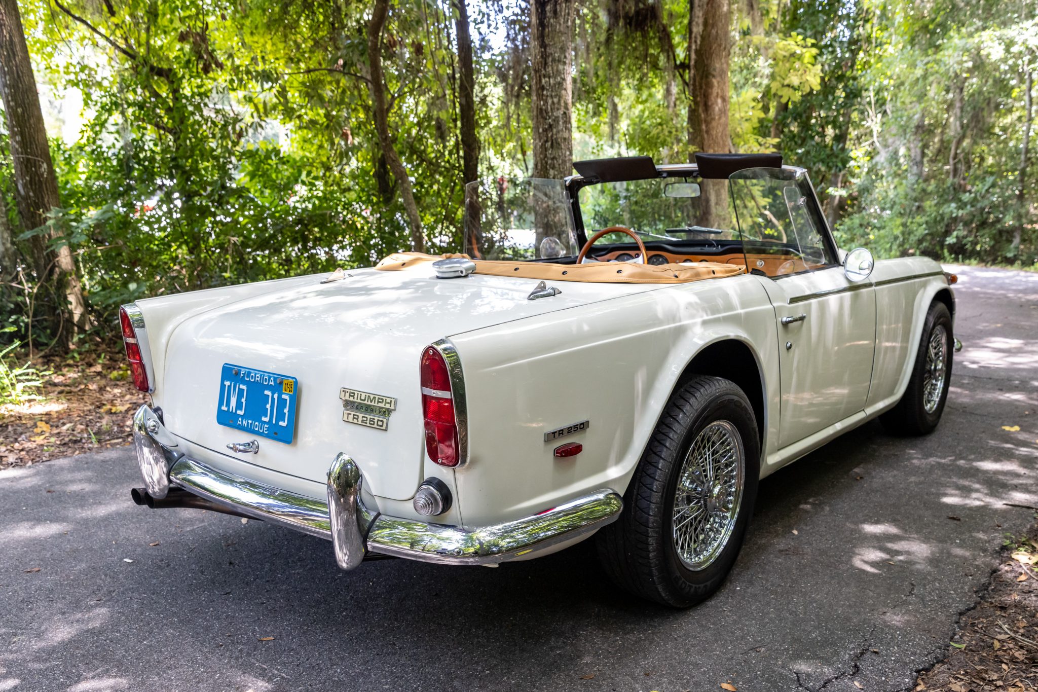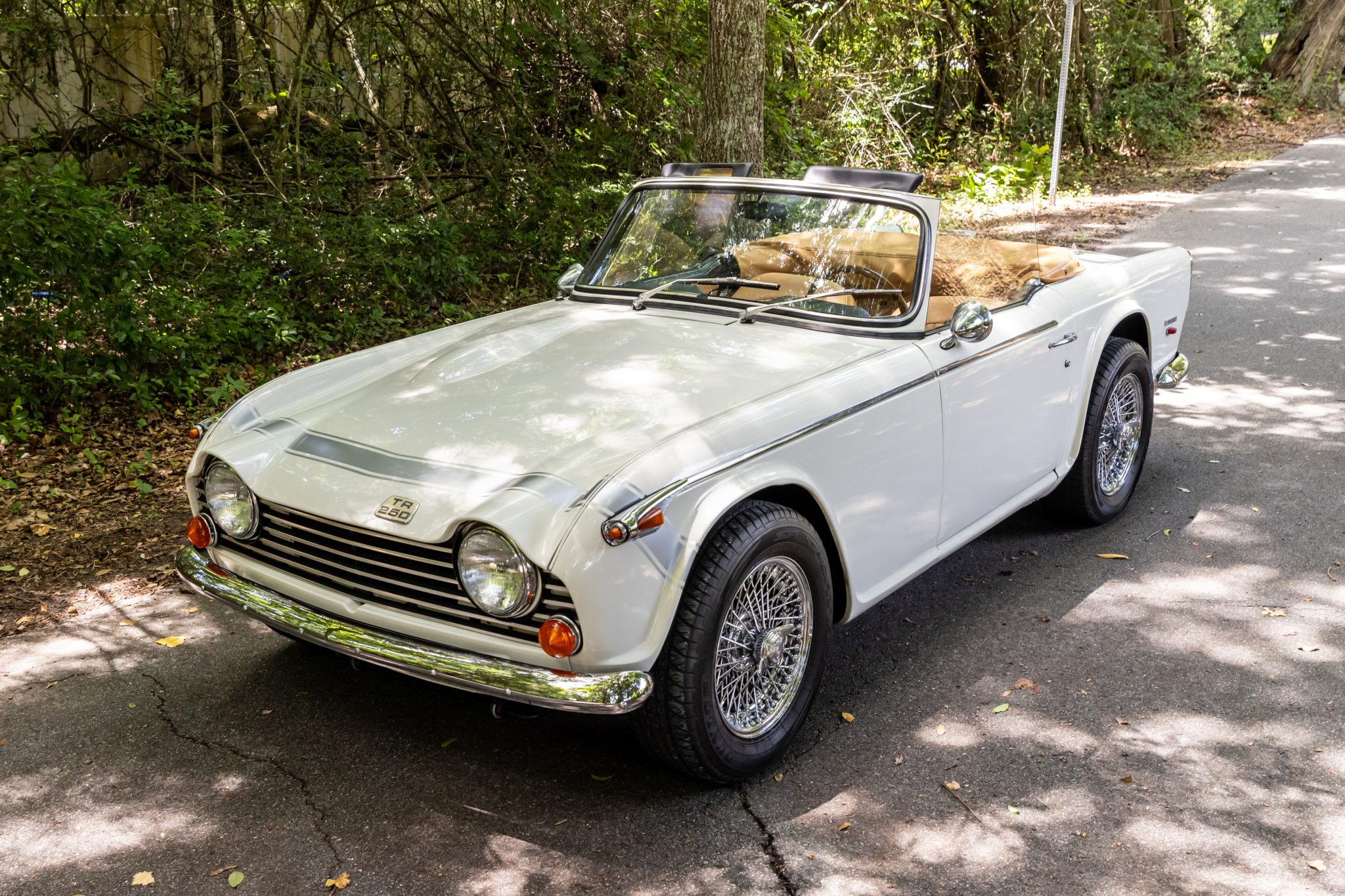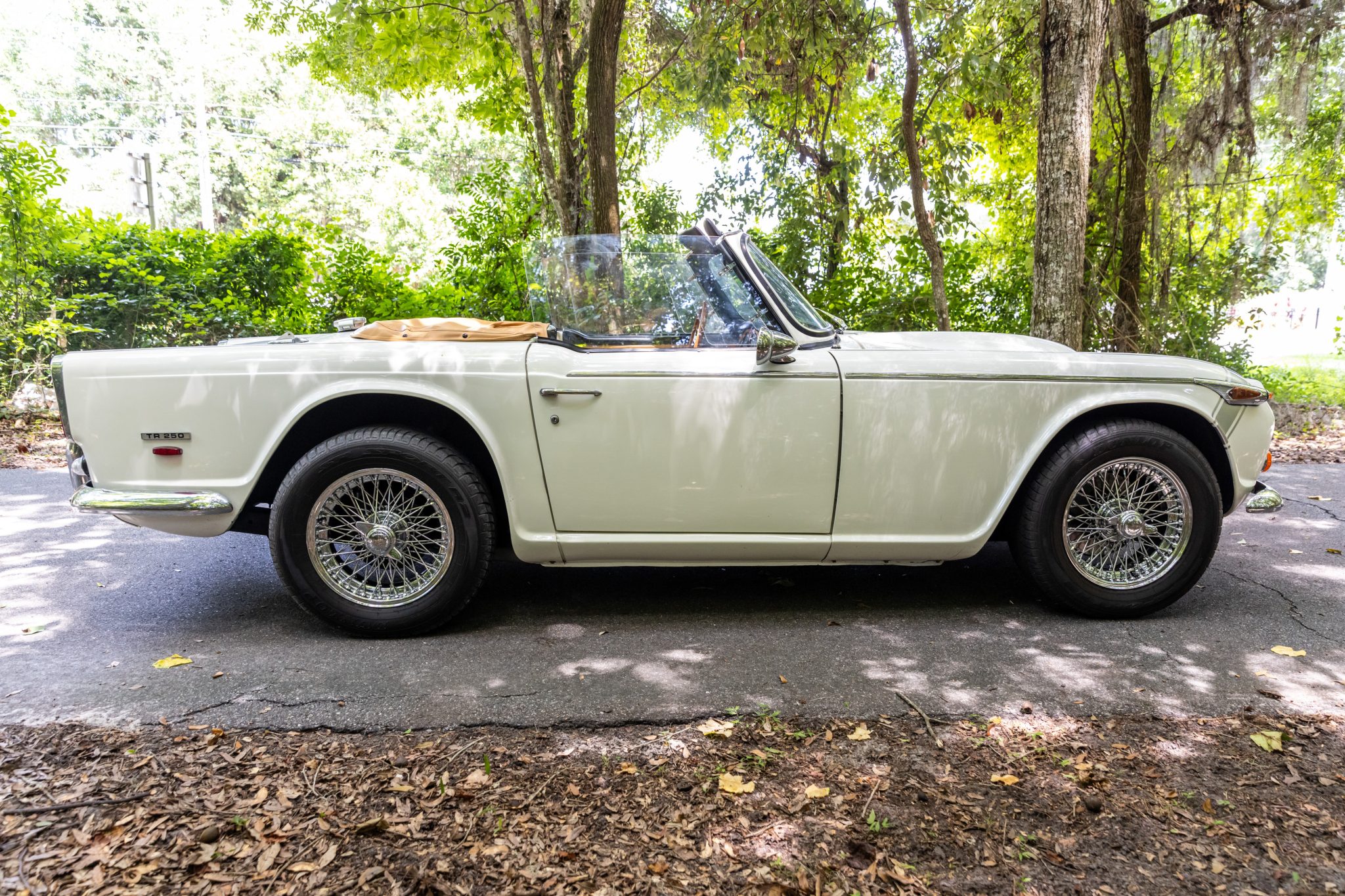 Chrome-finished 15″ Dayton wire wheels are secured with two-eared knock-off hubs and wear 205/65 Dunlop SP Sport A2 tires. A full-size spare is located in the trunk. An independent suspension was fitted from the factory, and a front sway bar sourced from a TR6 has been installed. Braking is provided by front discs and rear drums.