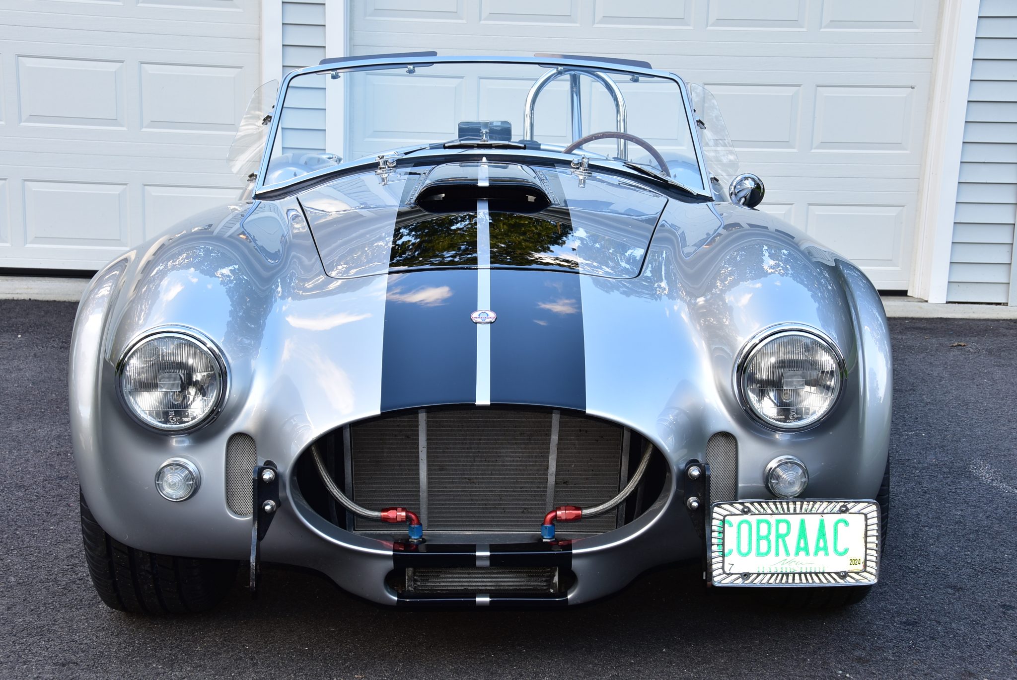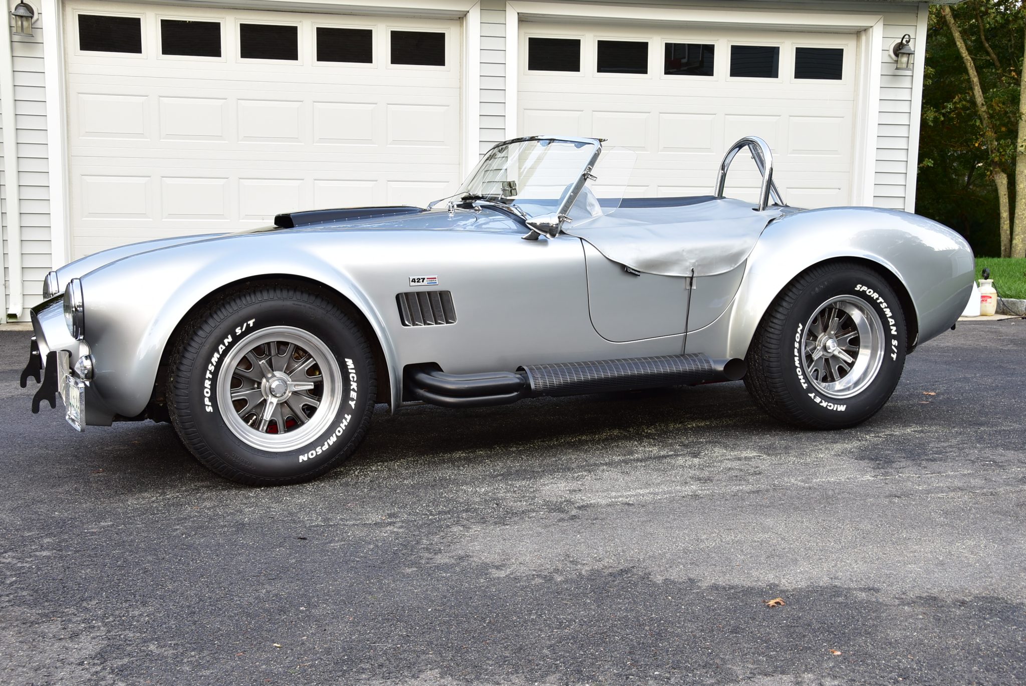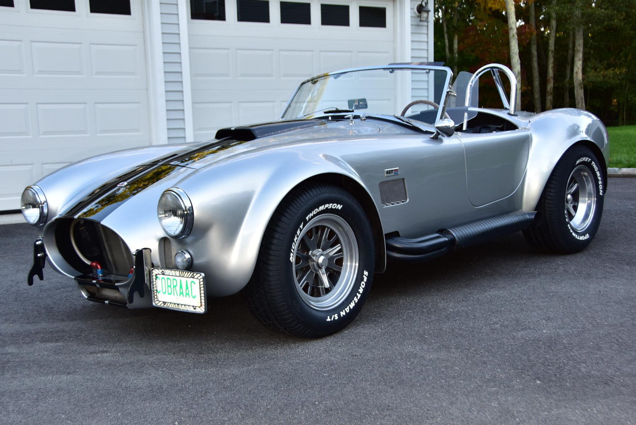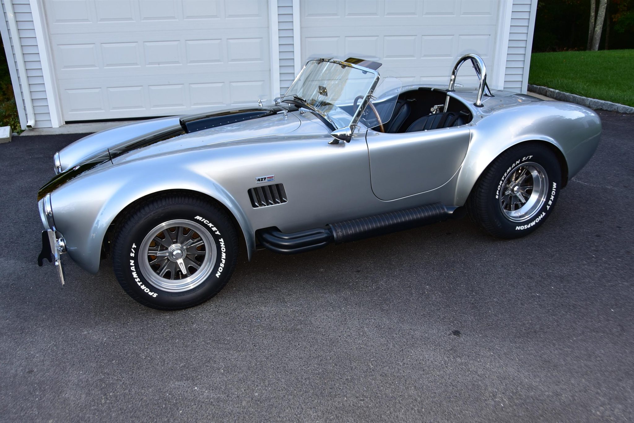 Halibrand-style 15” wheels are secured with safety-wired knock-off spinners and are mounted with 255/60 front and 275/60 rear Mikey Thompson Sportsman S/T tires that are said to have been installed in preparation for the sale. Cobra Valley R/T-AFR sway bars have been fitted, along with adjustable struts. Stopping power is provided by four-wheel disc brakes.
