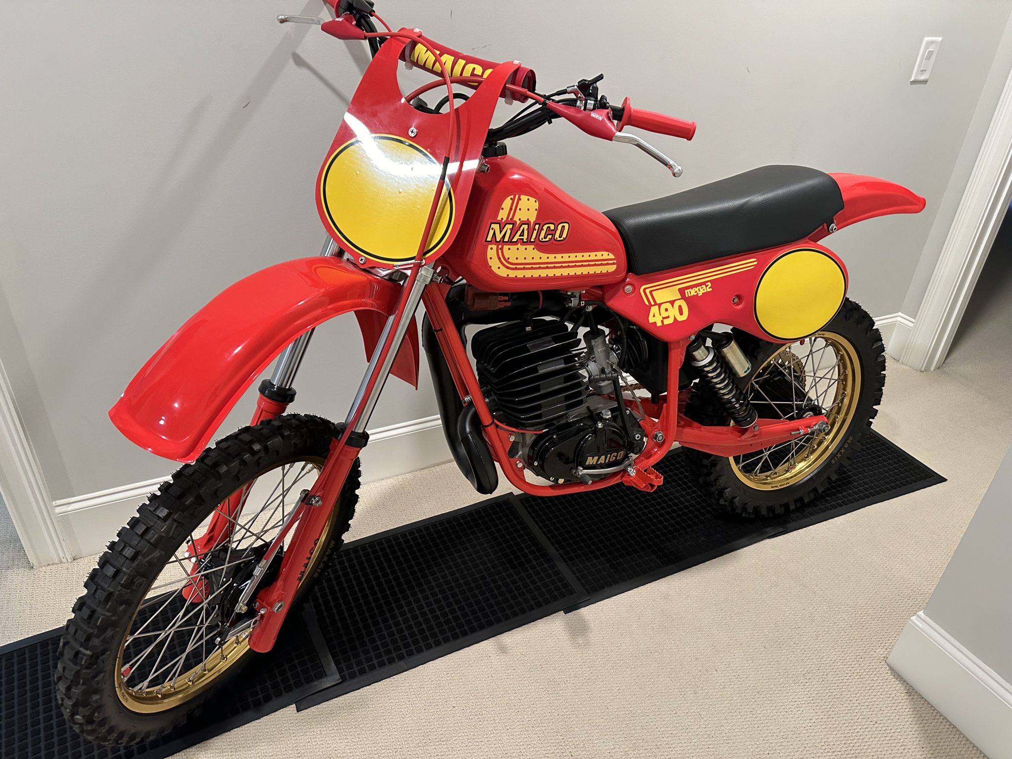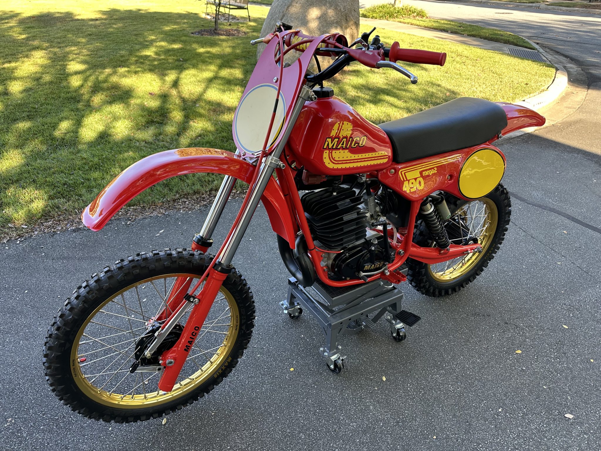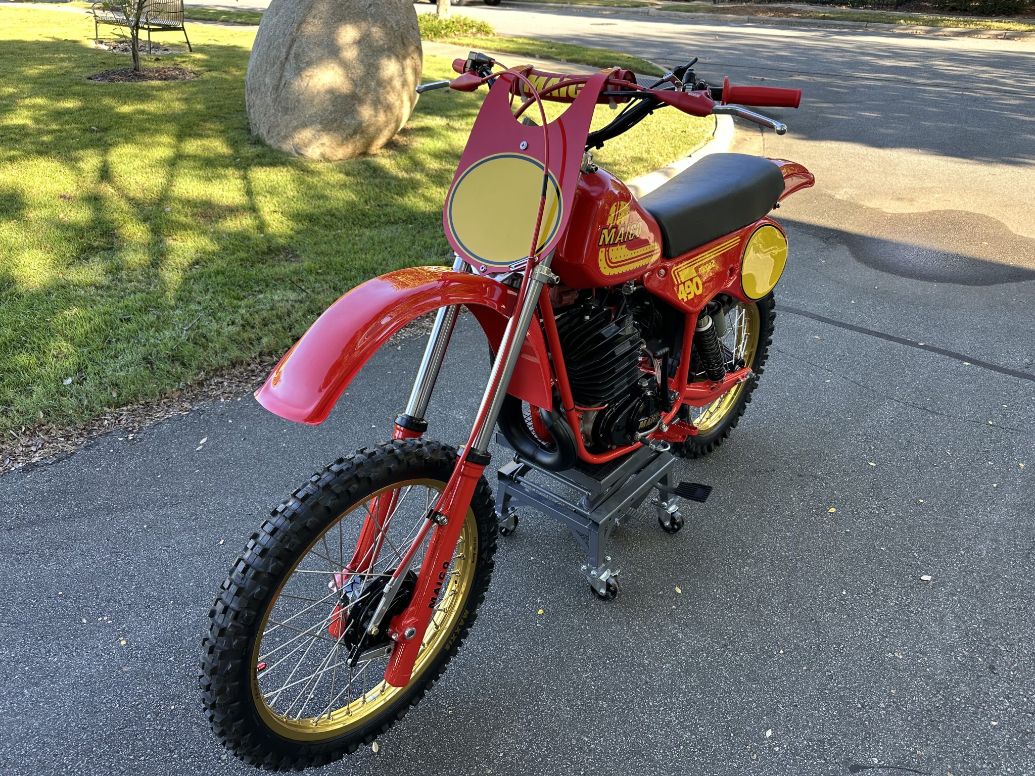 Gold-finished 21″ front and 18″ rear alloy rims are laced to drum-brake hubs and wear Maxxis knobby tires. Suspension consists of a conventional leading-axle fork with red-finished lowers as well as dual piggyback shocks mounted to the swingarm.